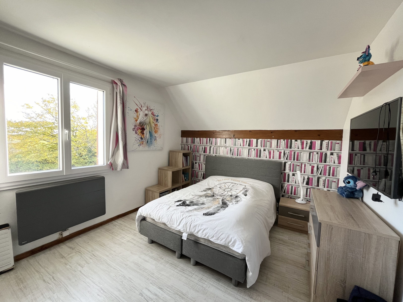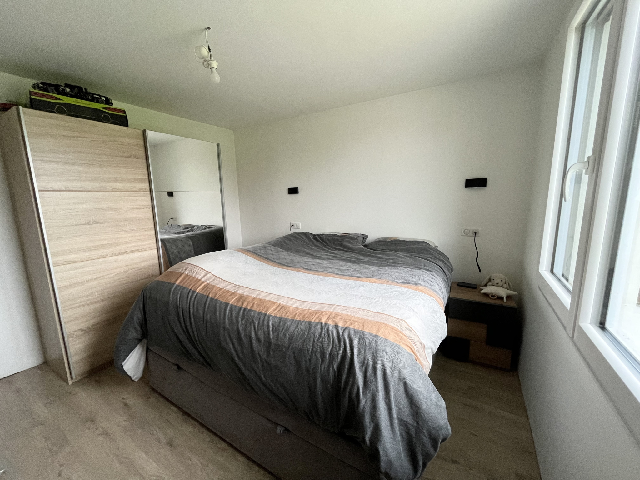 A l'étage le palier pouvant faire office de bureau dessert 2 chambre spacieuses et une plus petite ( - de 9 mètres carrés à hauteur d'homme ).