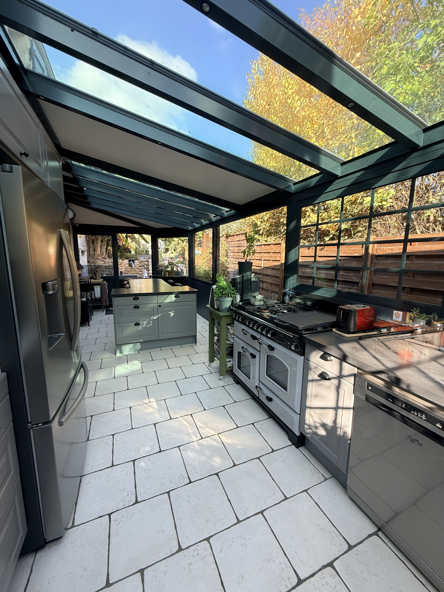 une cuisine aménagée et équipée installée dans une véranda lumineuse,