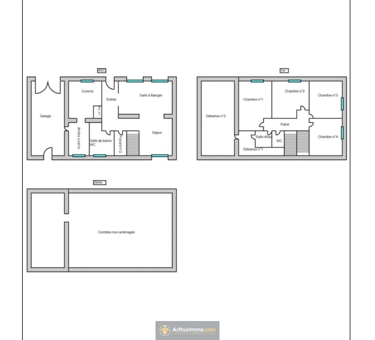 À l'étage : 4 Chambres - Salle d'eau - WC séparés - Combles aménageables.