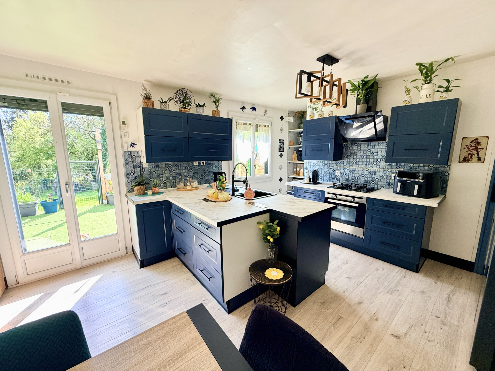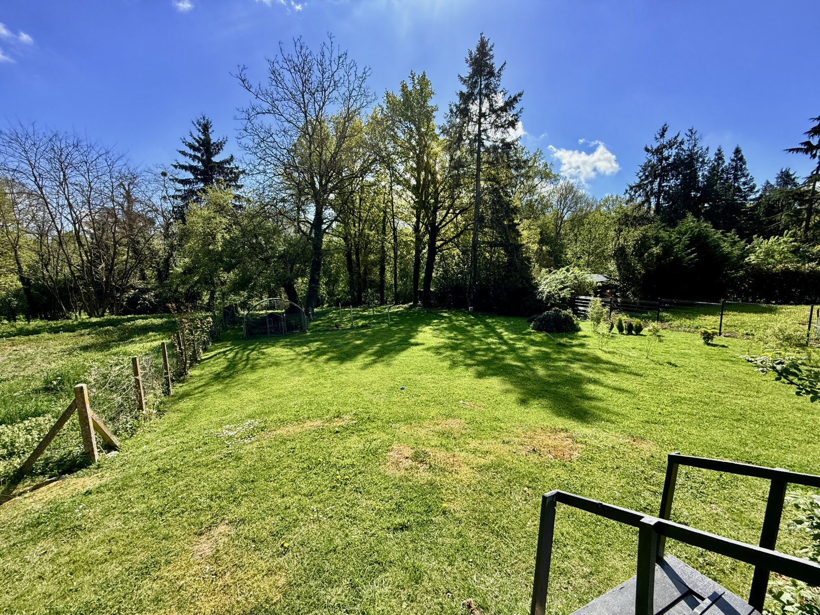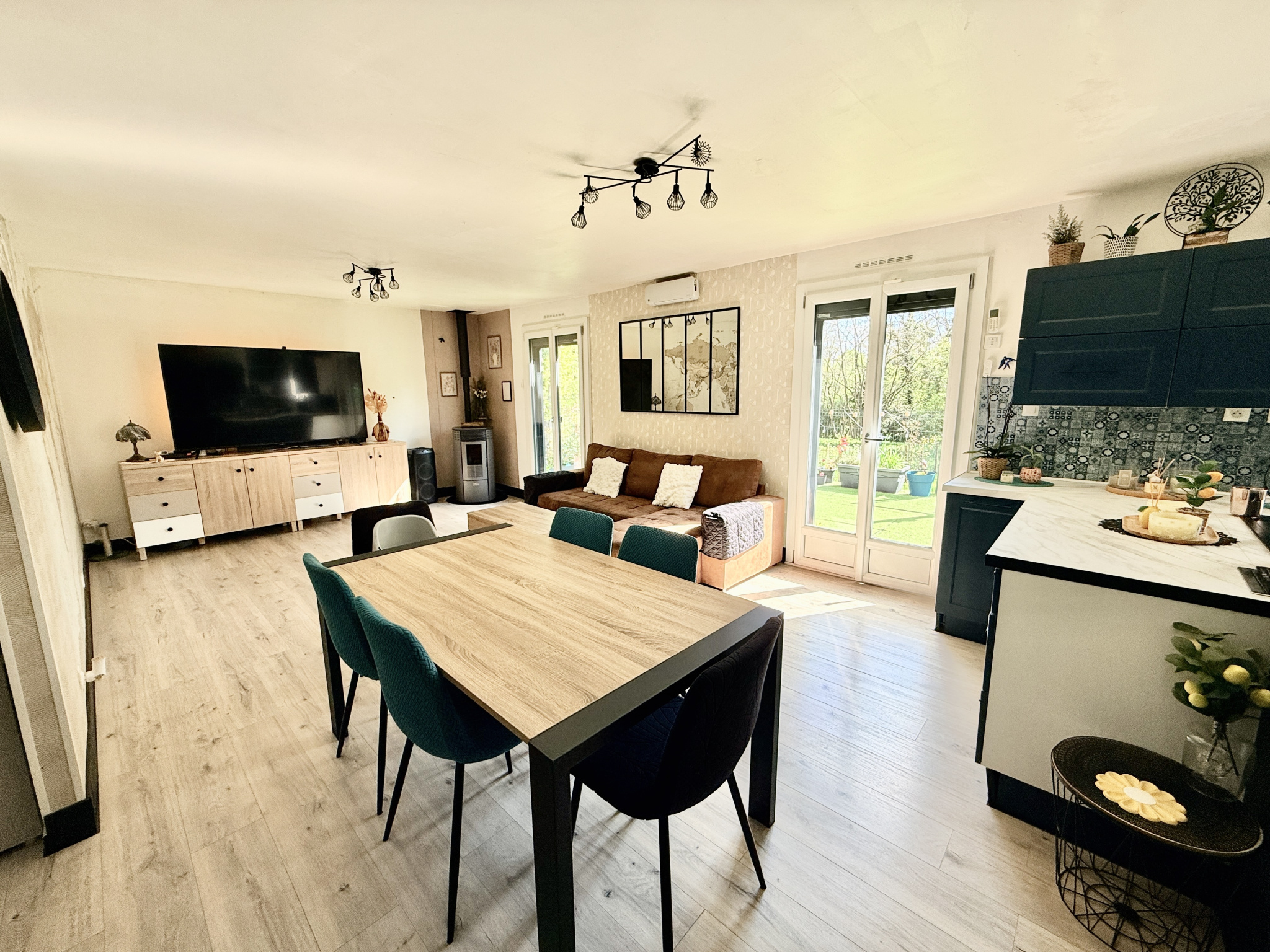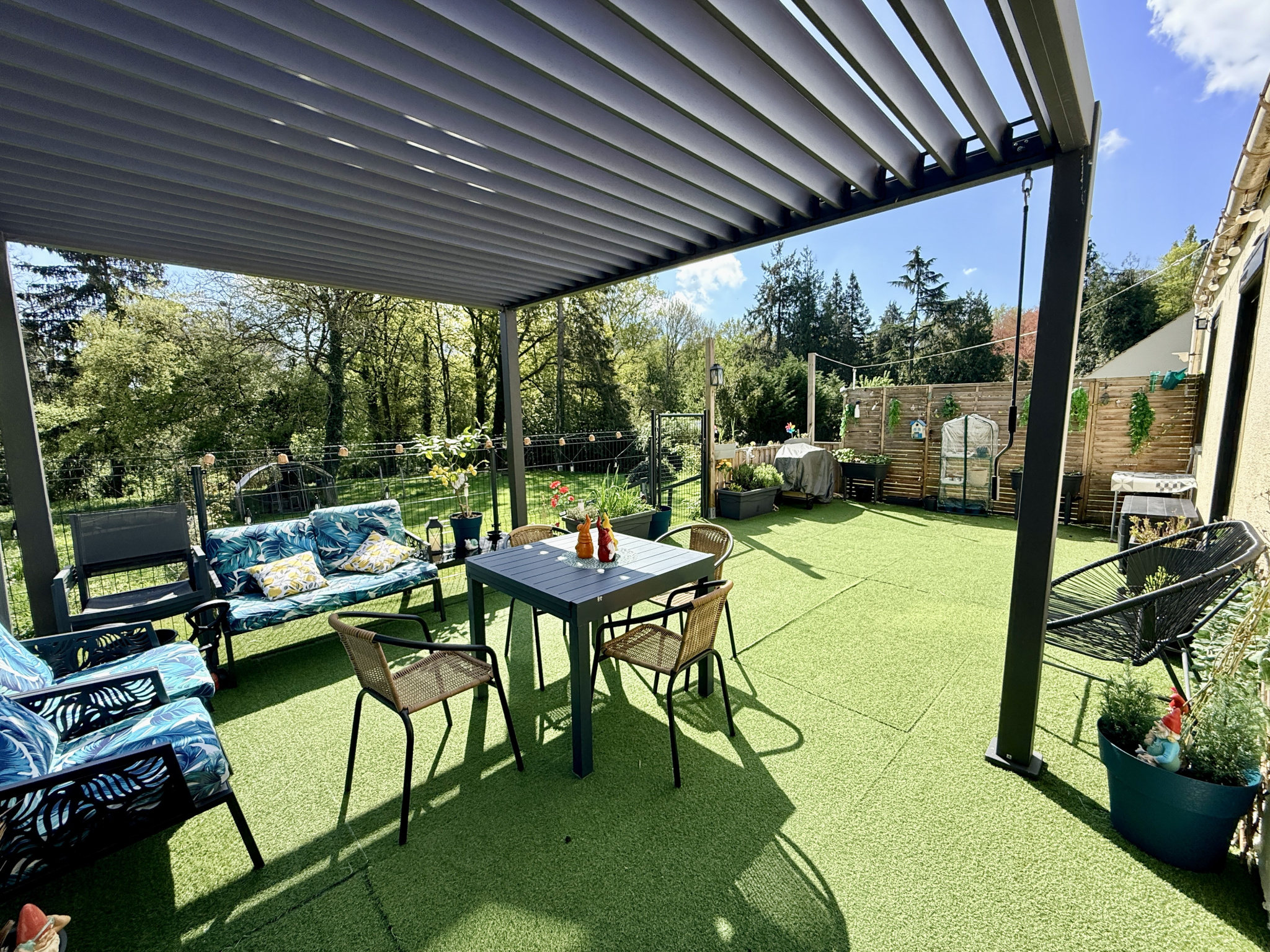 Côté extérieur, la terrasse donne accès au jardin clos, arboré et sans vis à vis