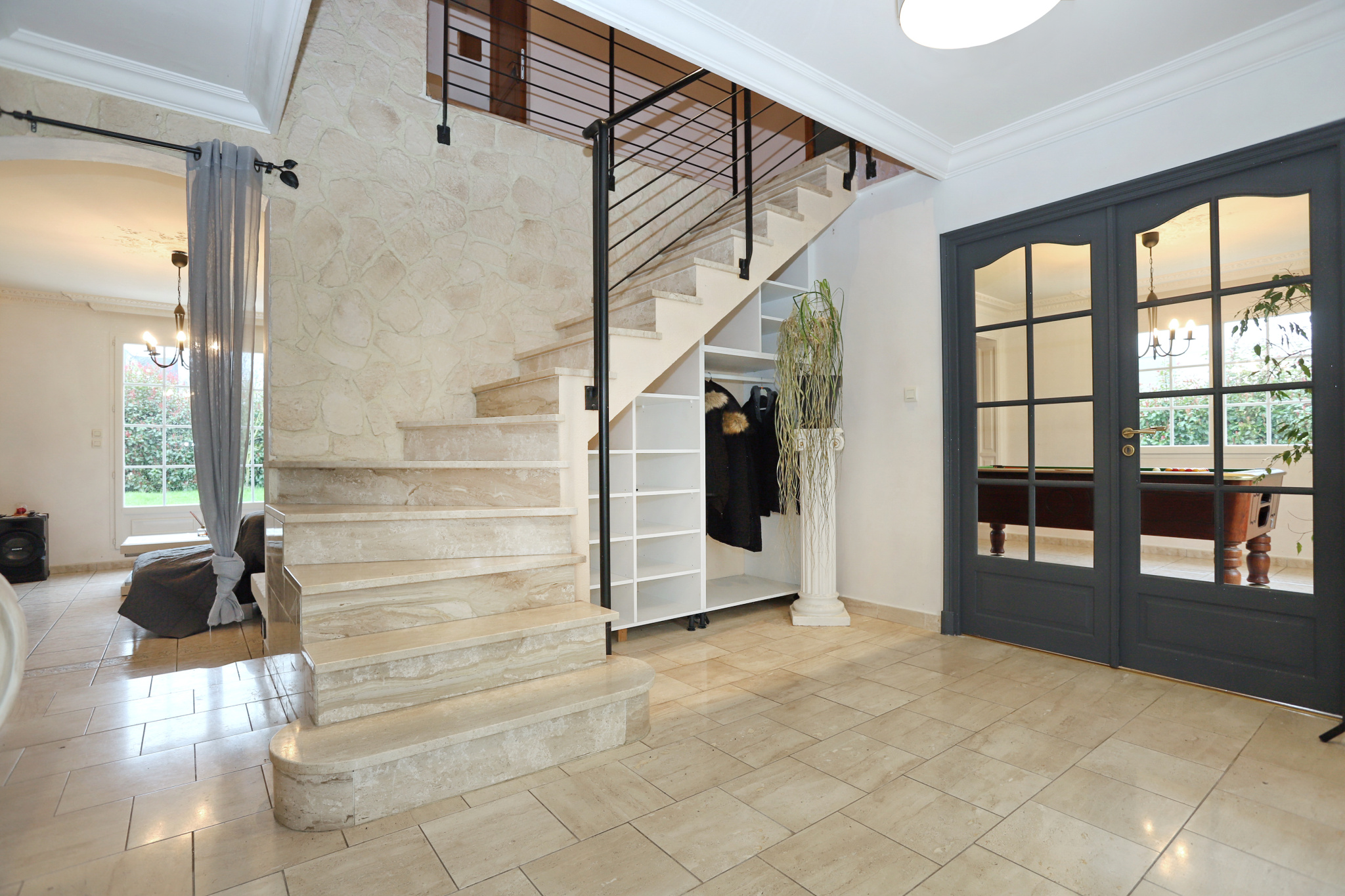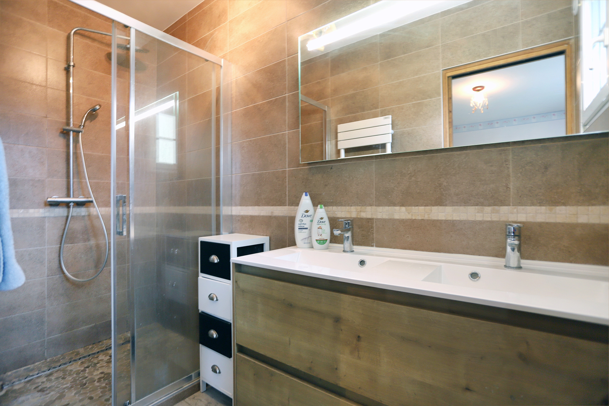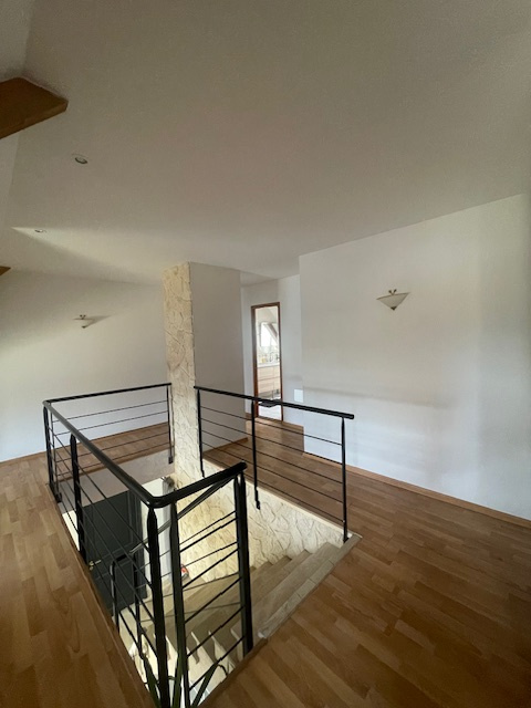A l'étage, une grande mezzanine pouvant servir de bureau dessert 5 chambres, une salle de bains et un wc. Un double garage de 40 m2 avec portes automatiques et buanderie vient compléter ce bien.