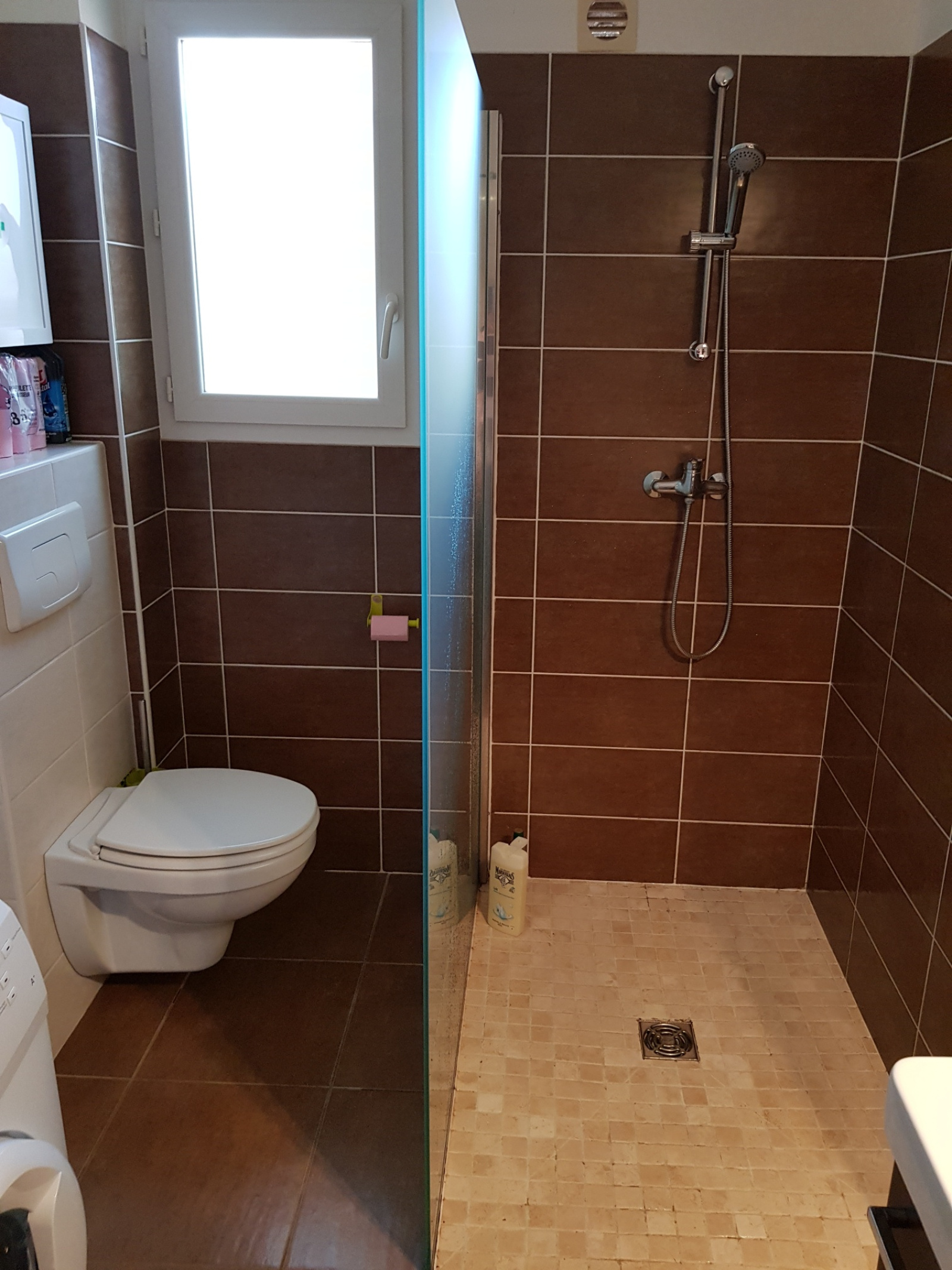 - Salle d’eau avec douche à l’italienne, WC, meuble vasque, sèche-serviette et espace buanderie (machine à laver)