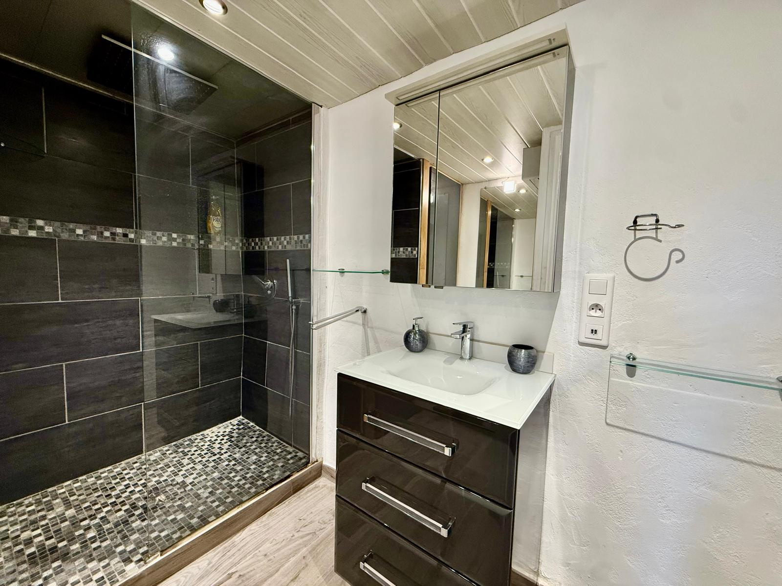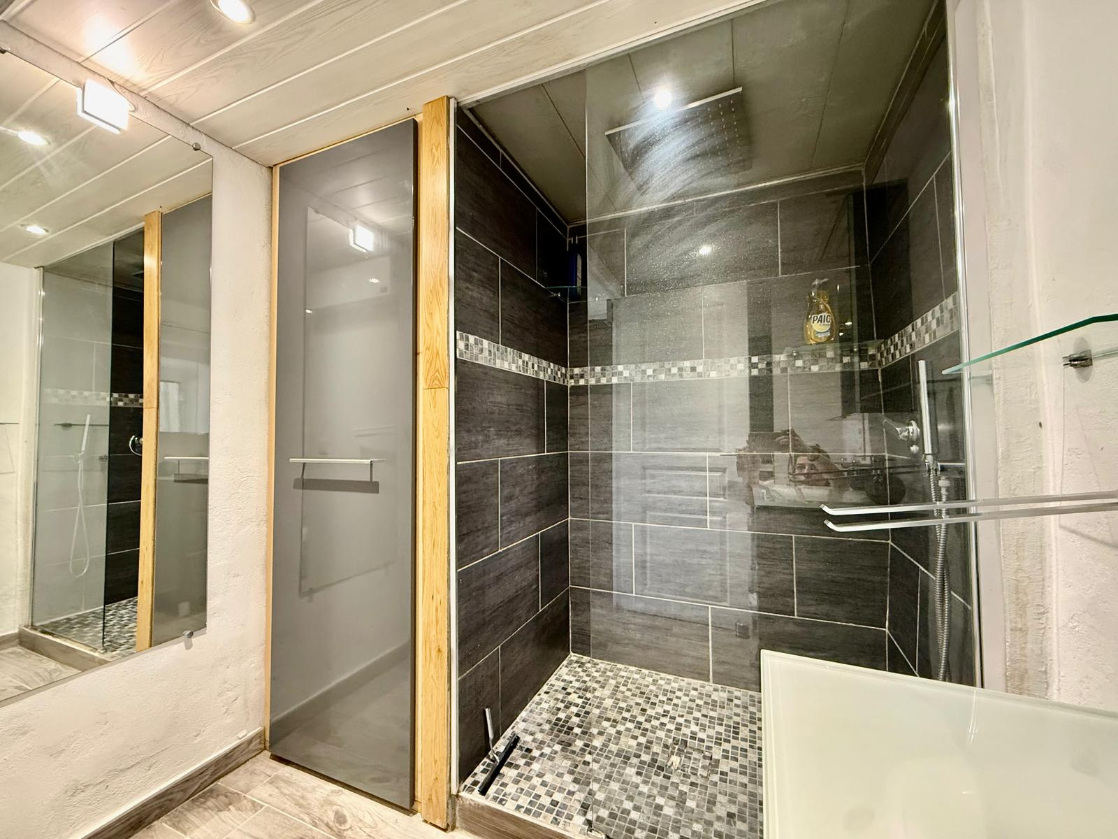 - Au 1er niveau la pièce à vivre salon cuisine ouverte équipée avec une cheminée et un espace véranda permettant de profiter de la vue mer. Cet espace chaleureux est traditionnel avec poutres apparentes et mur en pierre a été rénovée avec des menuiseries en Pvc, le double vitrage et la climatisation.