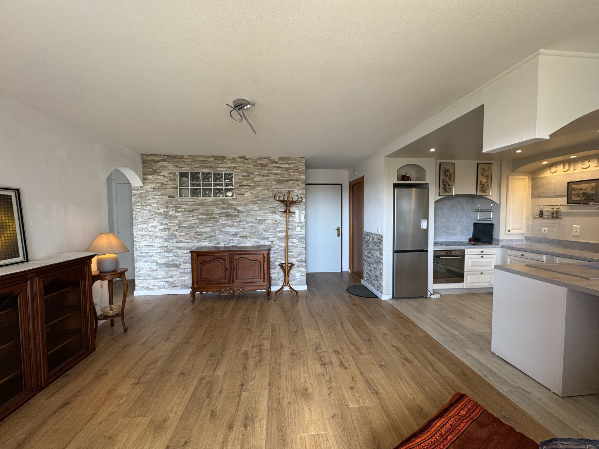 Il offre un vaste séjour/cuisine de 38m2 donnant sur une première terrasse, ainsi qu'une cuisine spacieuse, fonctionnelle et sublimée par des touches de béton ciré, lui conférant un style résolument contemporain.