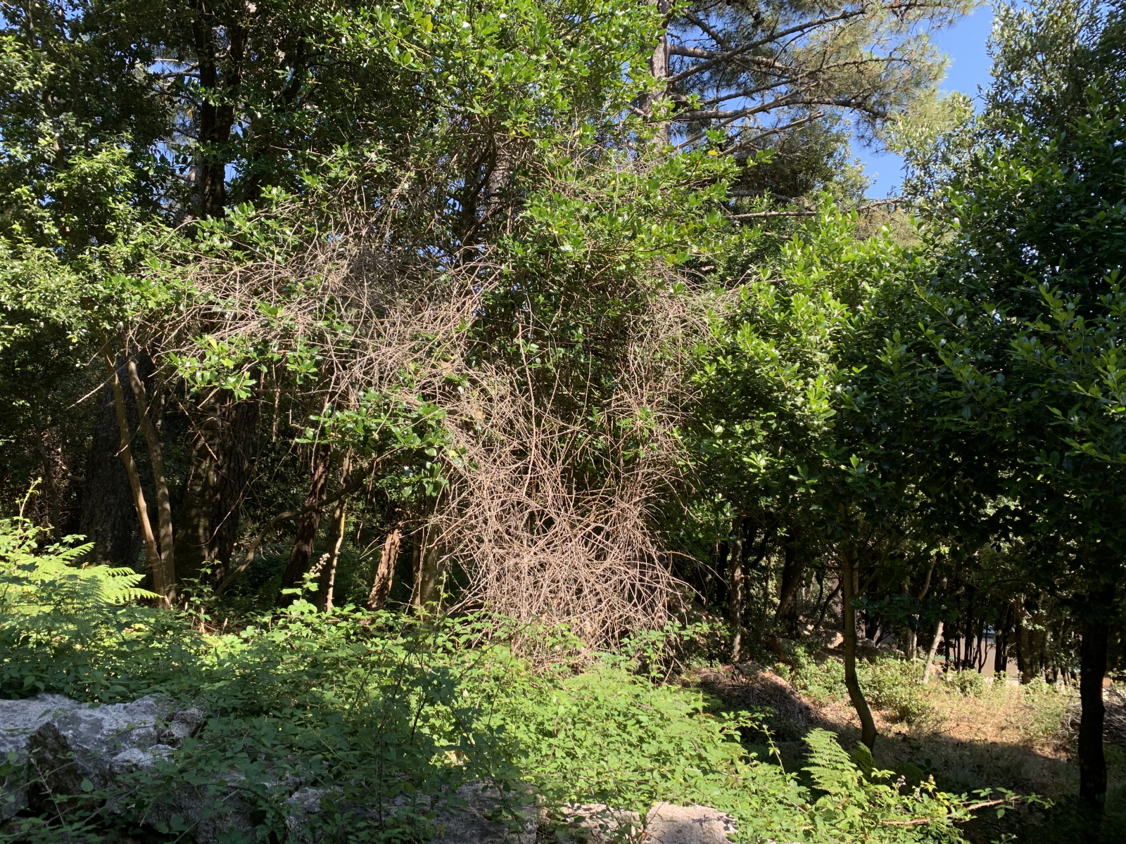 Ce terrain arboré et jonché de beaux blocs rocheux est en partie clôturé de beaux murs en pierre.