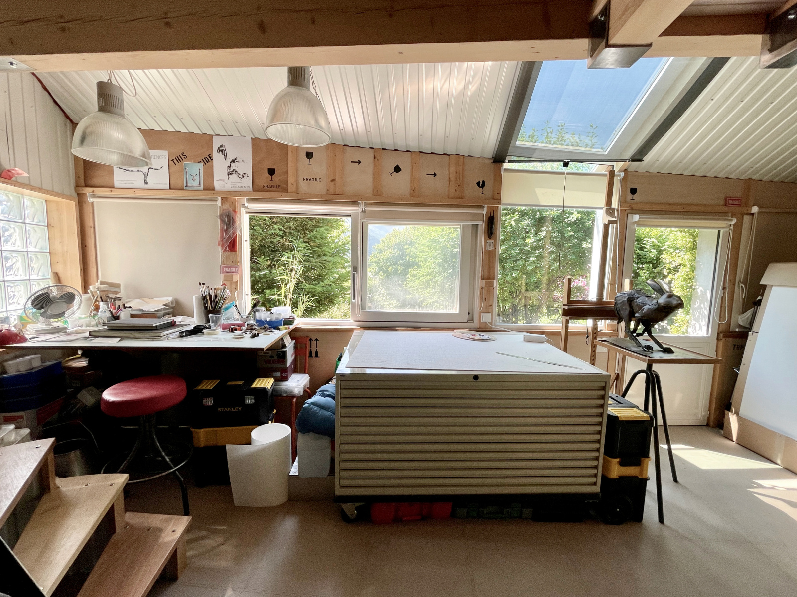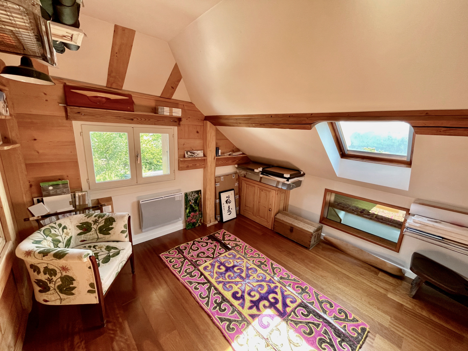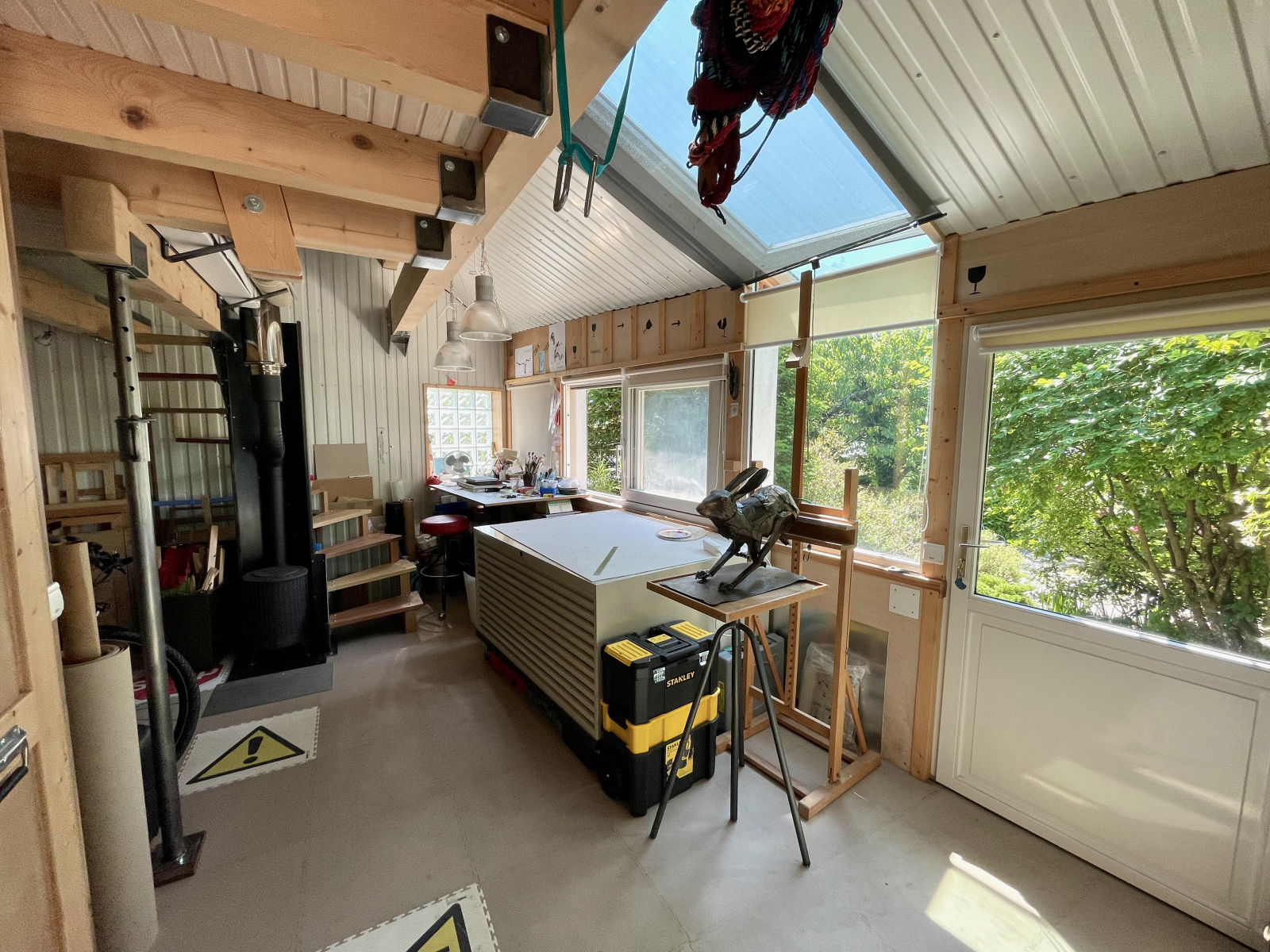 3/ Exceptionnel ! Un atelier d’artiste (bâtiment annexe indépendant), très lumineux, exposé plein sud, donnant à la fois sur jardin et sur cour, avec salle de bain, wc, poêle à bois et mezzanine (env. 26 m2 habitable)