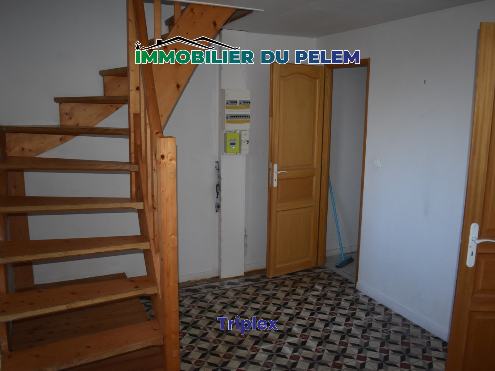 Entrée du triplex desservant toilettes (1.3m²) et salle d'eau (6m²), sol recouvert de carreaux de ciment, avec escalier en bois pour accéder au premier étage.