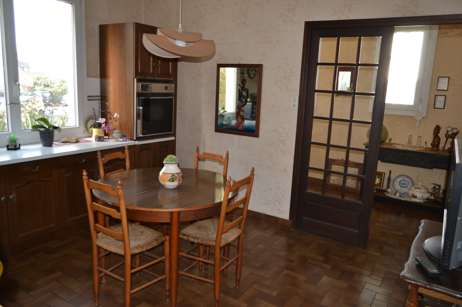 Au rez de chaussée, salon séjour avec un conduit de cheminée, une cuisine aménagée et équipée, une salle de bains et deux chambres. Lumineuse exposition est ouest sans vis à vis.