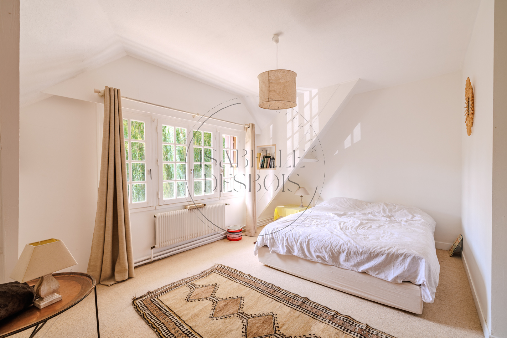 Elle est composée de 2 chambres en rez de chaussée avec une salle d'eau, et à l'étage, un vaste palier mezzanine dessert 4 chambres,1 salle de bain, grenier, combles aménageables. Un garage. Possibilité d'extension de 50 m2