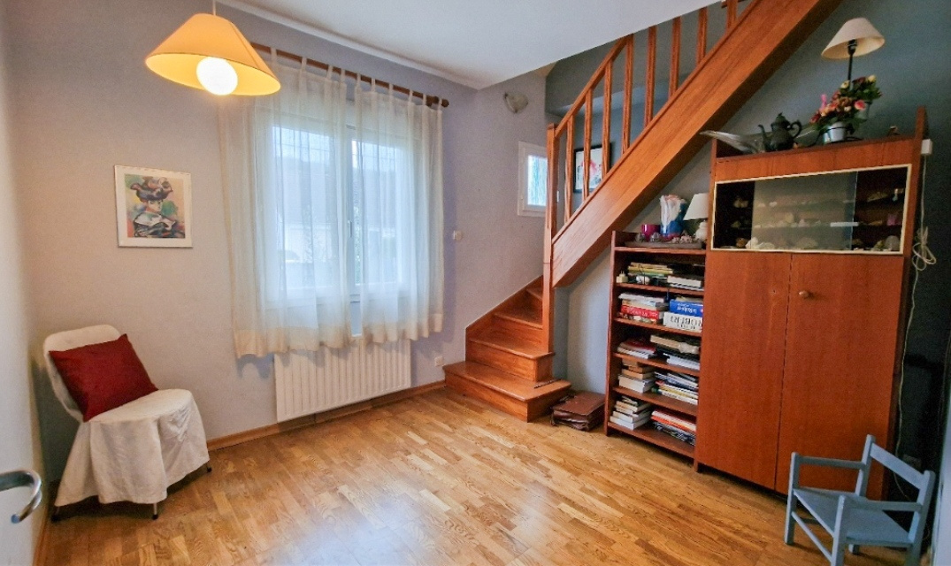 Il vous offre en RDC: entrée, cuisine aménagée et équipée, pièce de vie de 35m2 avec cheminée à granulés, veranda , 2 chambres, salle de douche avec WC, bureau