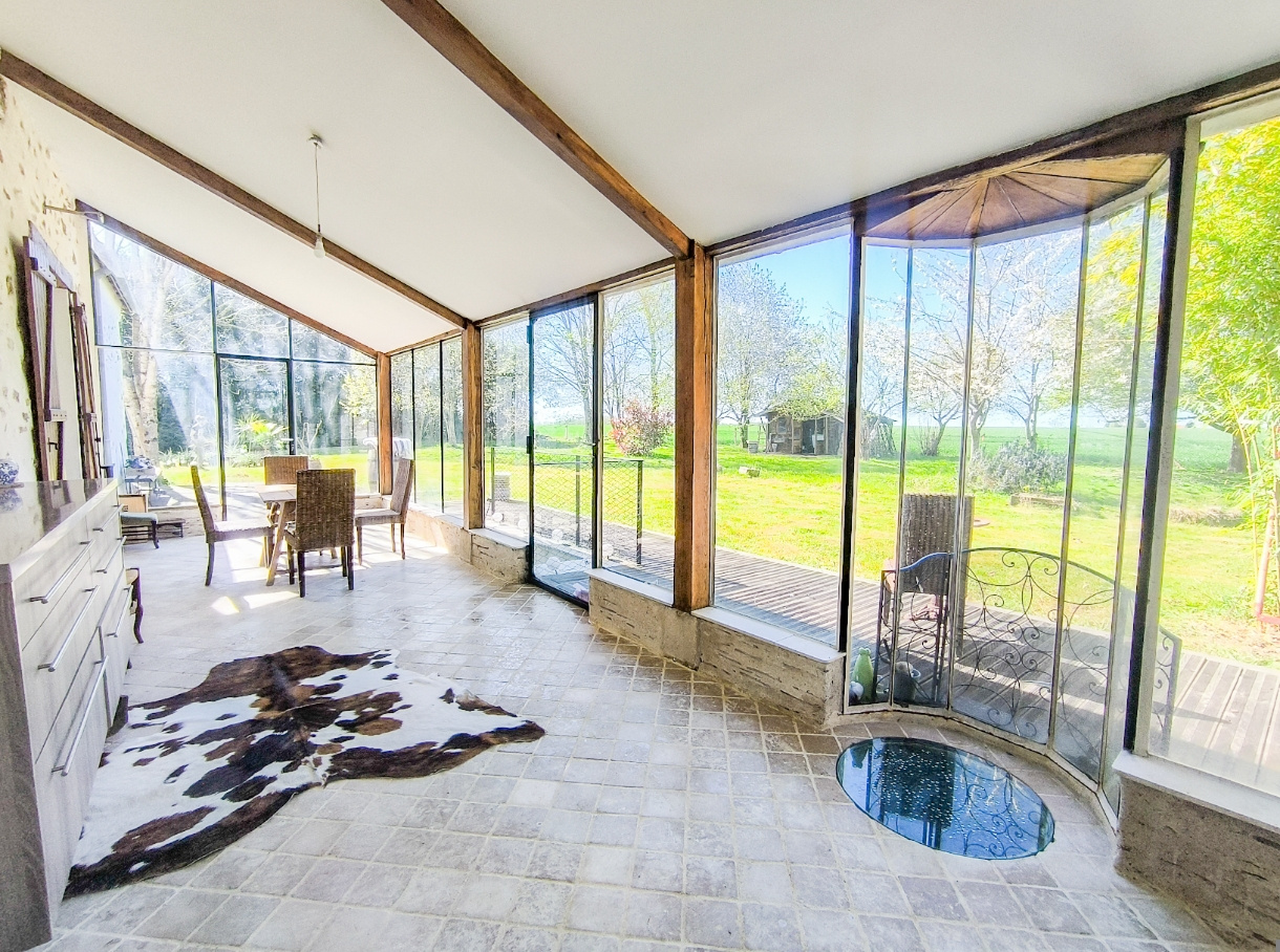 Une véranda lumineuse vous accueille avec une vue apaisante sur la nature et son puits. Vous profiterez également d’une cuisine aménagée et équipée, d’une chaleureuse pièce de vie avec cheminée insert, d’un salon, d’un WC, ainsi que d’un garage avec espace buanderie.