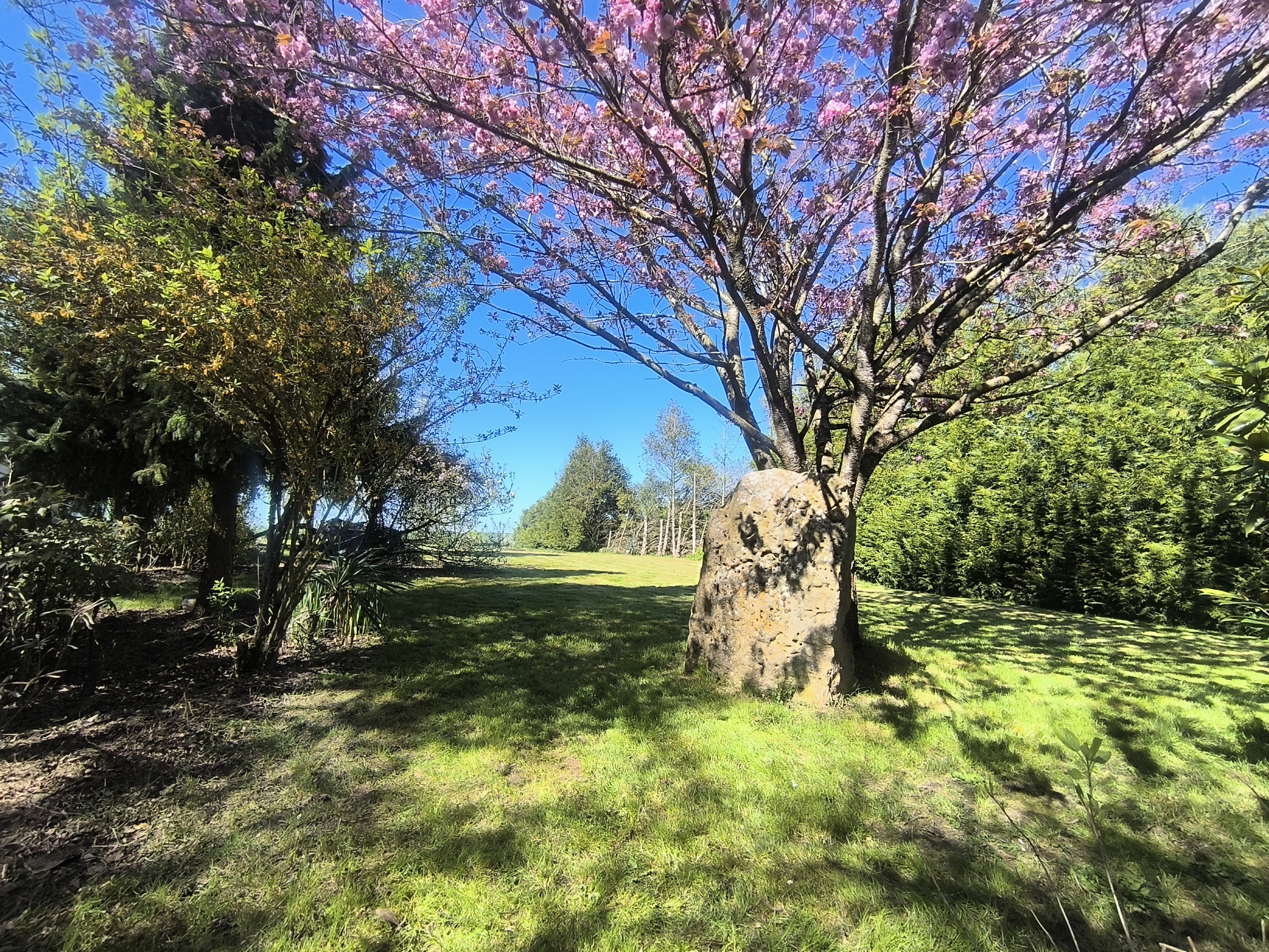 Le terrain arboré offre un cadre exceptionnel avec un petit étang, une terrasse, un cabanon de jardin et une cave, le tout sur une parcelle généreuse de 3 710 m², idéale pour profiter pleinement de la nature.