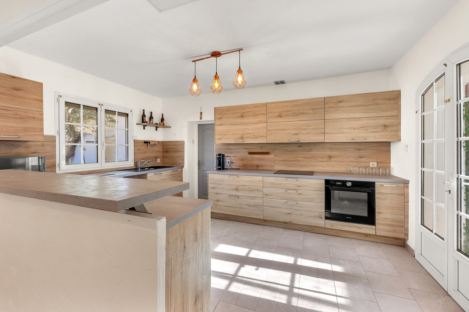 La cuisine contemporaine de 17 m², récemment rénovée et entièrement équipée, apportant caractère et modernité à l’espace de vie.