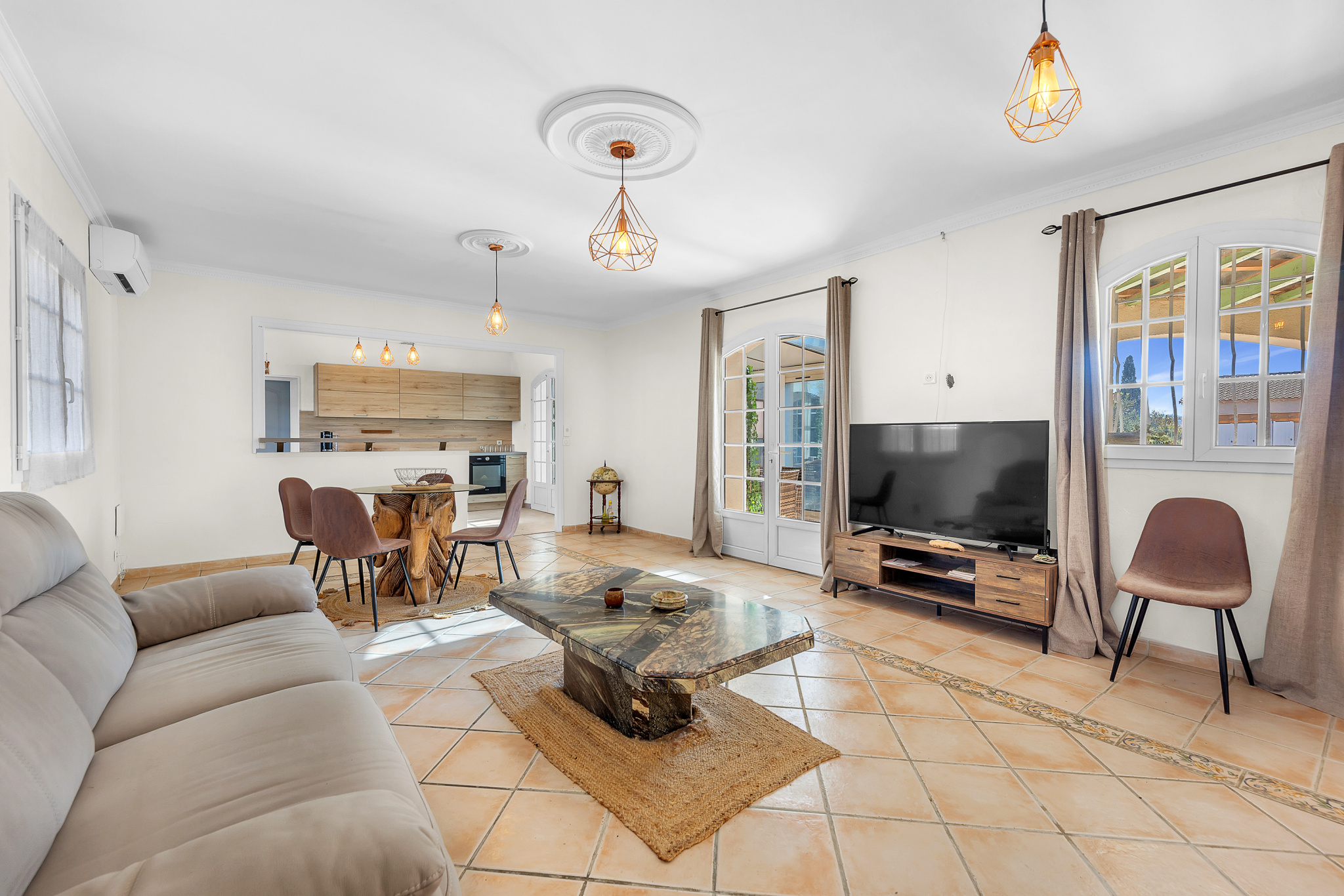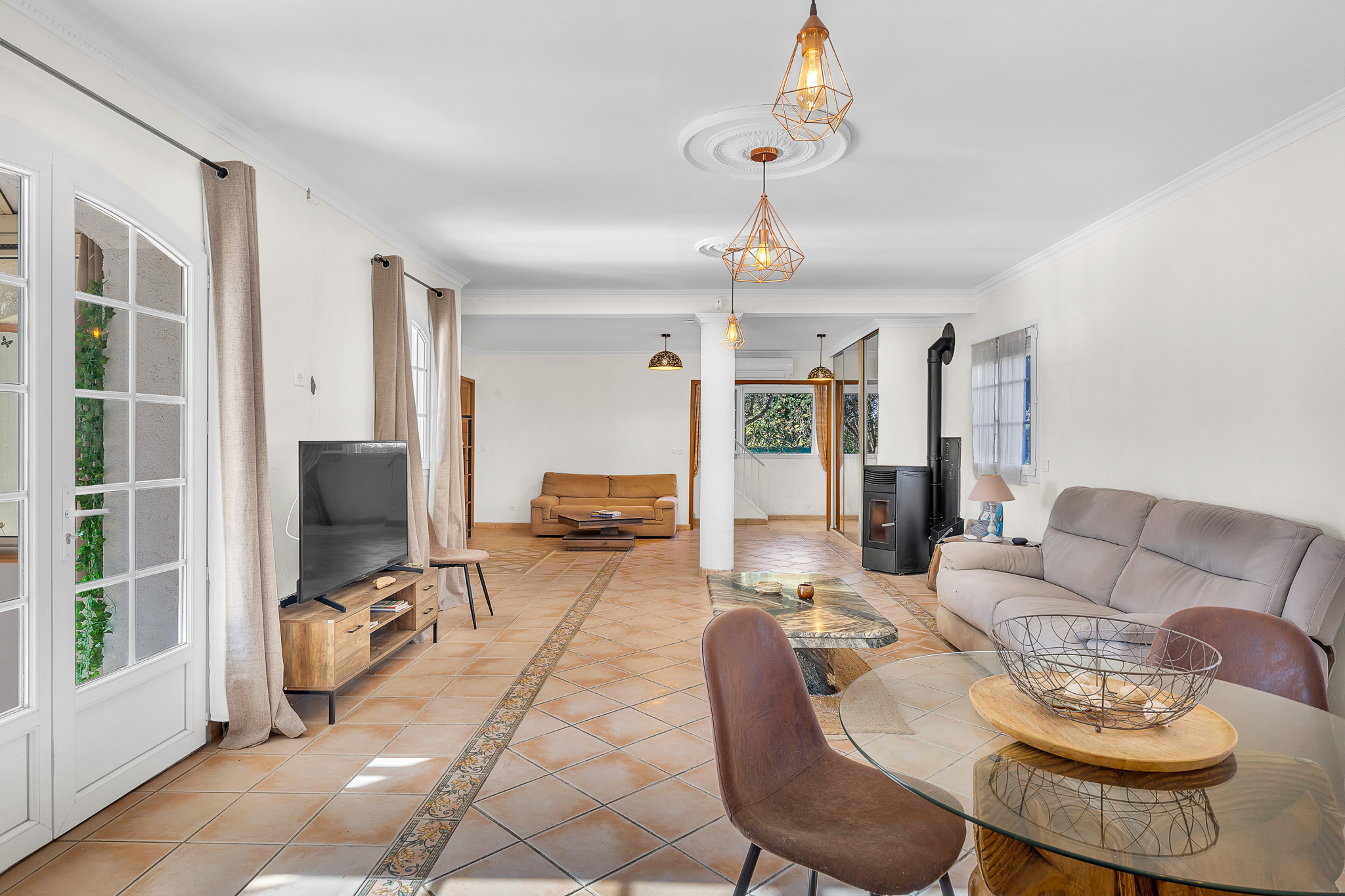 Le rez-de-chaussée s’ouvre sur un spacieux salon-séjour de 53 m², lumineux et chaleureux grâce à son poêle à granulés, prolongé par une véranda qui invite à la détente tout au long de l’année.