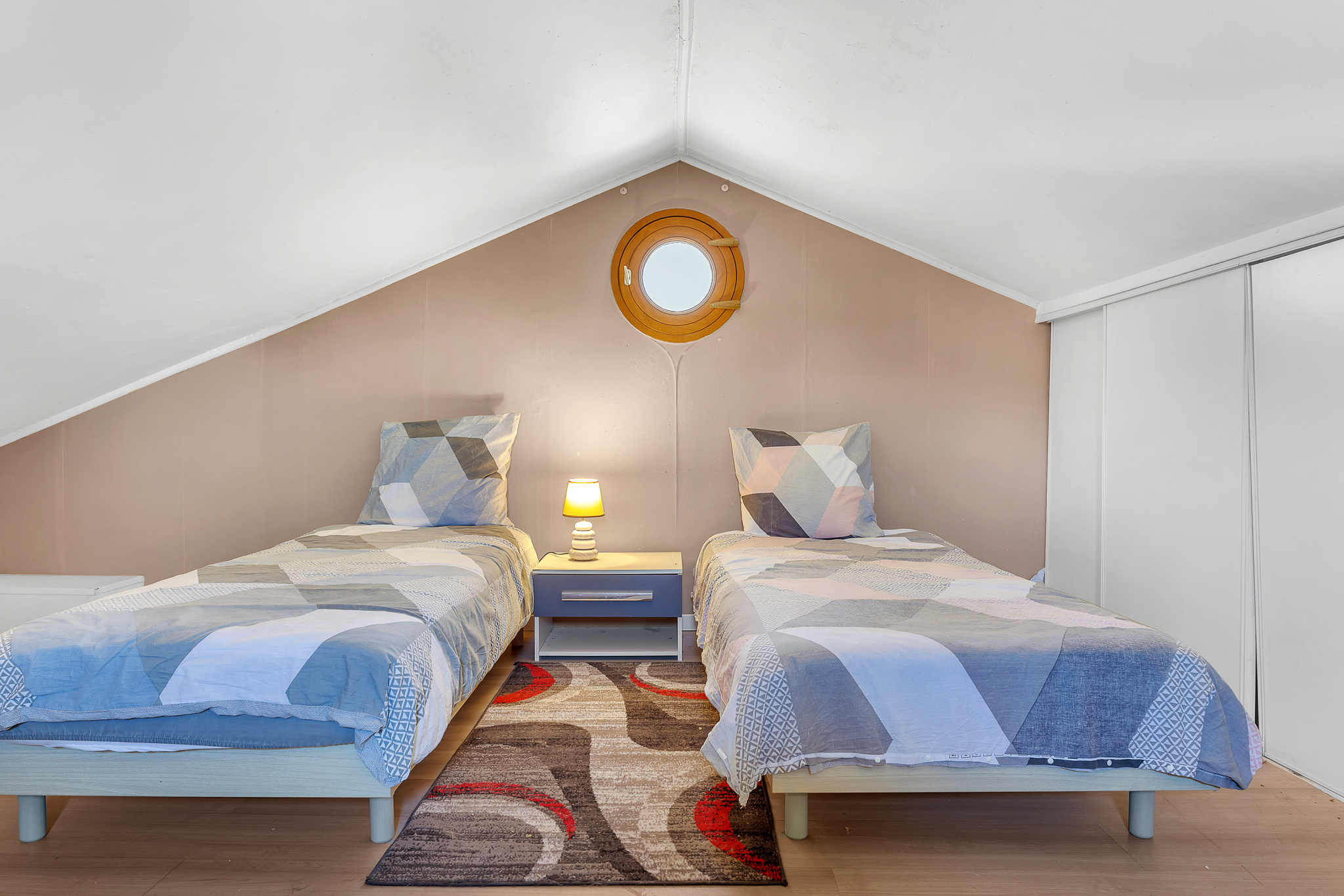 À l’étage, une chambre mansardée de 26 m² permet d’aménager un espace polyvalent, bureau, chambre d’appoint ou espace créatif selon vos besoins.