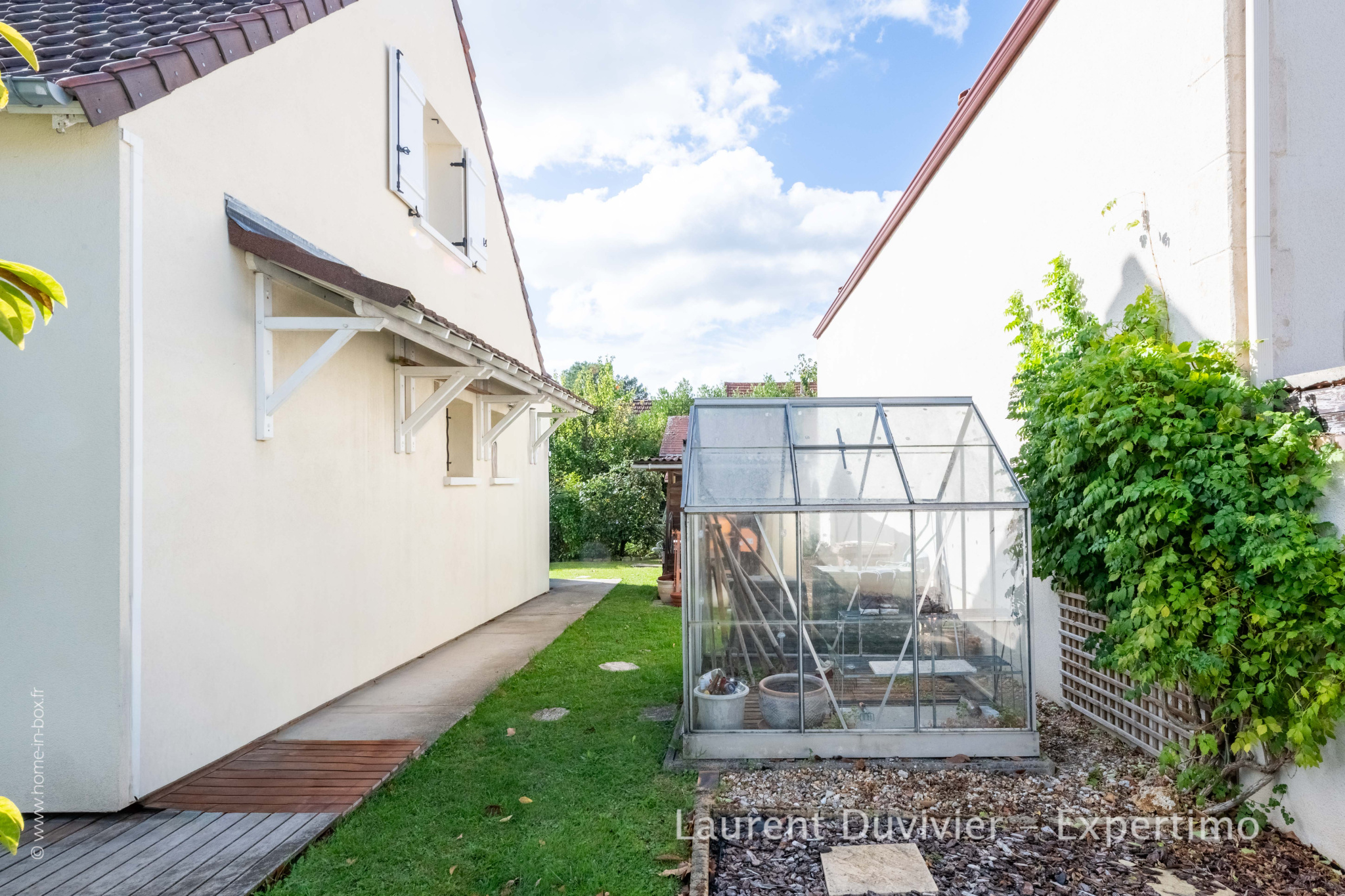 En plus de la terrasse extérieur, le jardin comprend une cabane pour les outils, une serre pour le potager et un espace gravillonné devant la maison pour garer les voitures des invités, le tout à l’abri des regards derrière un mur d’enceinte et un portail automatique.