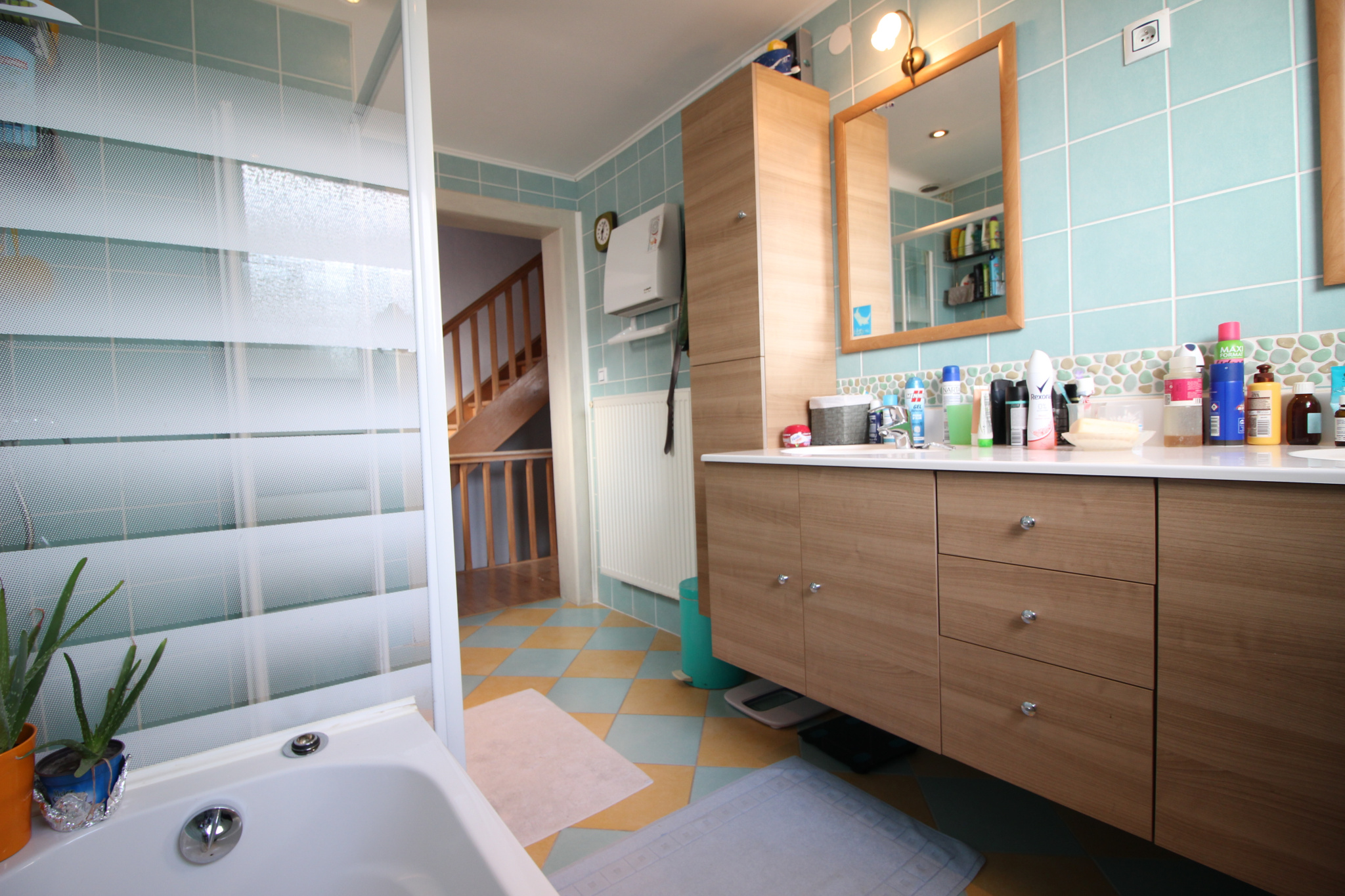 2 vasques, 1 douche, 1 baignoire, 1 WC, 2 fenêtres, carrelage