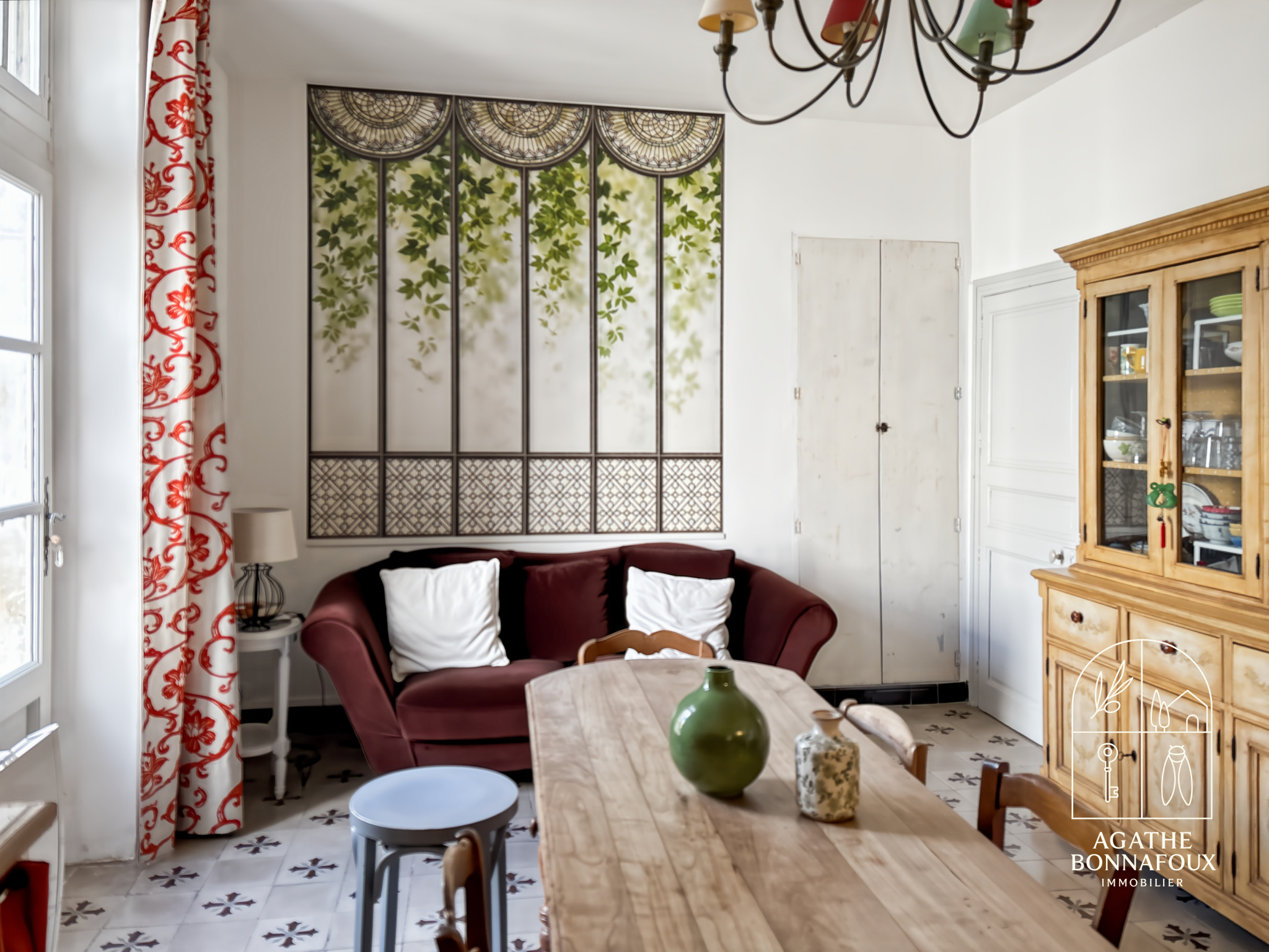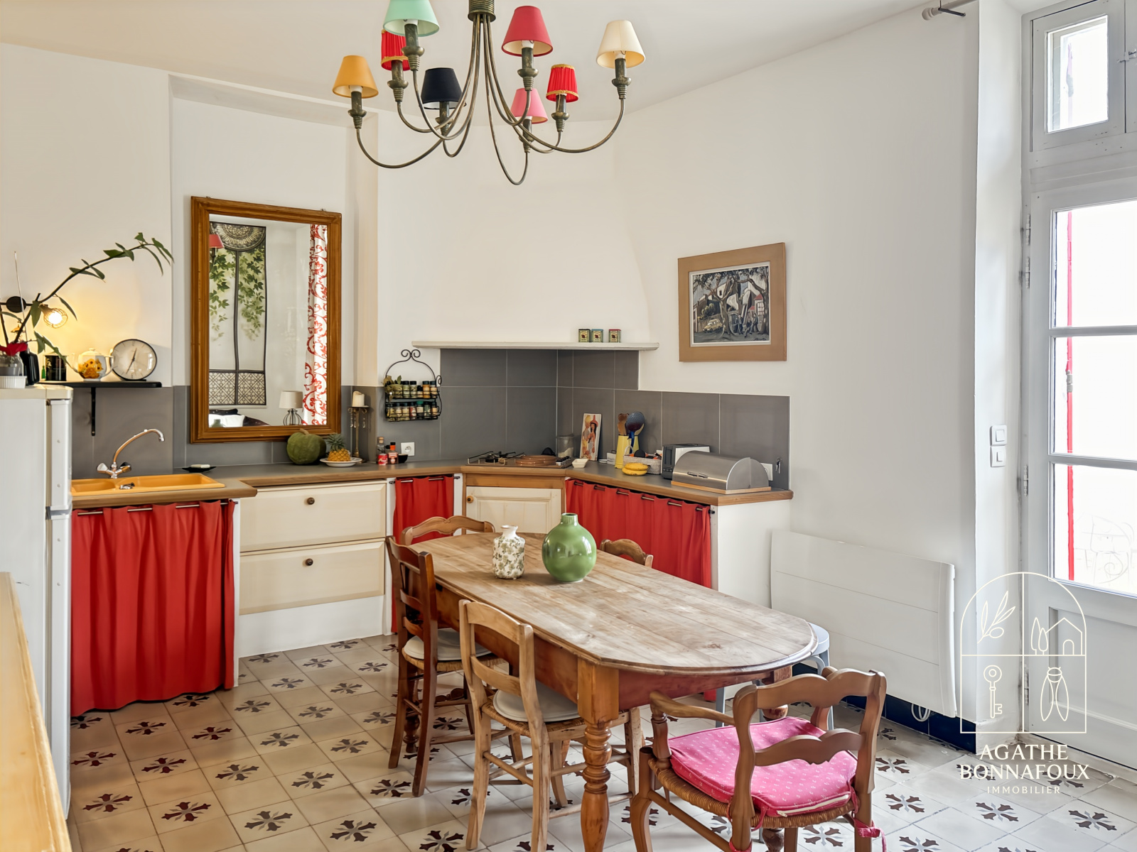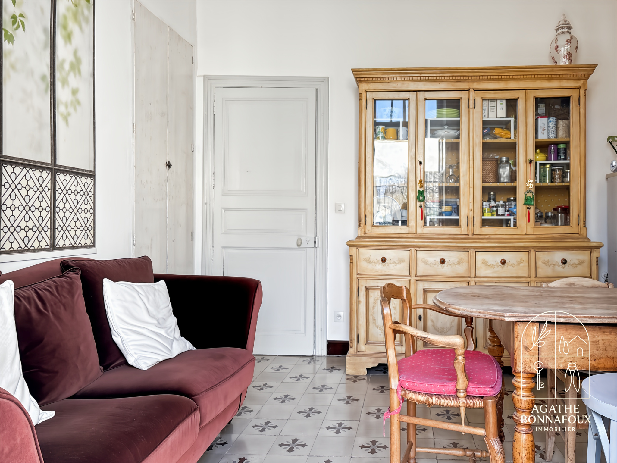 Dès l’entrée, vous serez accueilli par un confortable salon, chaleureux et convivial. La cuisine indépendante avec espace salle à manger, sublimée par ses carreaux de ciment d’origine, offre un cachet rare et une atmosphère élégante.