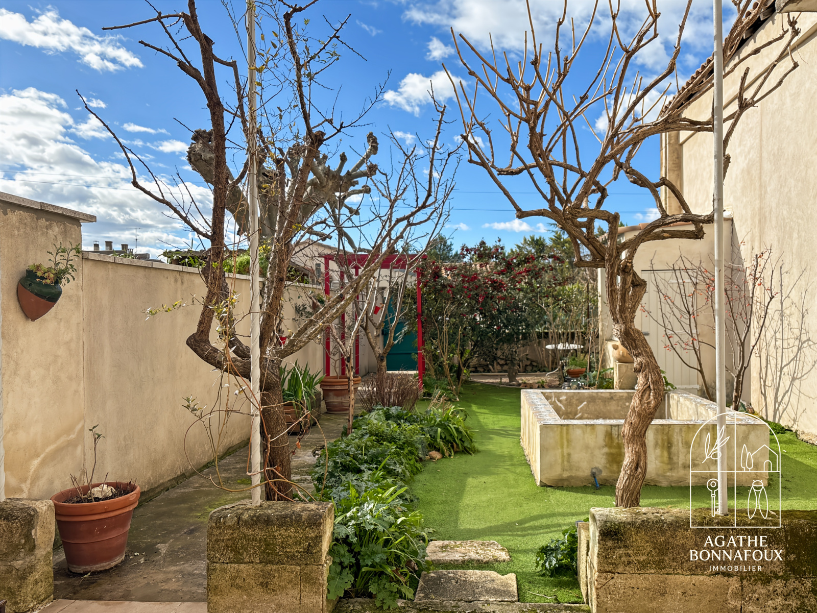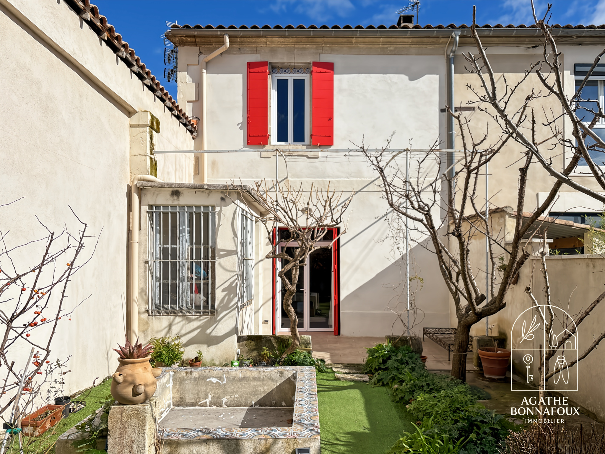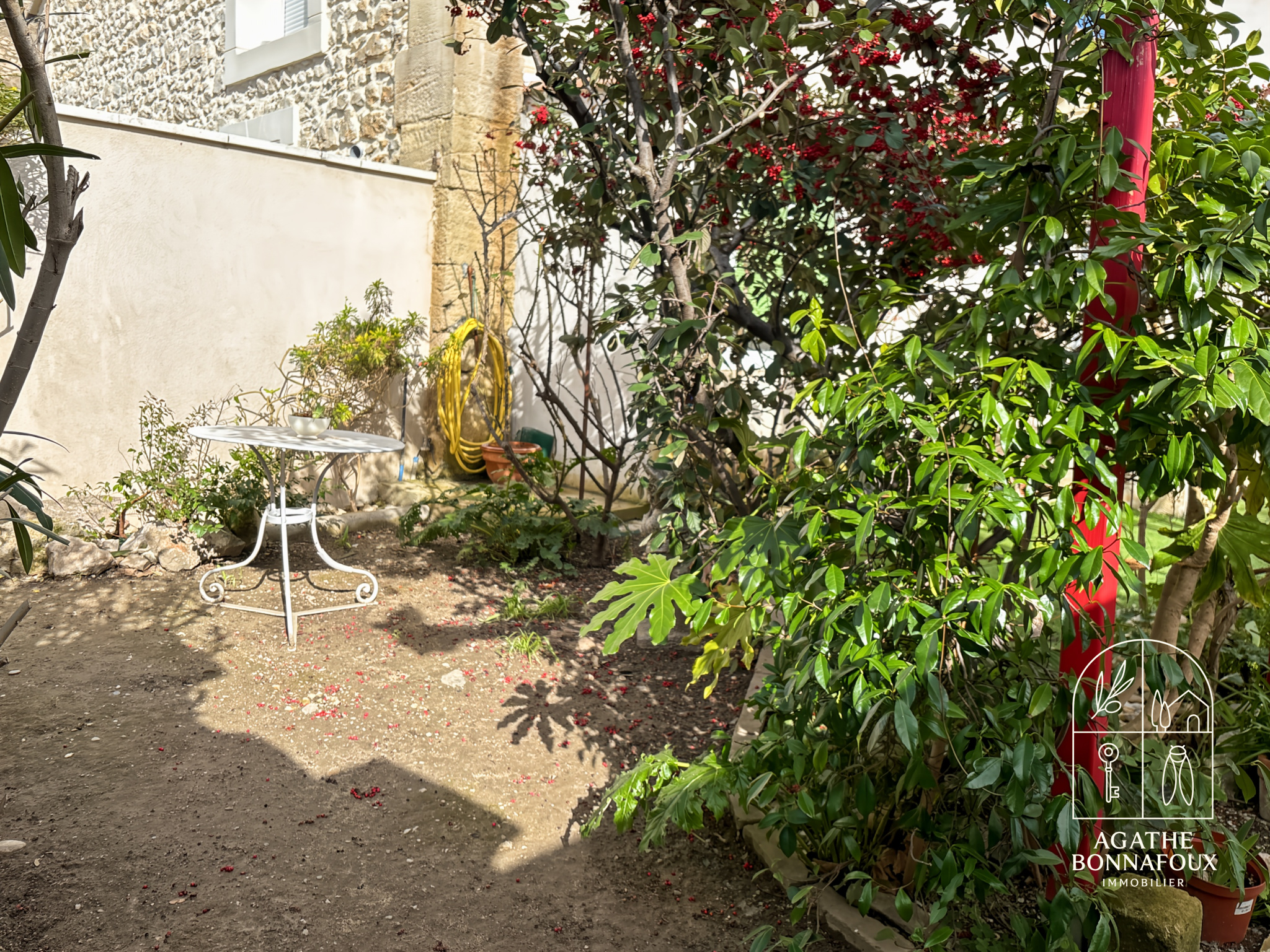 À l’extérieur, le cadre invite à la détente : un ravissant jardinet arboré et entièrement clos (sans grand entretien), deux ateliers "rangements", un petit bassin 1.5X1.5 intimiste idéal pour se rafraîchir durant l’été, ainsi qu’une grande terrasse carrelée ombragée par une treille en fer forgé.