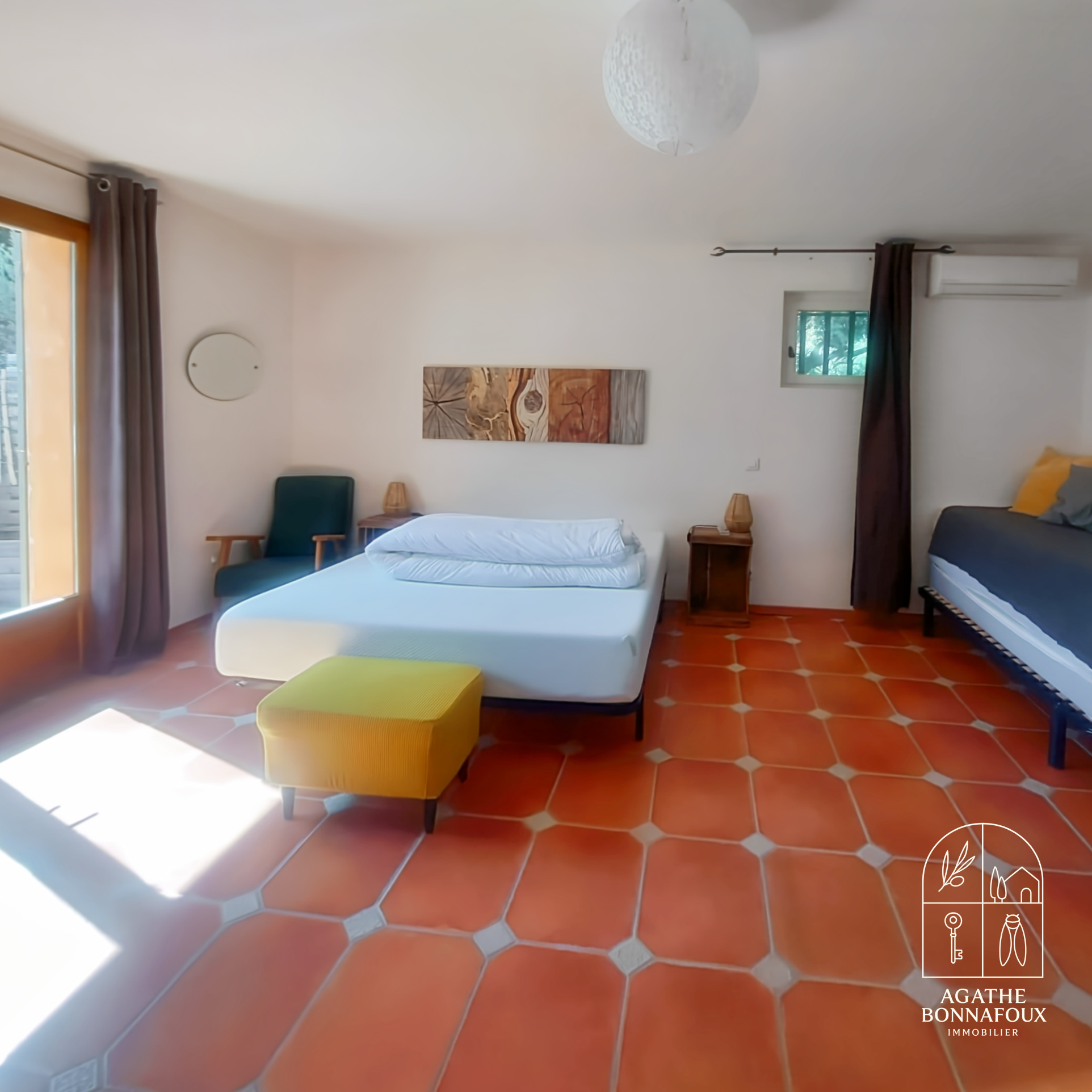 La dépendance comprend une spacieuse pièce de vie avec cheminée et coin cuisine, une grande chambre (24m2), une salle d'eau,wc.