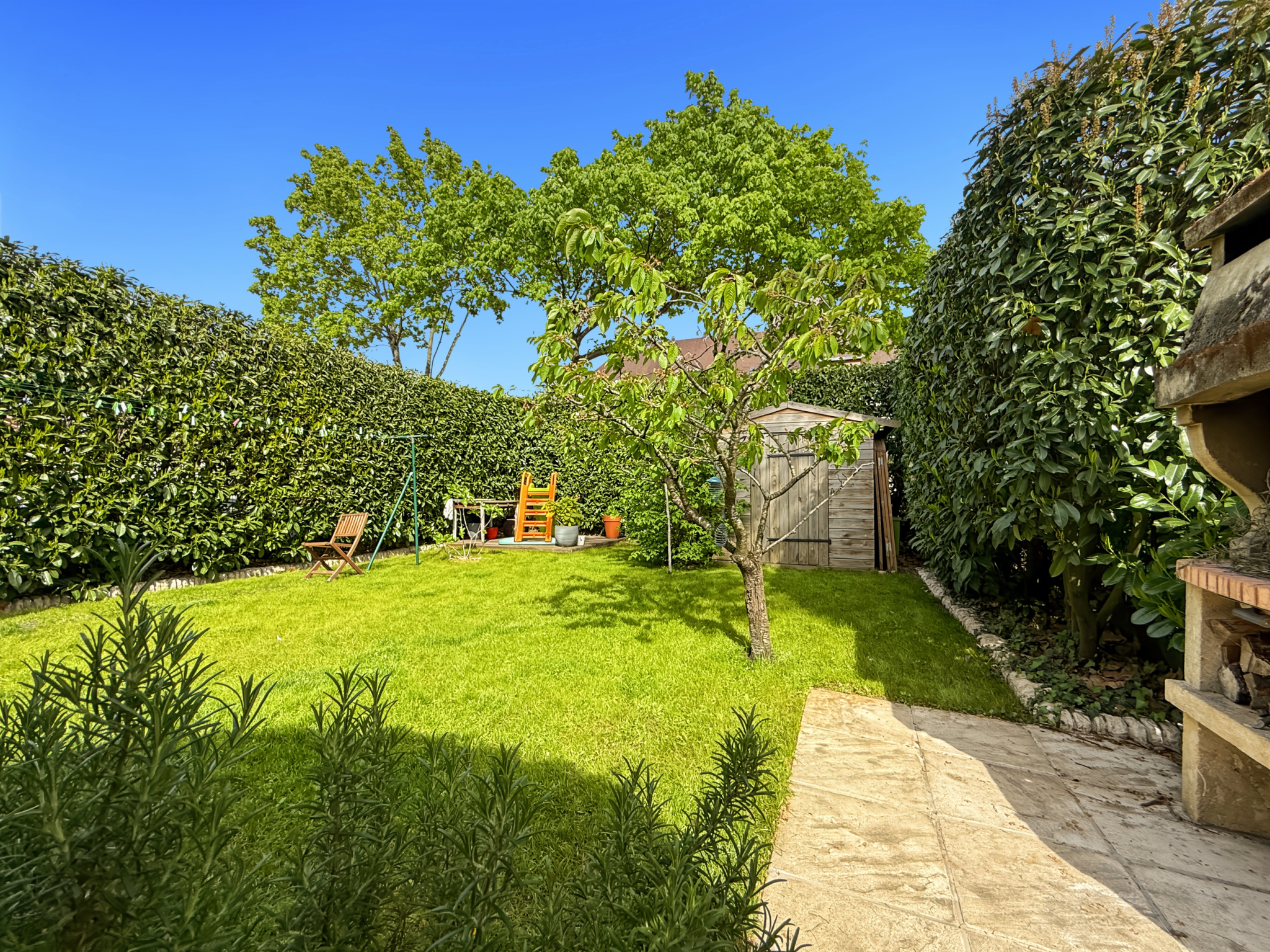La maison bénéficie également d’un sous-sol total de 62 m², d’un garage, d’une aire de stationnement, d’une terrasse profonde et d’un jardin clos sur 345 m².