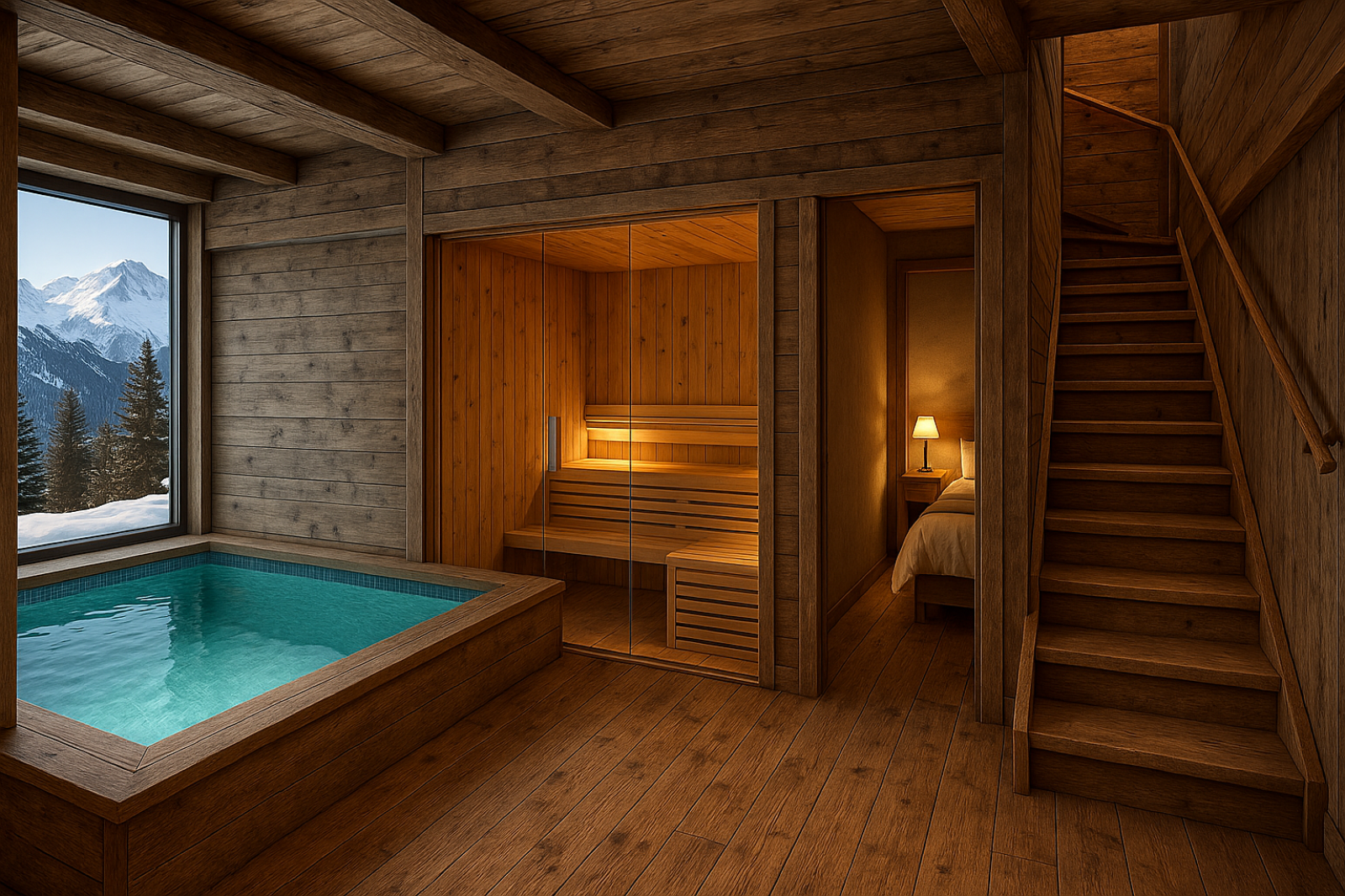 Prestations haut de gamme, 5 suites dont une master room au dernier étage MODULABLE en 5ème et 6ème suites, piscine intérieure, ski room, spa-sauna-hammam. De quoi accueillir 10 à 12 personnes aisément et très confortablement.