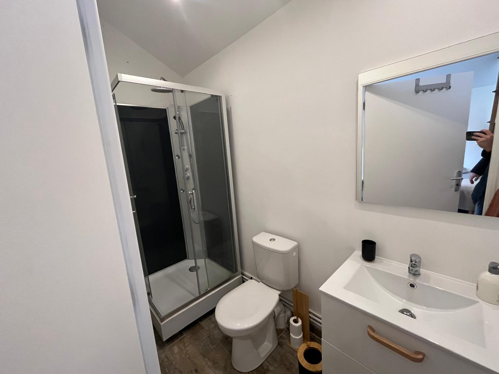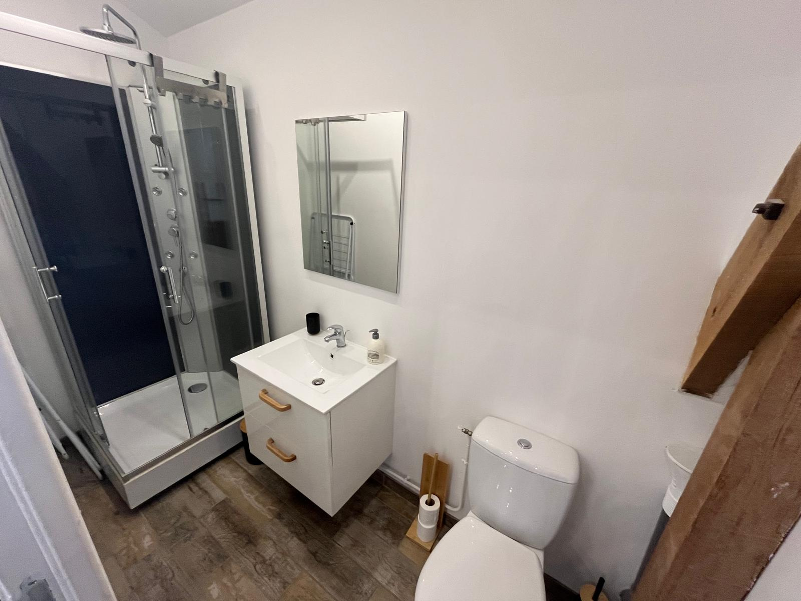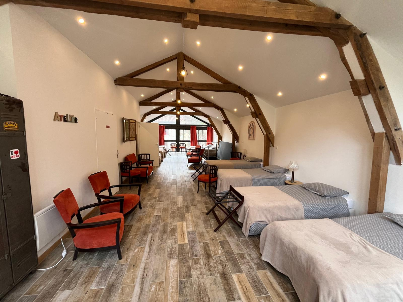 À l’étage, une grande pièce lumineuse, actuellement aménagée en espace nuit pour les invités, dispose de deux salles d’eau et de WC. Cet espace offre la possibilité d’être facilement cloisonné afin de créer plusieurs chambres indépendantes, selon vos besoins.
