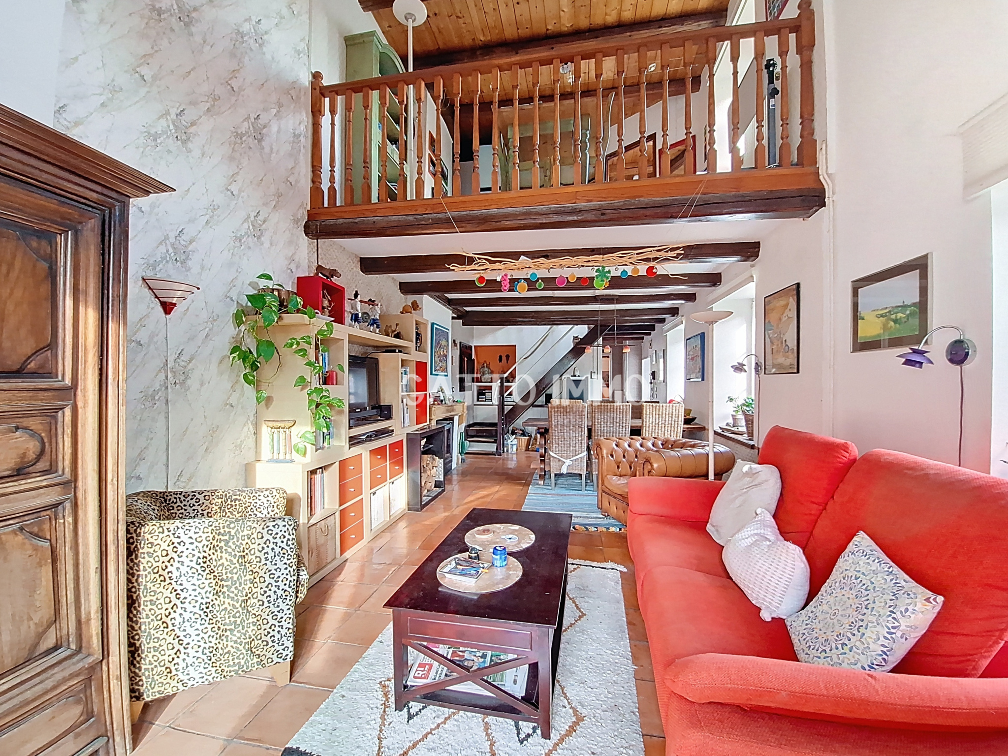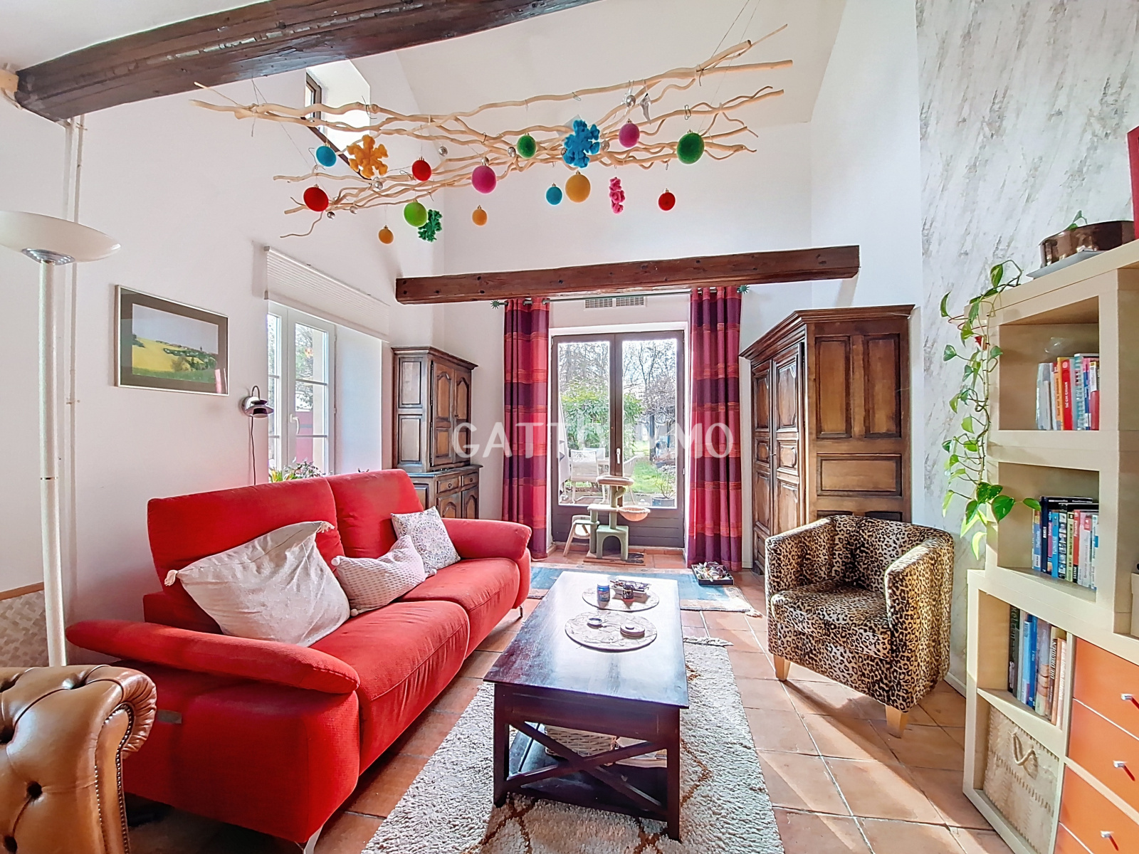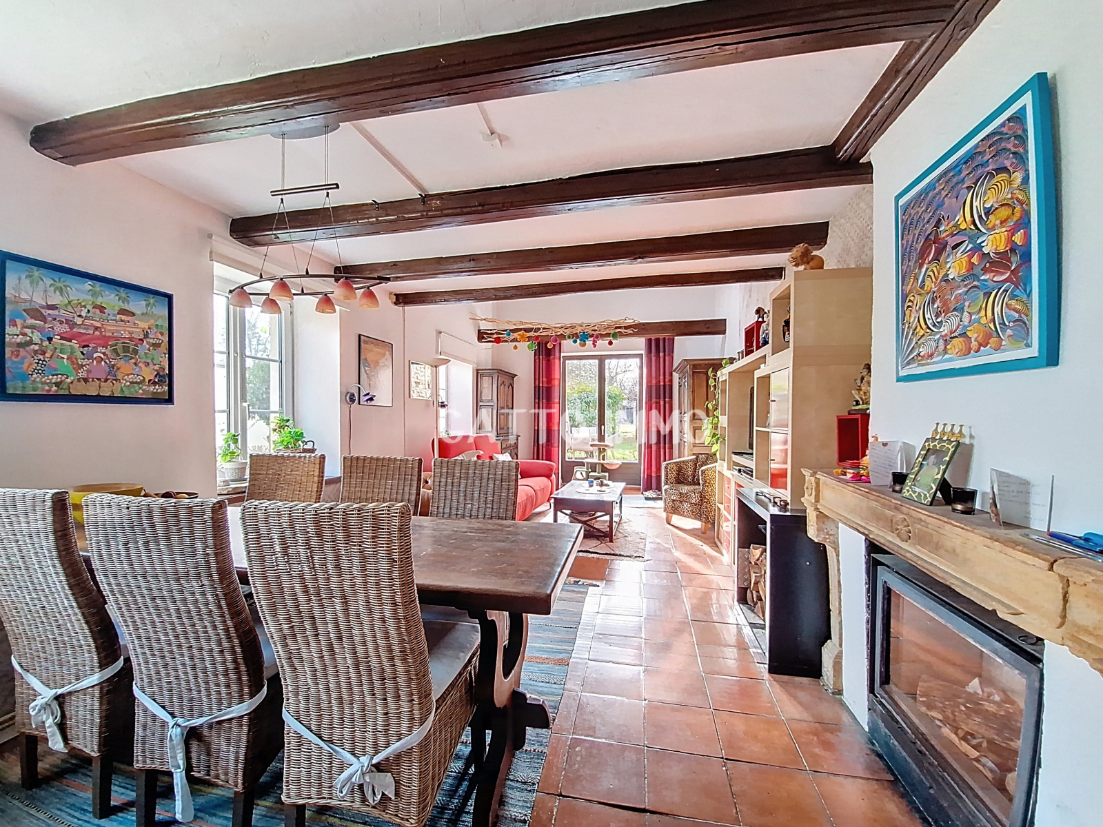 Vous pourrez bénéficier d'une belle pièce à vivre lumineuse avec cheminée et poutres apparantes donnant directement sur la terrasse.