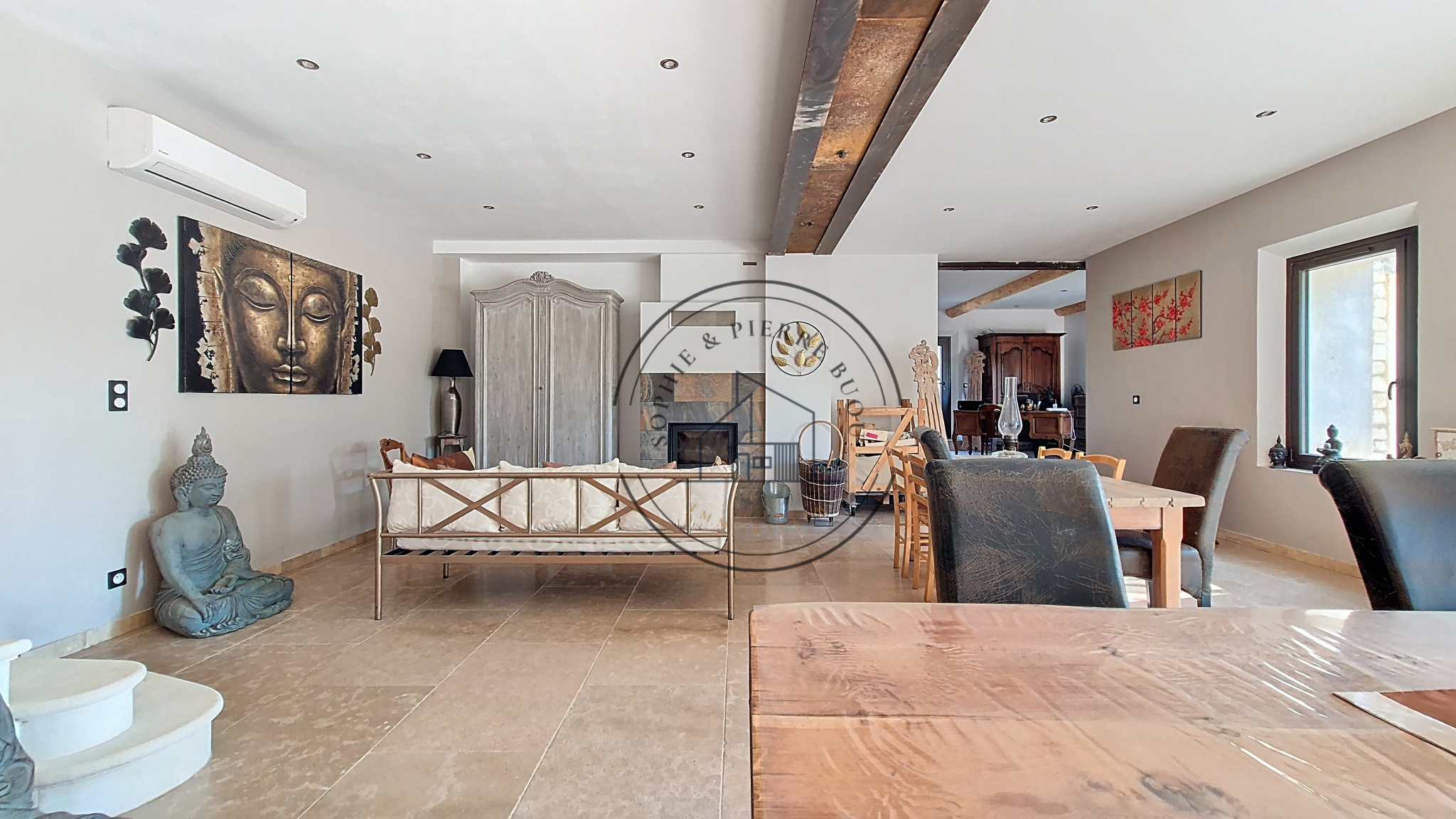 Les prestations sont au rendez-vous : climatisation réversible, menuiseries aluminium anthracite oscillo-battantes, isolation récente et finitions soignées, dans un esprit contemporain respectueux de l’authenticité de la pierre.