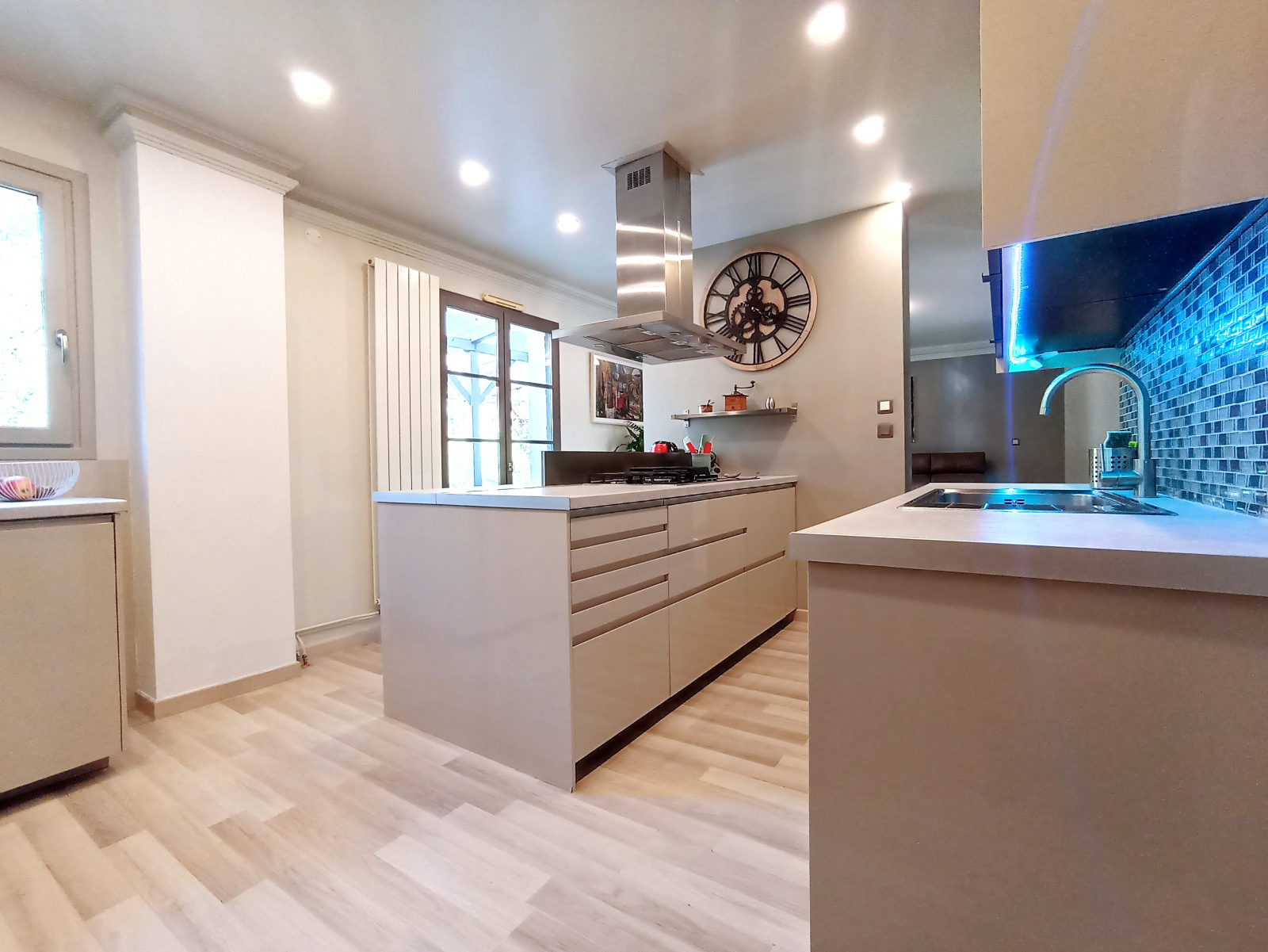 Une jolie cuisine à l'américaine, spacieuse et entièrement équipée, s’accompagne d’une buanderie attenante abritant une chaudière à gaz récemment installée.