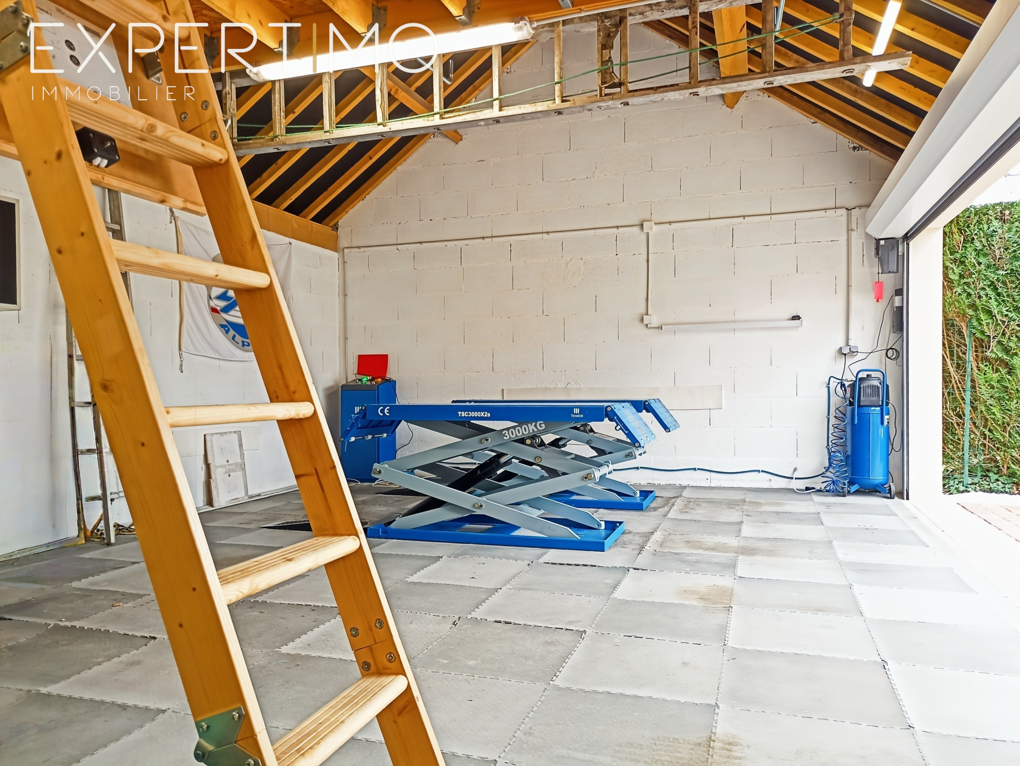 À l’extérieur, un double garage de 44 m² avec pont élévateur pour les amateurs de mécanique ainsi qu'une mezzanine offrent une belle capacité de stationnement et de stockage. Une allée sécurisée par un portail motorisé permet également d'accueillir jusqu’à cinq véhicules supplémentaires.