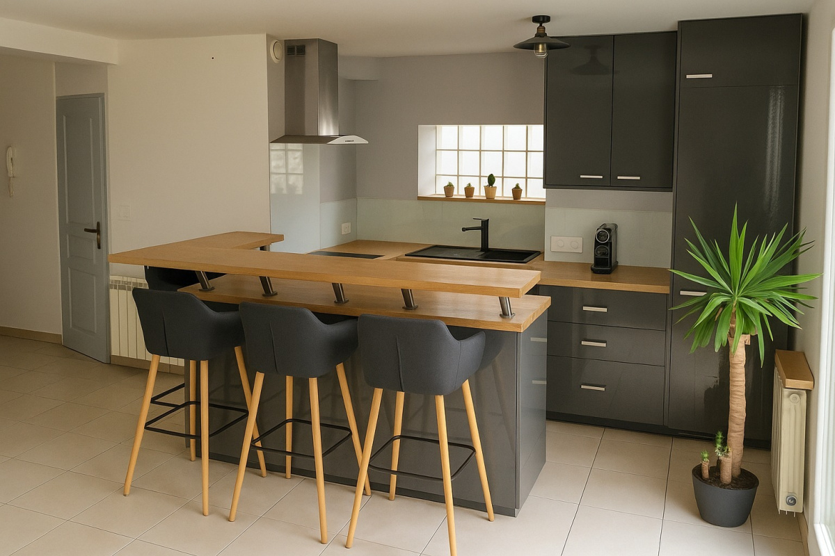 Pièce à vivre de 28,40?m² avec cuisine ouverte équipée (plaque vitrocéramique, hotte, four, réfrigérateur-congélateur)