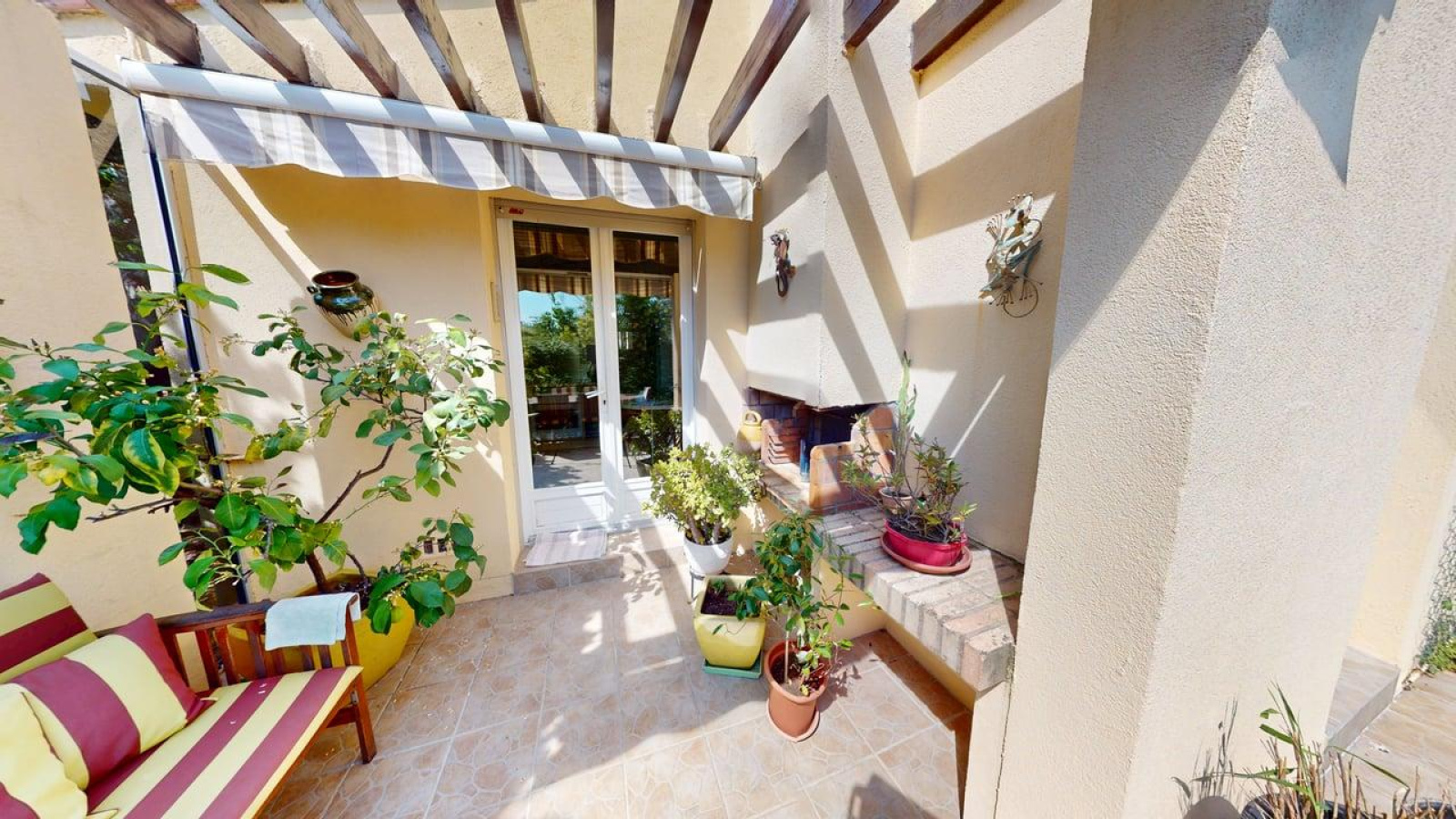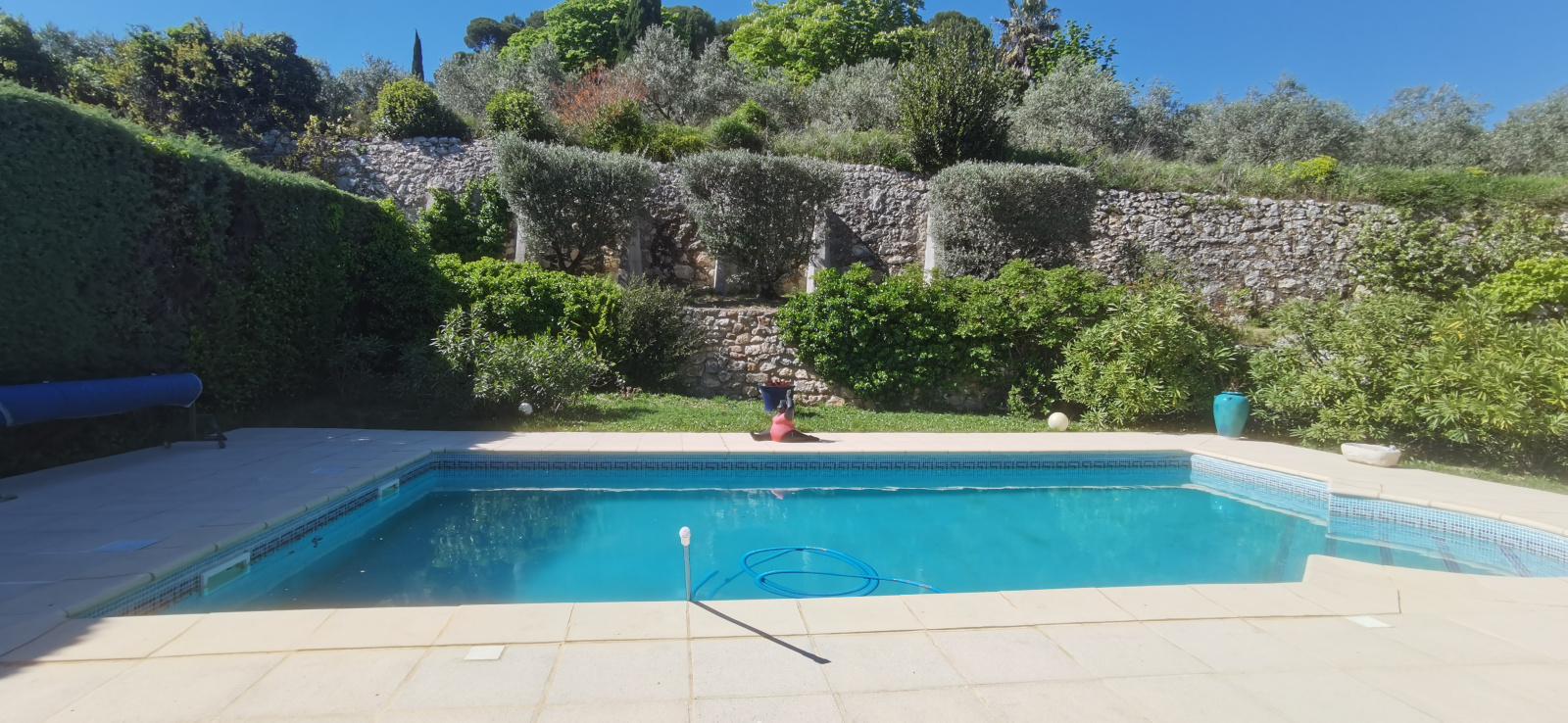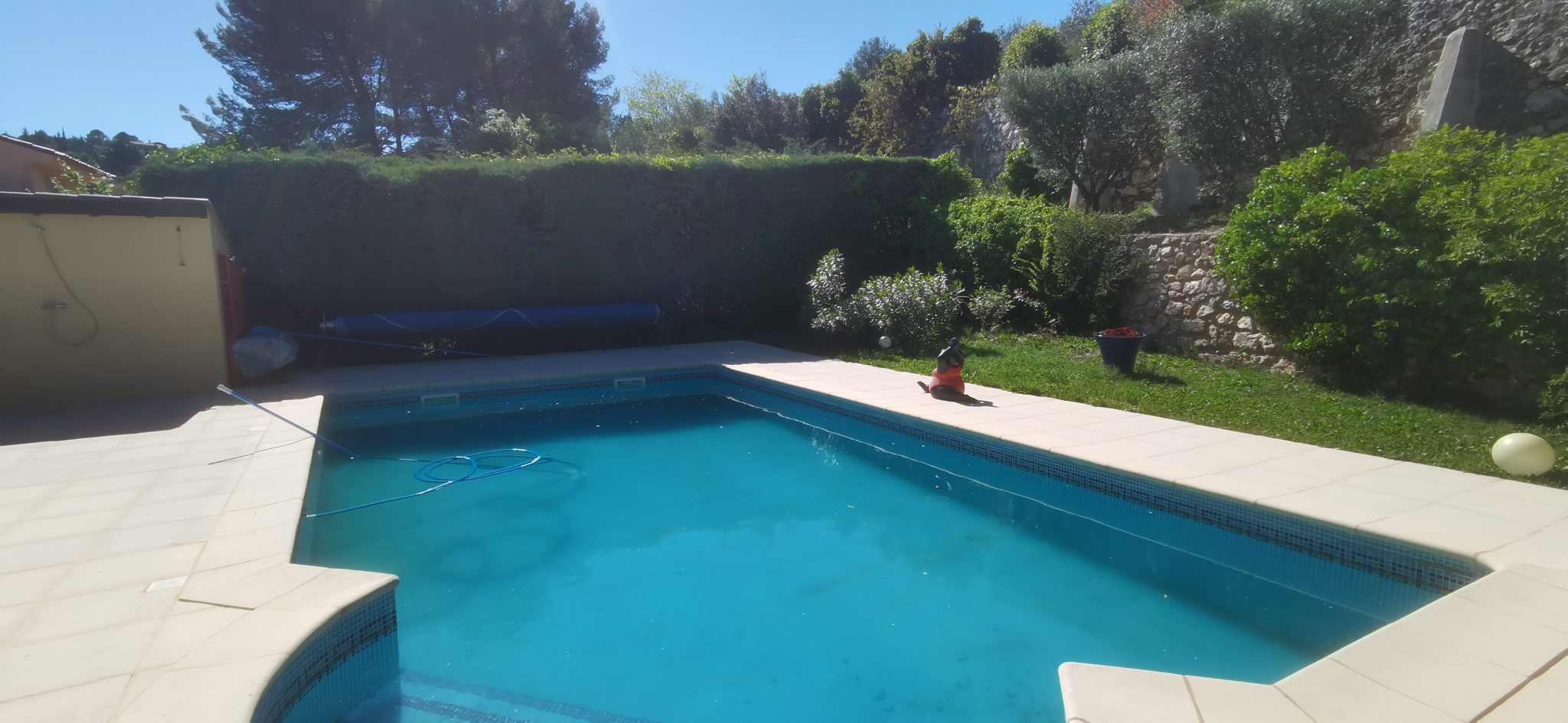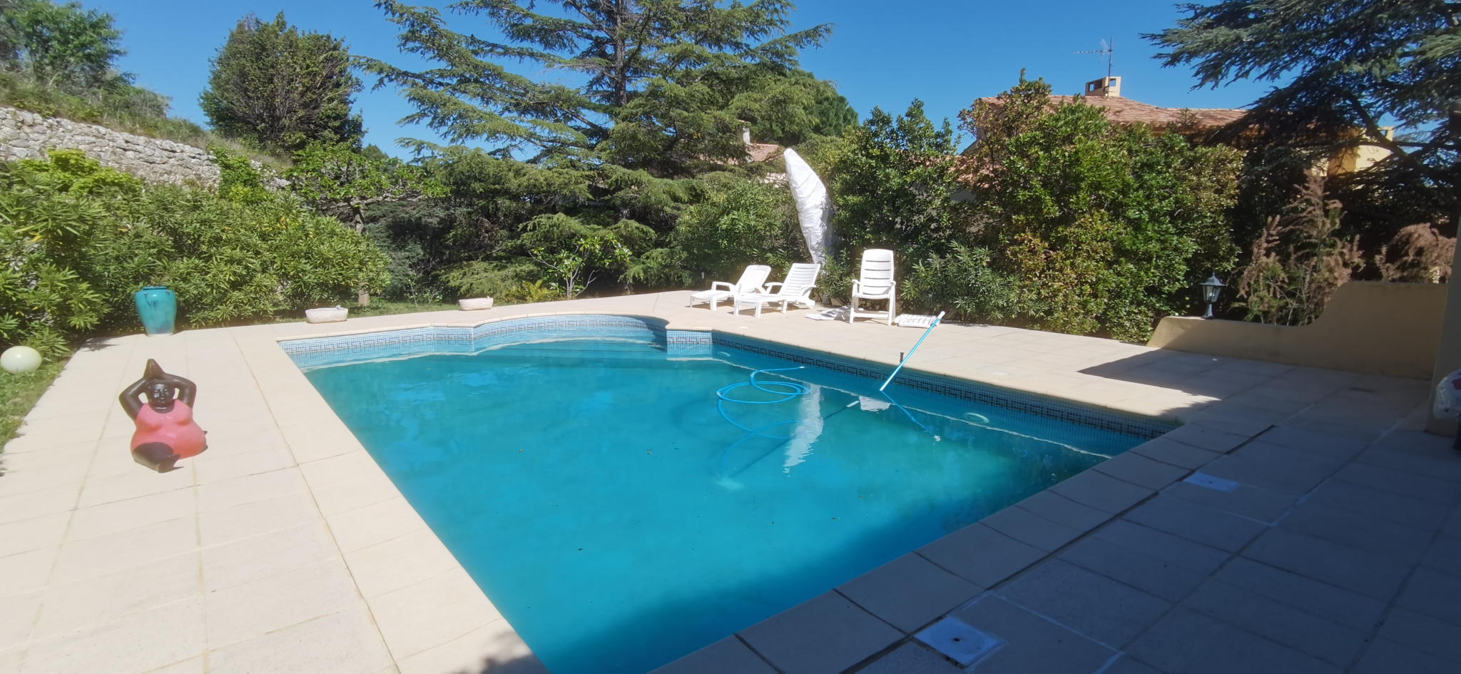 L'espace extérieur est une invitation à la détente. Aucun vis à vis, de beaux arbres, des fleurs... Une grande piscine pour les moments de fraicheur.