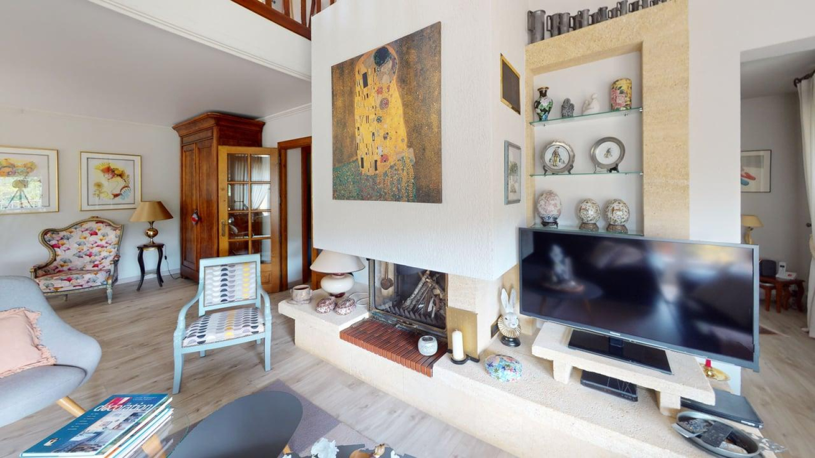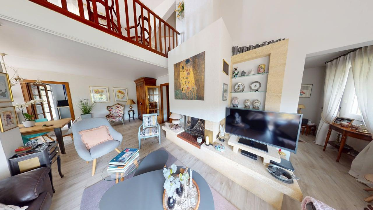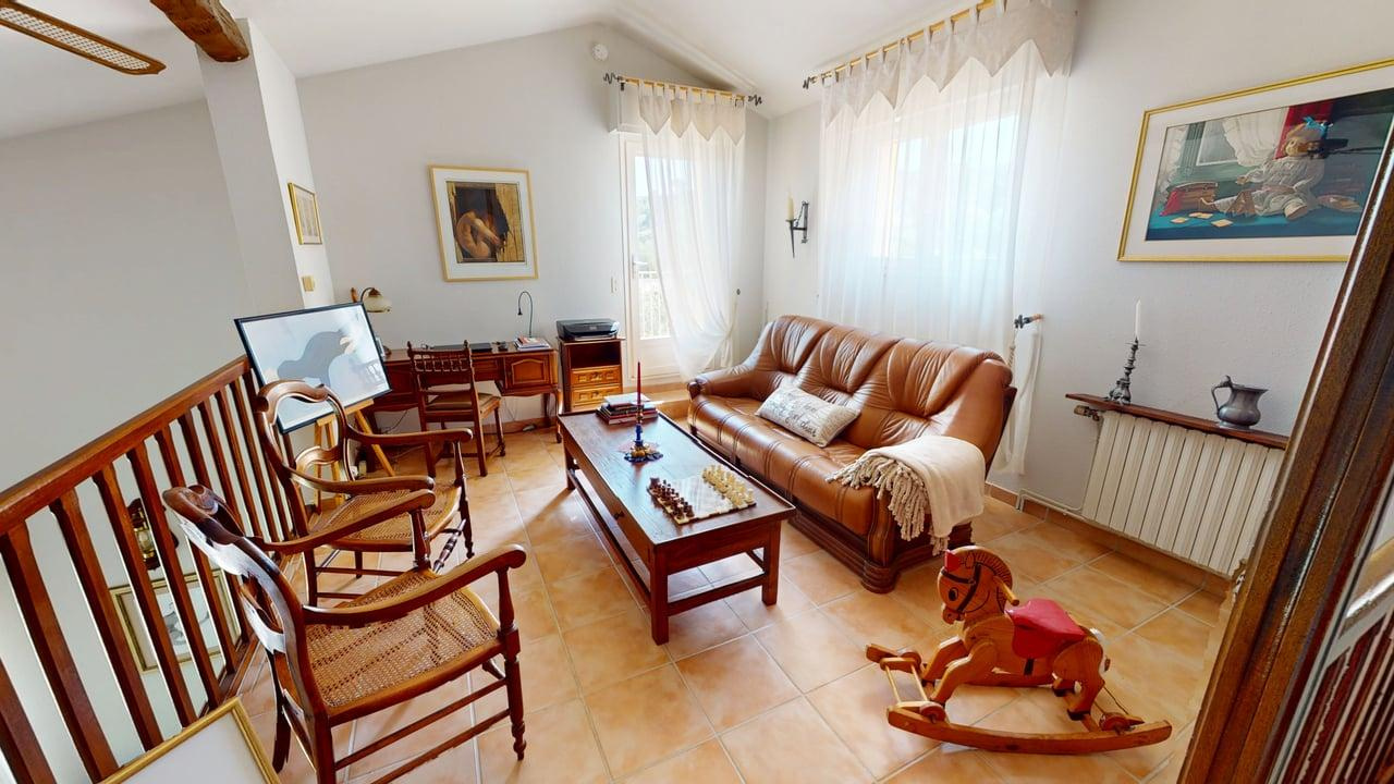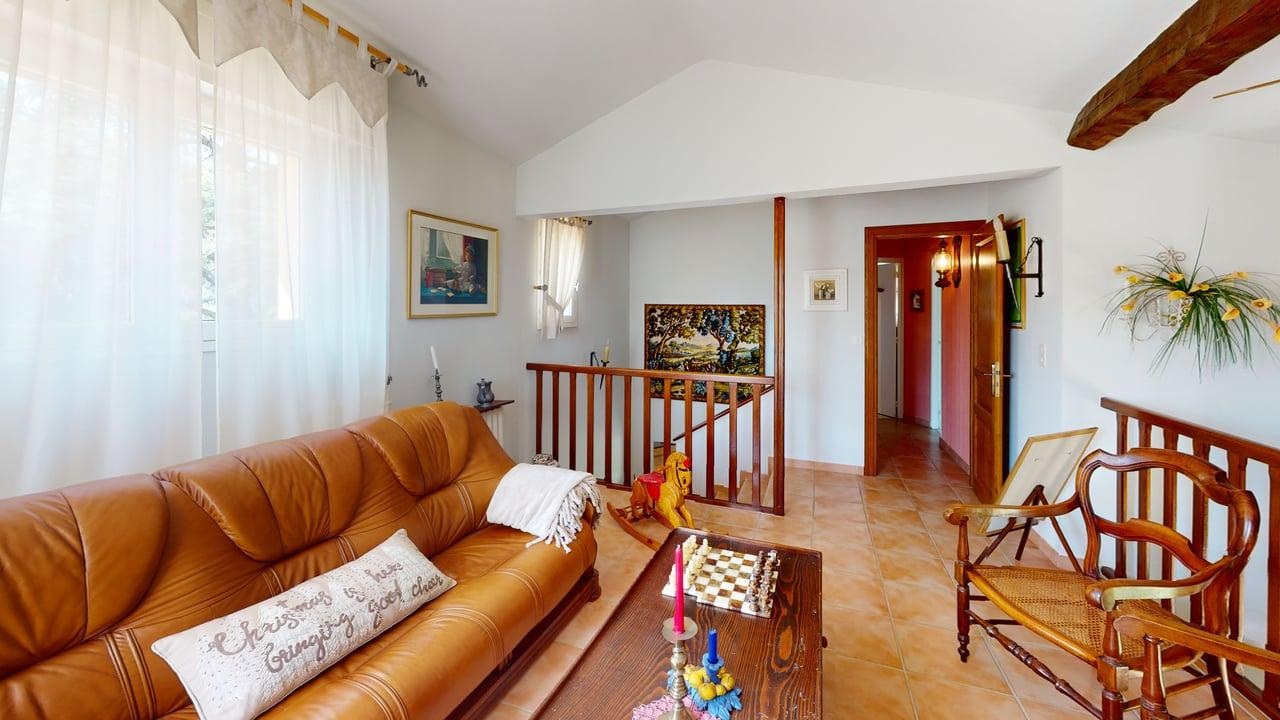 Le second niveau mène directement sur une grande mezzanine (vue sur l'espace salon). On y trouve également une chambre, une salle de bain avec douche et baignoire et l'accès au grenier.