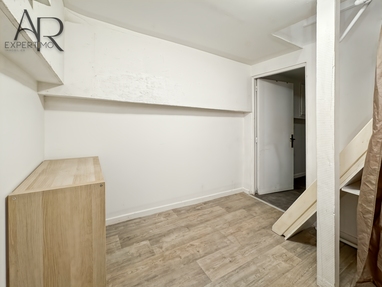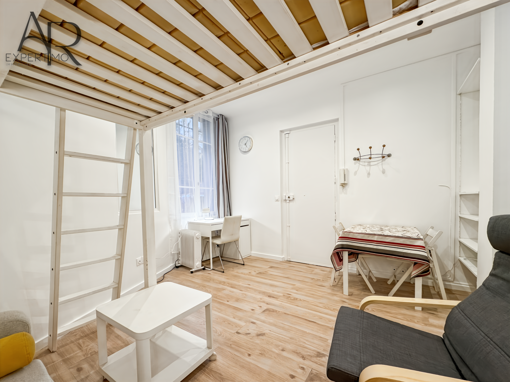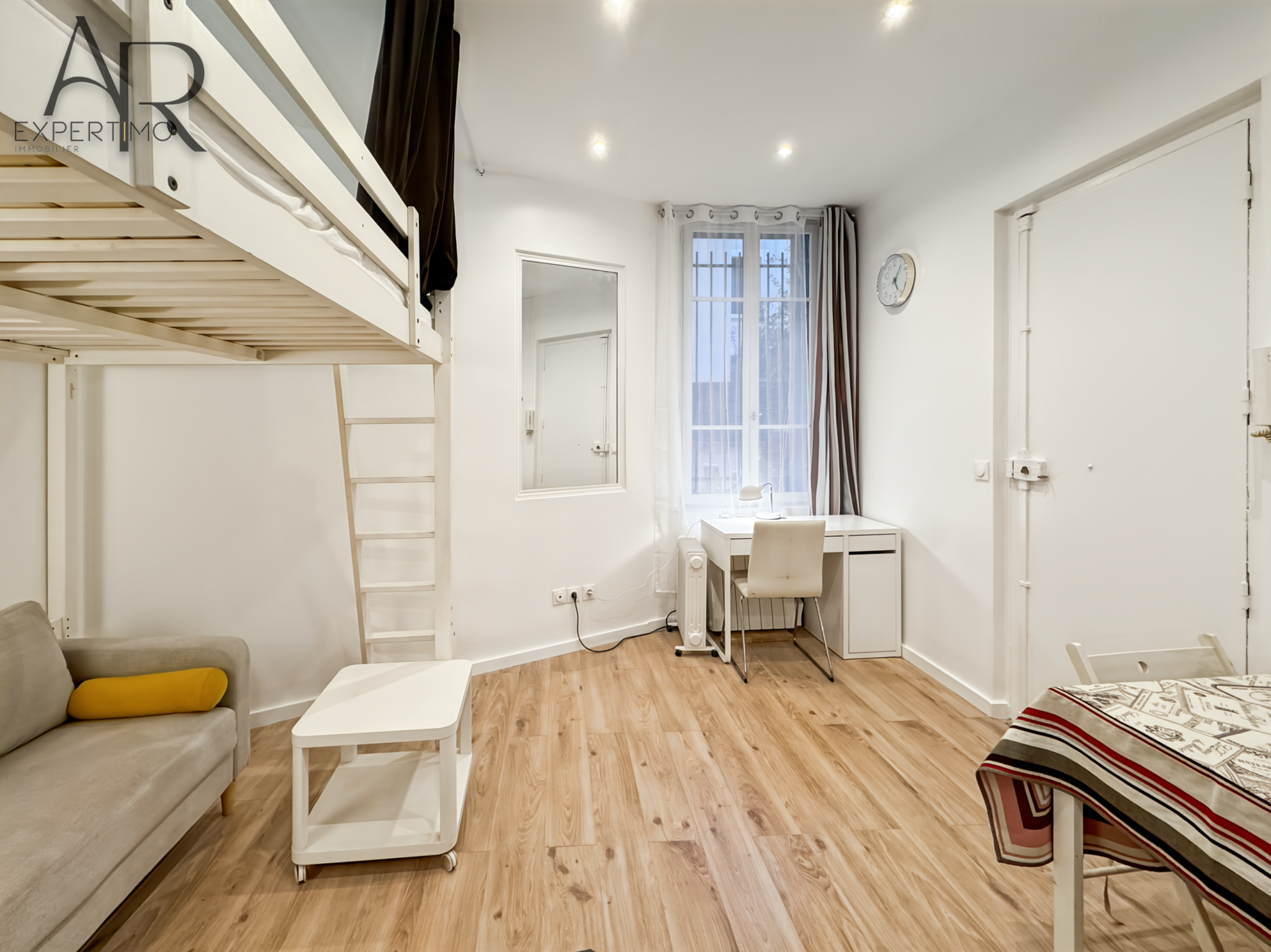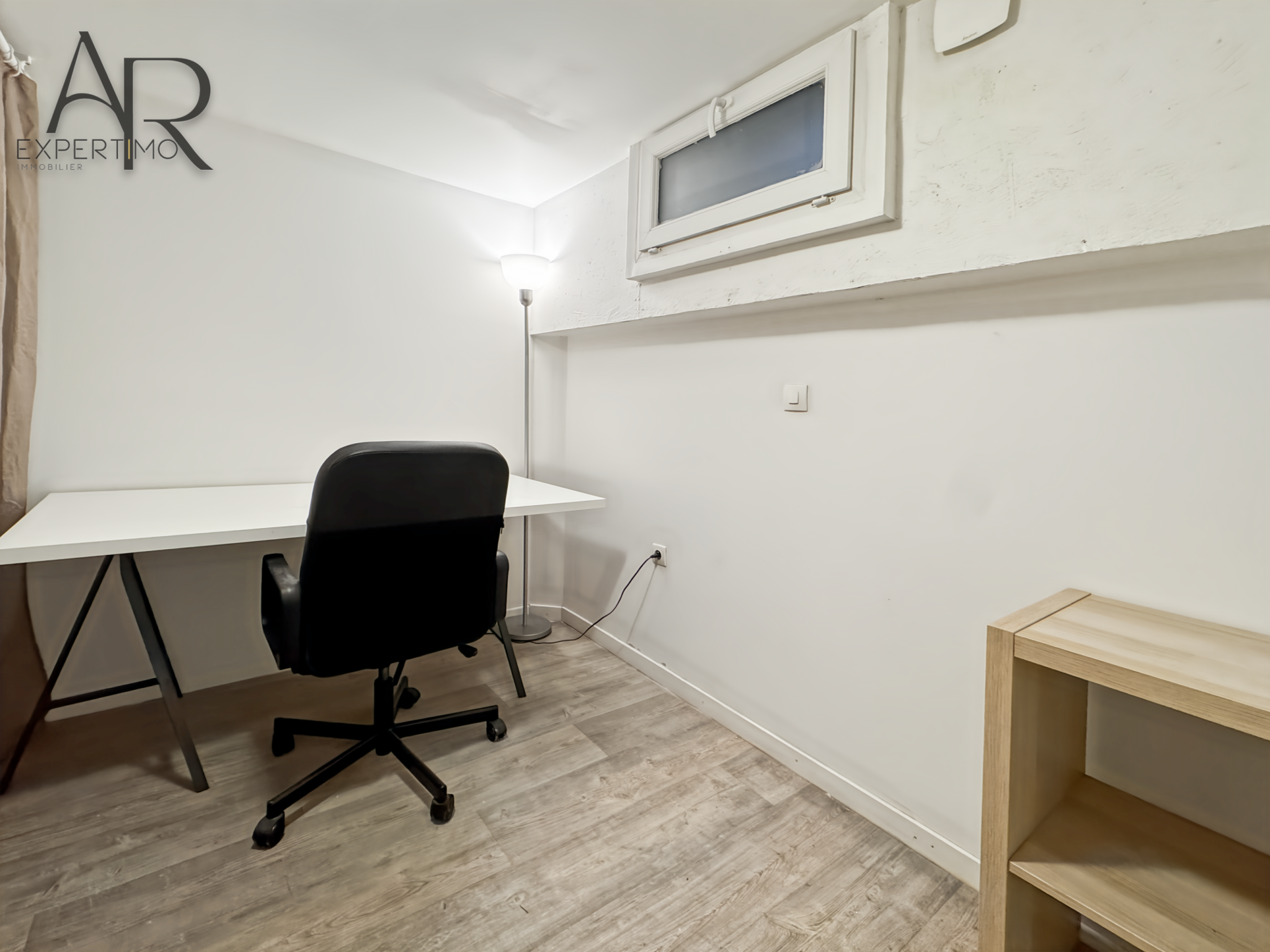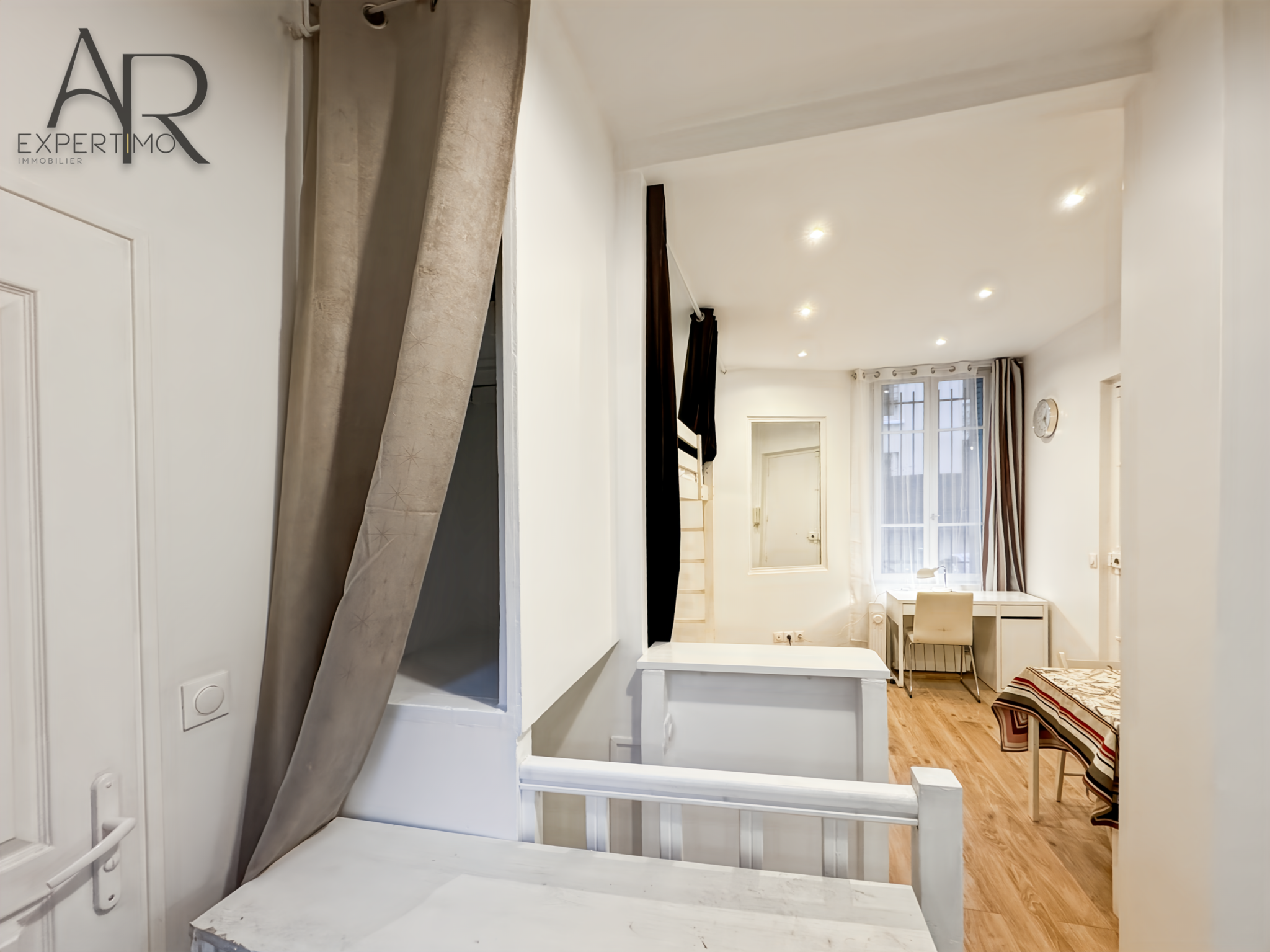 L'appartement se compose d’un agréable séjour lumineux avec une belle hauteur sous plafond, une cuisine toute équipée et ouverte, des placards de rangement, d’une mezzanine (possibilité de l'enlever), d'un bureau au sous-sol, d'une chambre, d’une salle d’eau avec WC.Â