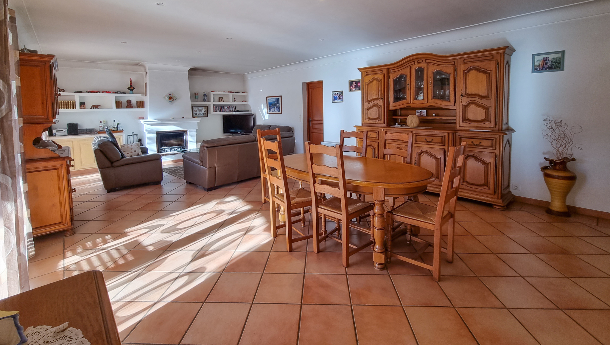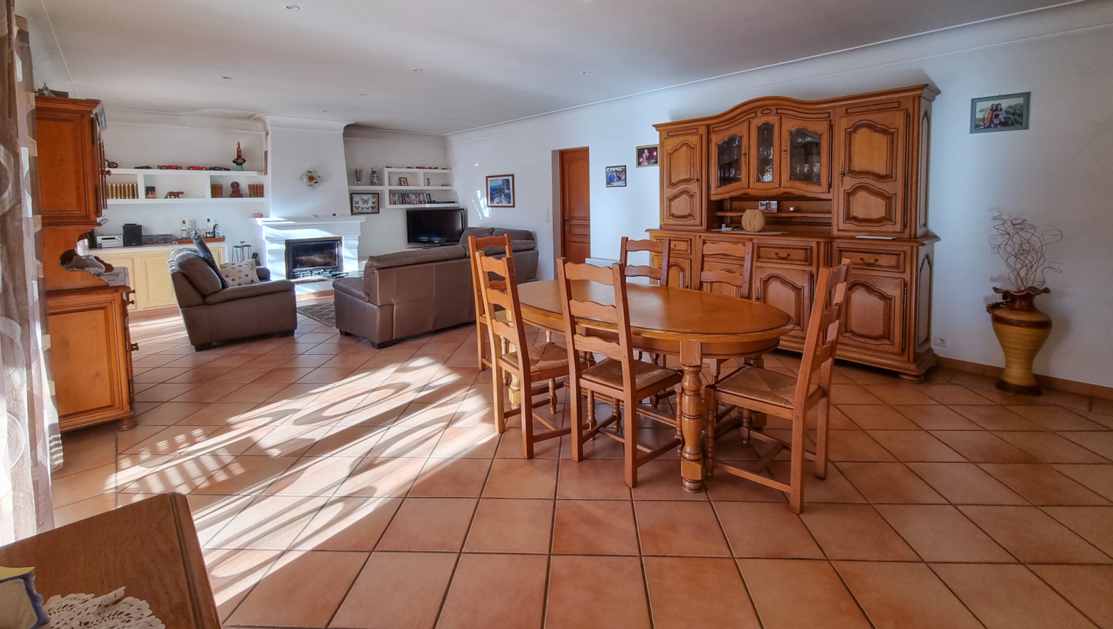 La maison dispose d’un garage avec accès directe à la maison, un vaste sous-sol, un parking pour quatre voitures et d’une piscine chauffée.