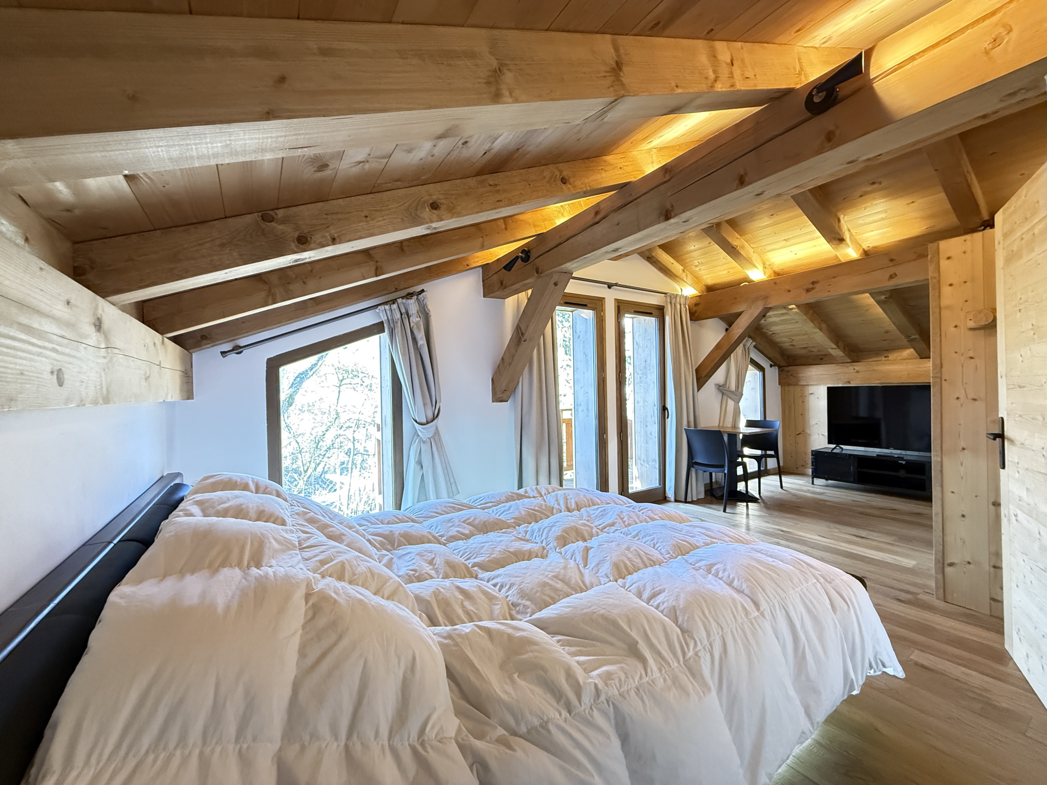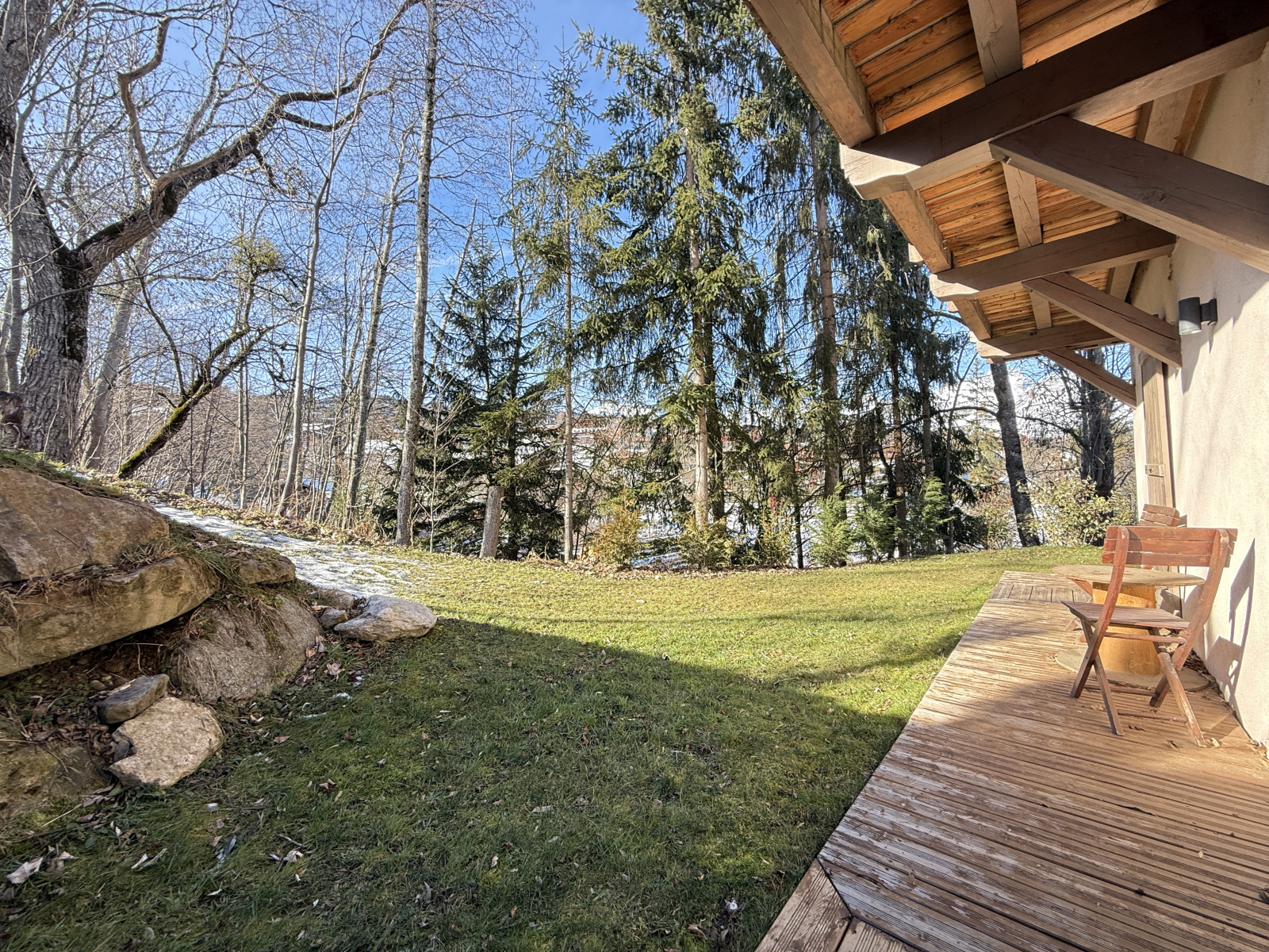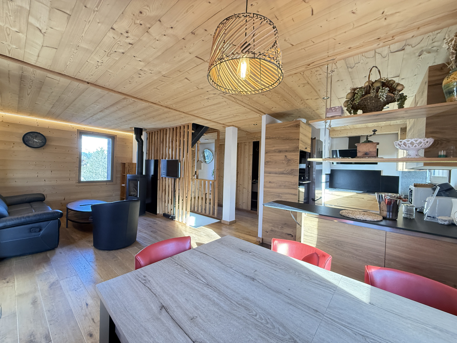 Dans un milieu naturel, sur une parcelle de 2431 m2, entouré d'un jardin, d'une vaste forêt et délimité par une rivière; ce Chalet Alpin datant de 2023 aux Normes RT 2012 est composé au niveau de l'entrée principale d'un petit hall deservant sur la droite des placards coulissants, un joli escalier pour les accès aux niveaux rez-de-jardin et dernier étage.