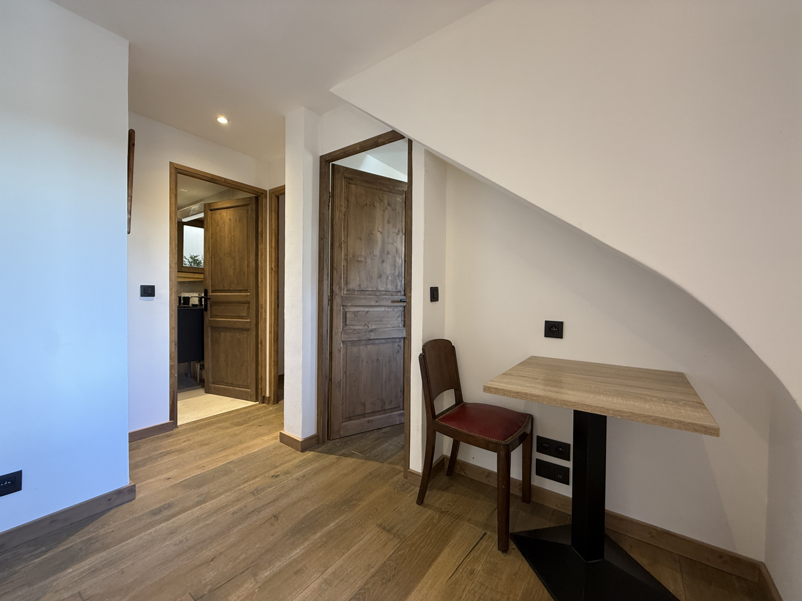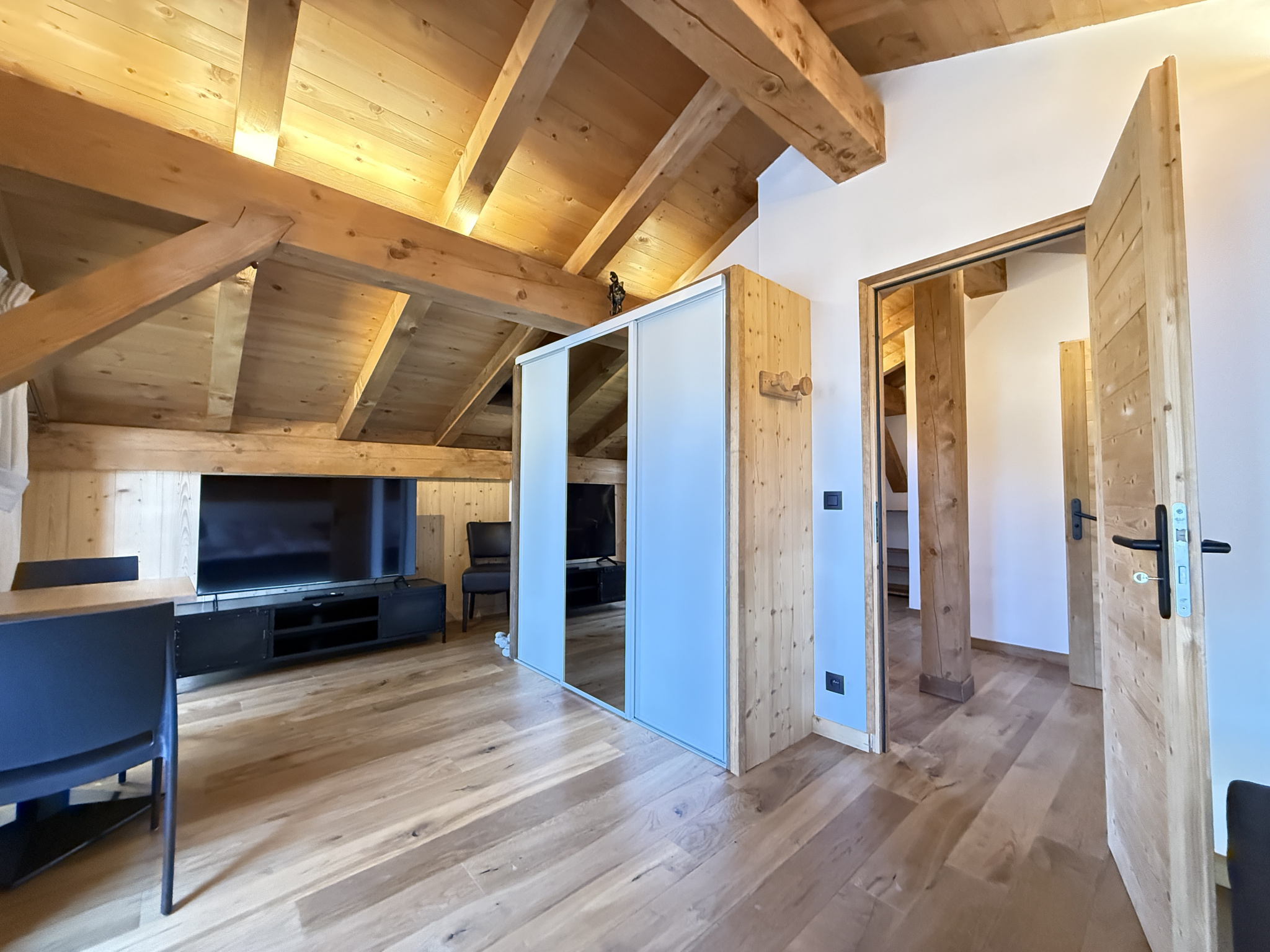 Au niveau du Dernier Etage sous Charpente : la chambre parentale de Maître très lumineuse avec de nombreux rangements, un accès au Balcon Sud par 2 porte-fenêtres et un coin Télé. Une belle salle de douche à l'italienne avec lavabo et toilettes. Un coin Bureau.
