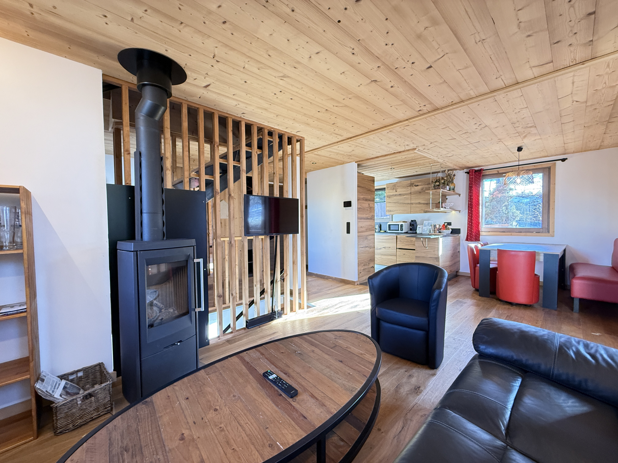 Au niveau du rez-de-chaussée : un séjour très lumineux avec coins salon (poêle) et repas, agrémenté d'une grande table, une cuisine ouverte et totalement équipée. Accès à un Balcon d'Angle orienté Sud-Ouest.