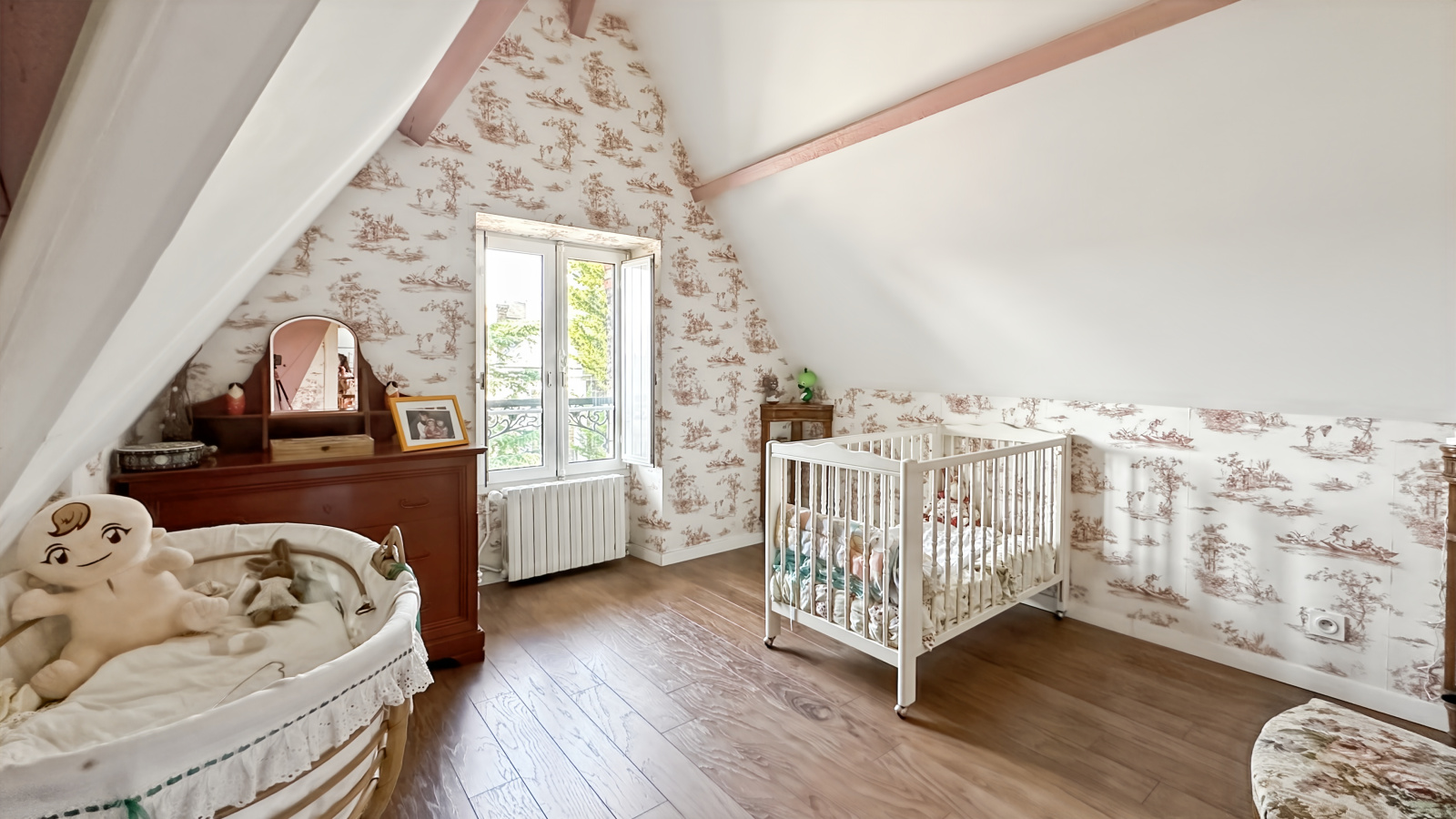 Le deuxième niveau vous réserve un étage parental intimiste, se distinguant par sa salle de bain avec douche moderne et baignoire d’époque, sa chambre parentale et une chambre d’enfant.