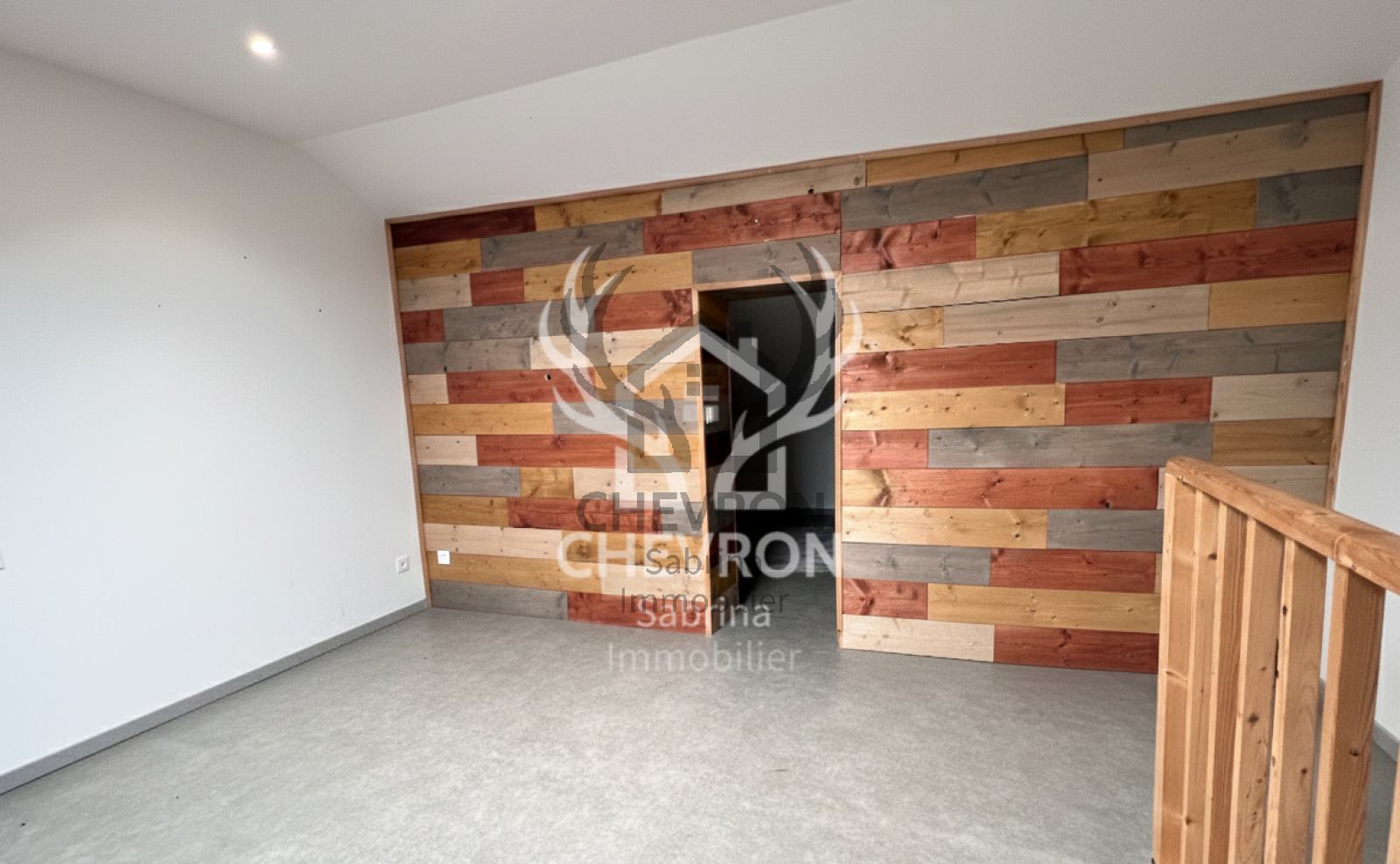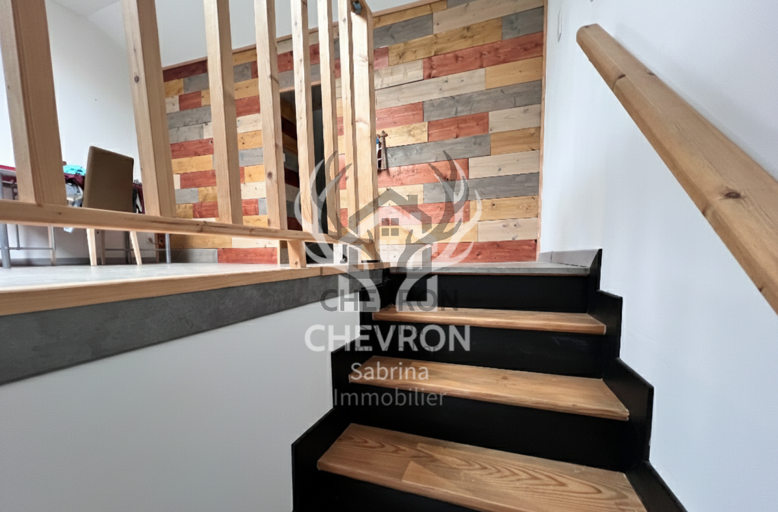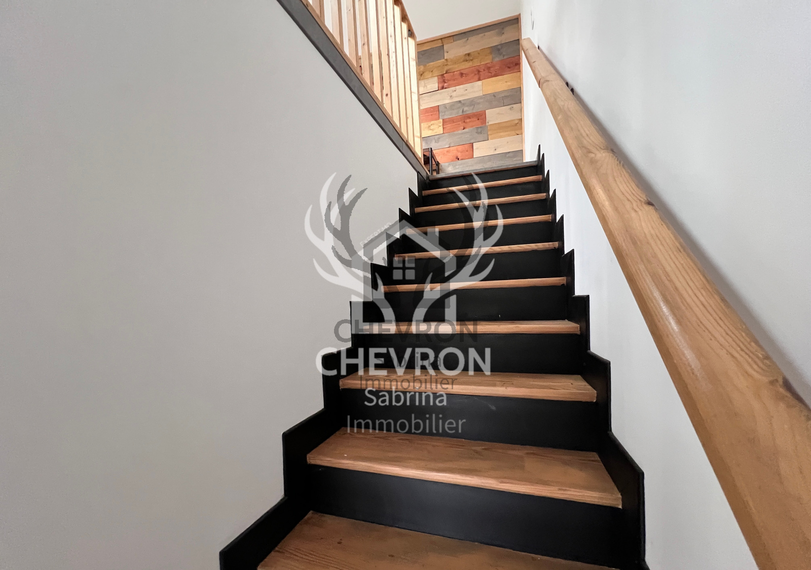 À l’étage, la maison révèle une pièce de vie spacieuse ouverte sur la cuisine, une chambre avec accès à la terrasse prolonge cet esprit cocooning, offrant un espace privilégié pour se détendre.