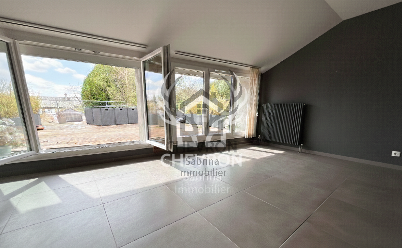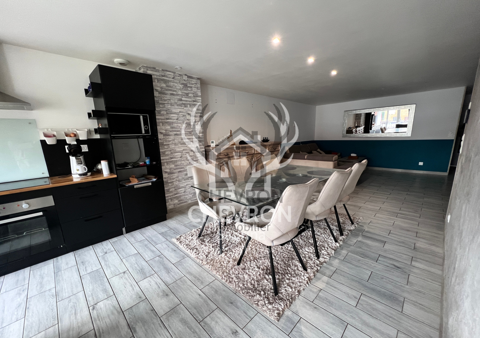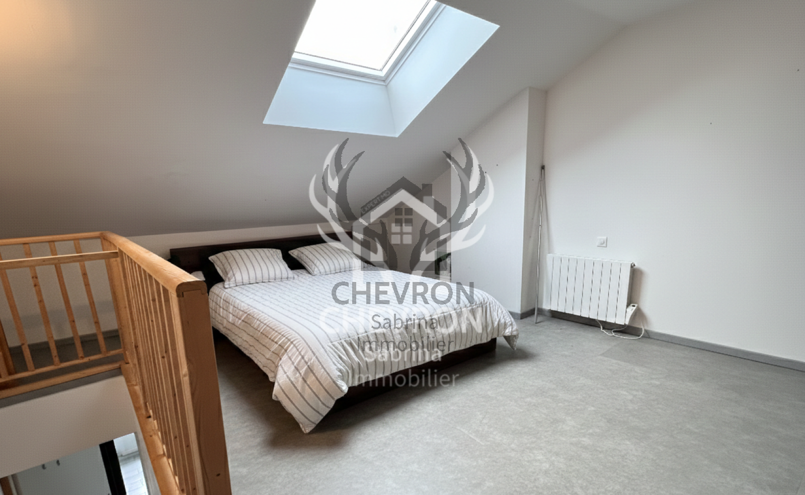 À l’étage, la maison révèle une pièce de vie spacieuse ouverte sur la cuisine, une chambre avec accès à la terrasse prolonge cet esprit cocooning, offrant un espace privilégié pour se détendre.