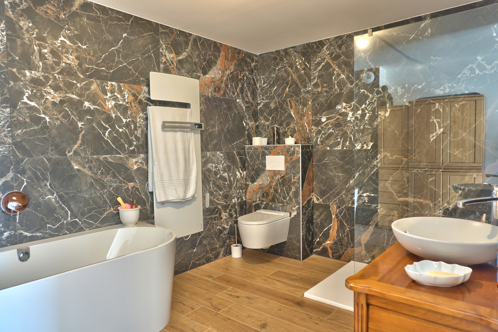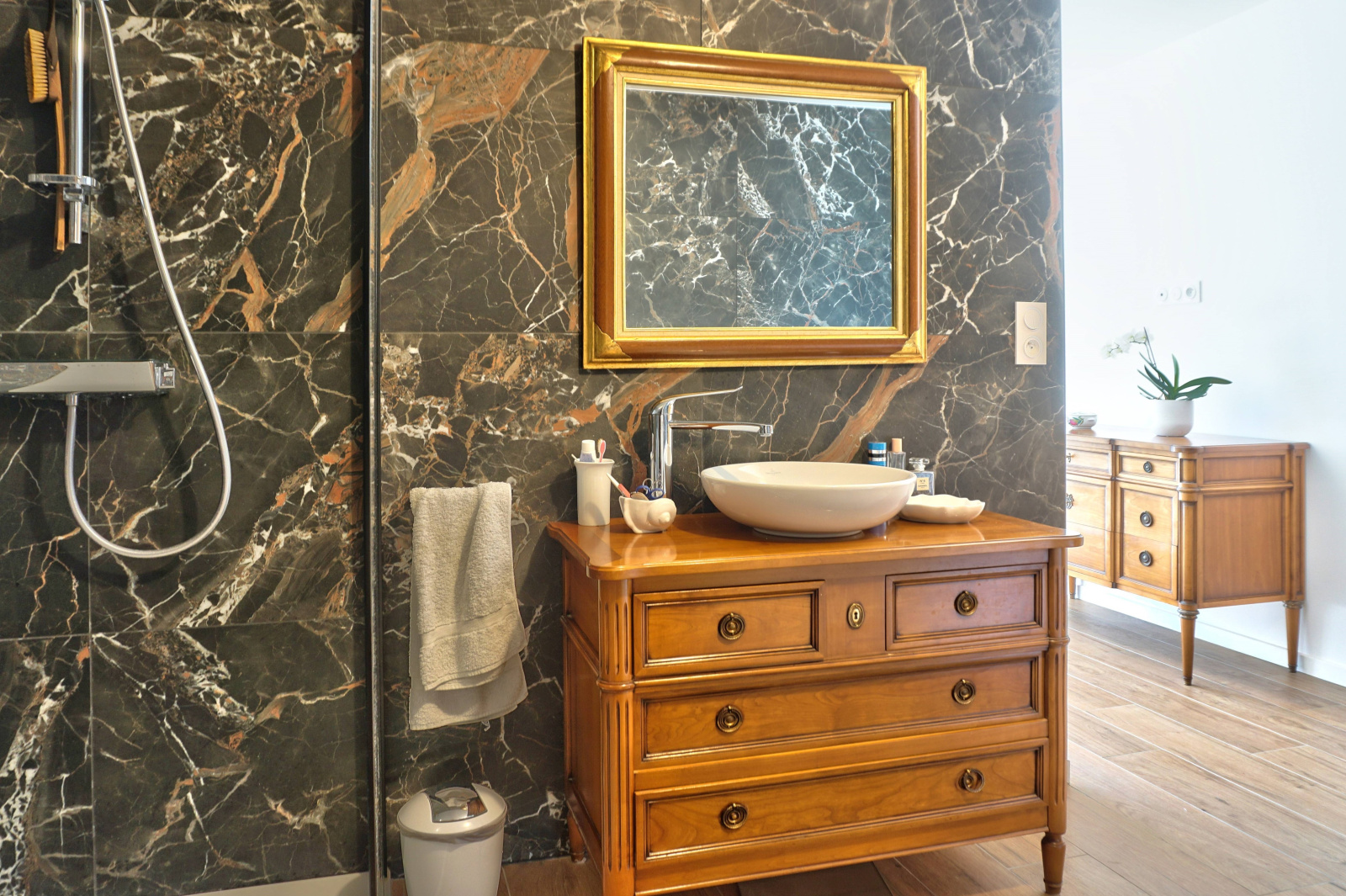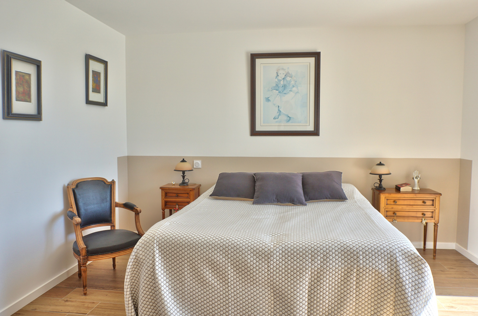 Deuxième étage : Palier desservant 2 chambres, chacune avec salle d’eau et WC privatifs.