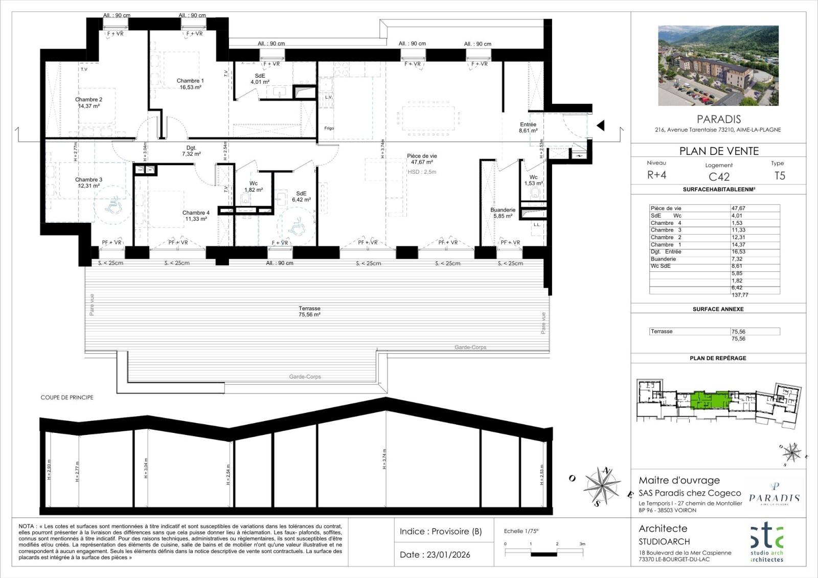 Superbe appartement rooftop de 137m2 situé au dernier étage d'une résidence neuve. Il se compose d'une entrée, wc, buanderie, 3 chambres, salle de bains avec wc,1 chambre parentale avec salle d'eau, belle pièce de vie lumineuse exposée plein sud avec une exceptionnelle terrasse de 75m2, idéale pour vos moments de détente et convivialité. Bien rare, alliant confort moderne et prestations de qualité. Vendu avec une cave. Possibilité d'acquérir un garage en sus.