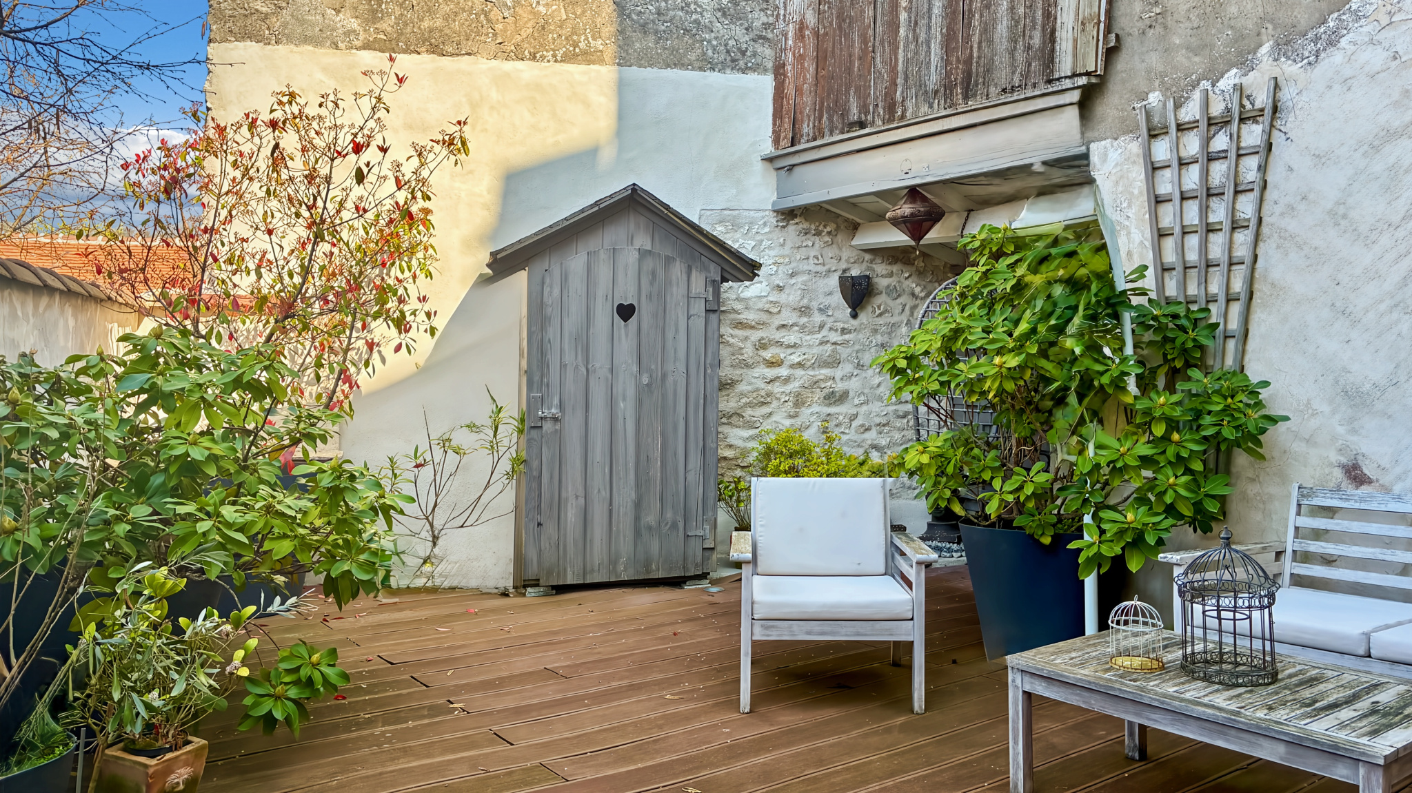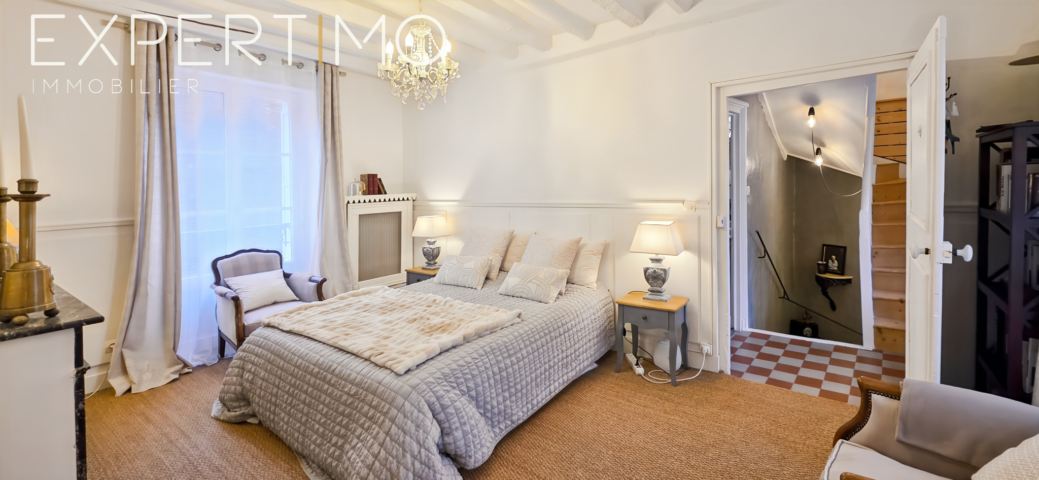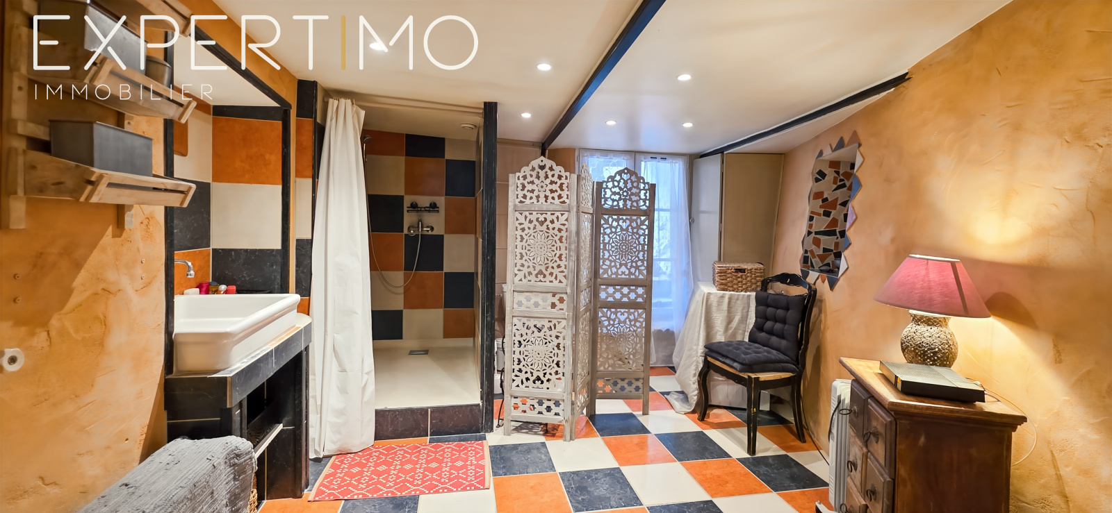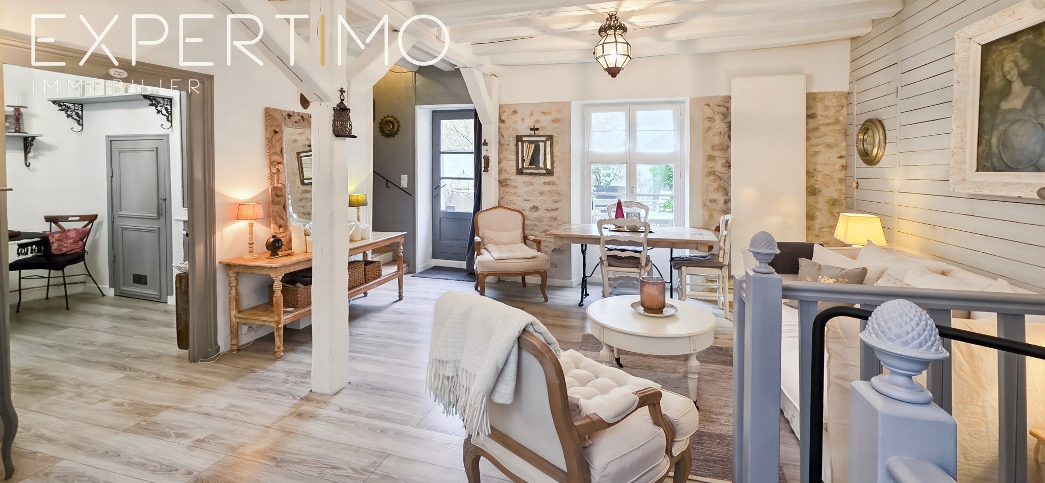La pièce de vie, réunissant salon et salle à manger, offre une lumière traversante, une atmosphère chaleureuse soulignée par des poutres apparentes. Dans son prolongement, une cour aménagée avec soin permet de profiter d’un extérieur intime, à l’abri des regards. La cuisine charmante et fonctionnelle, complète ce rez-de-chaussée.