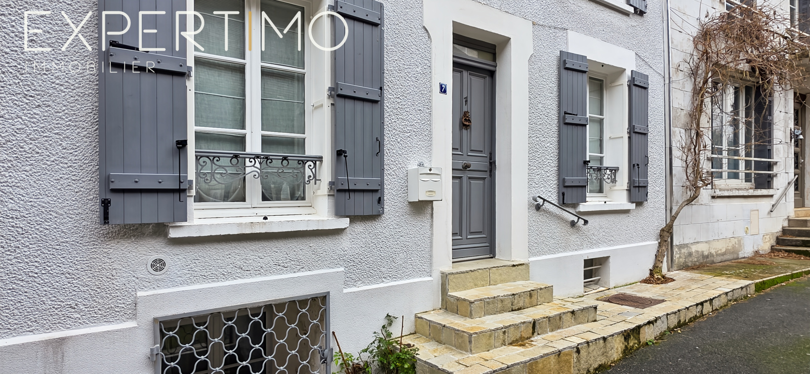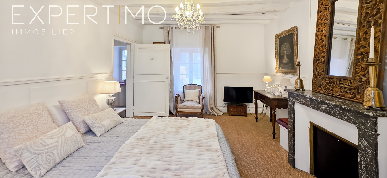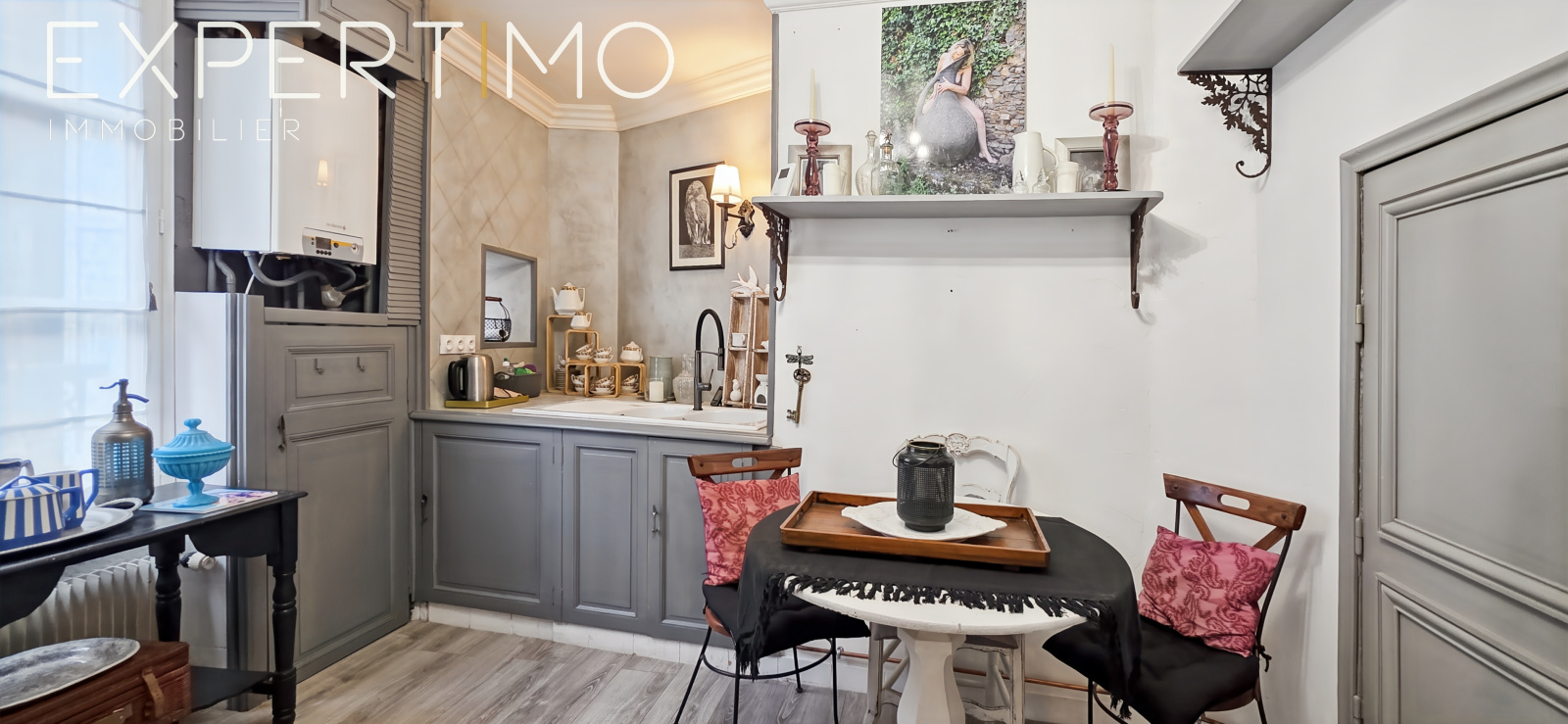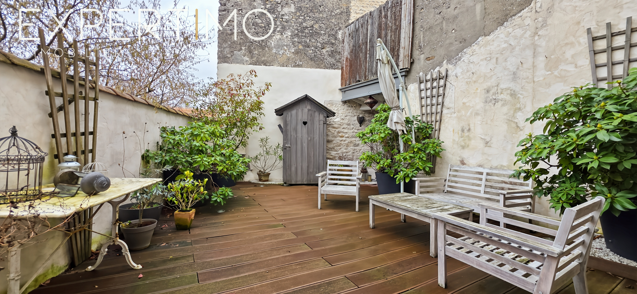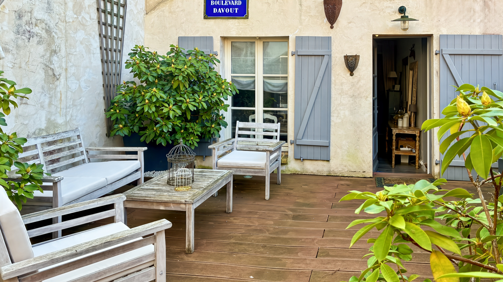 La pièce de vie, réunissant salon et salle à manger, offre une lumière traversante, une atmosphère chaleureuse soulignée par des poutres apparentes. Dans son prolongement, une cour aménagée avec soin permet de profiter d’un extérieur intime, à l’abri des regards. La cuisine charmante et fonctionnelle, complète ce rez-de-chaussée.