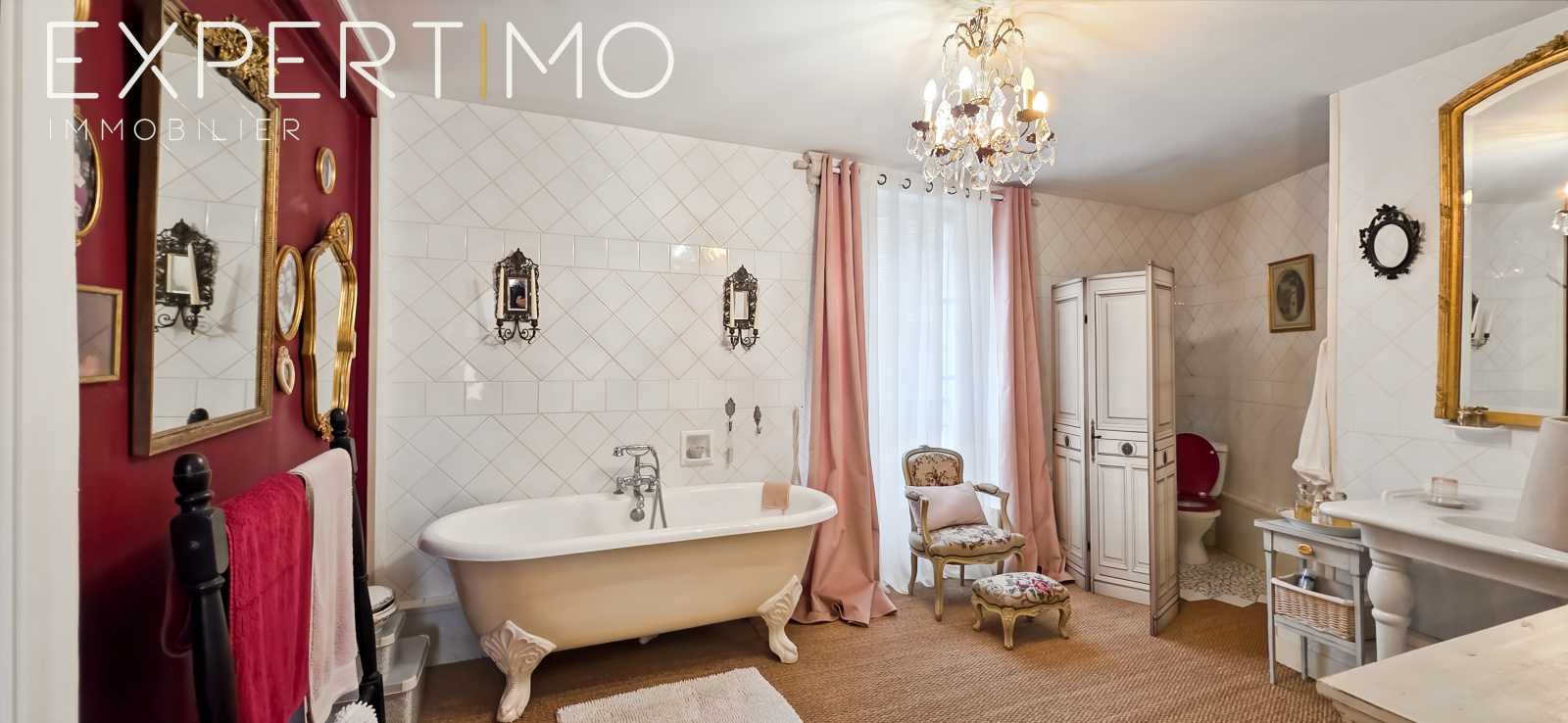 L’étage accueille l’espace nuit avec une chambre agrémentée d’une cheminée, ainsi qu’une salle de bains au style affirmé, équipée d’une baignoire sur pieds et complétée de toilettes.