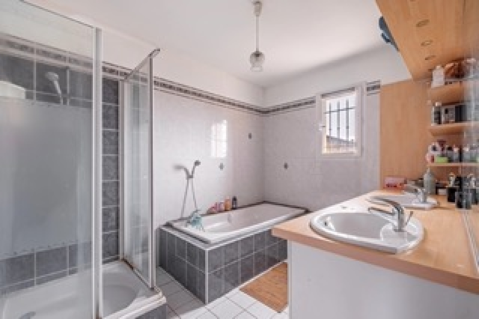 Le rez-de-chaussée comprend un sous-sol total aménagé avec grand garage, deux pièces supplémentaires et WC indépendant. À l’étage, un salon-salle à manger lumineux ouvre sur une vaste terrasse avec vue dégagée, accompagné d’une grande cuisine équipée, deux chambres avec placards, une salle d’eau avec douche et baignoire et WC séparé.