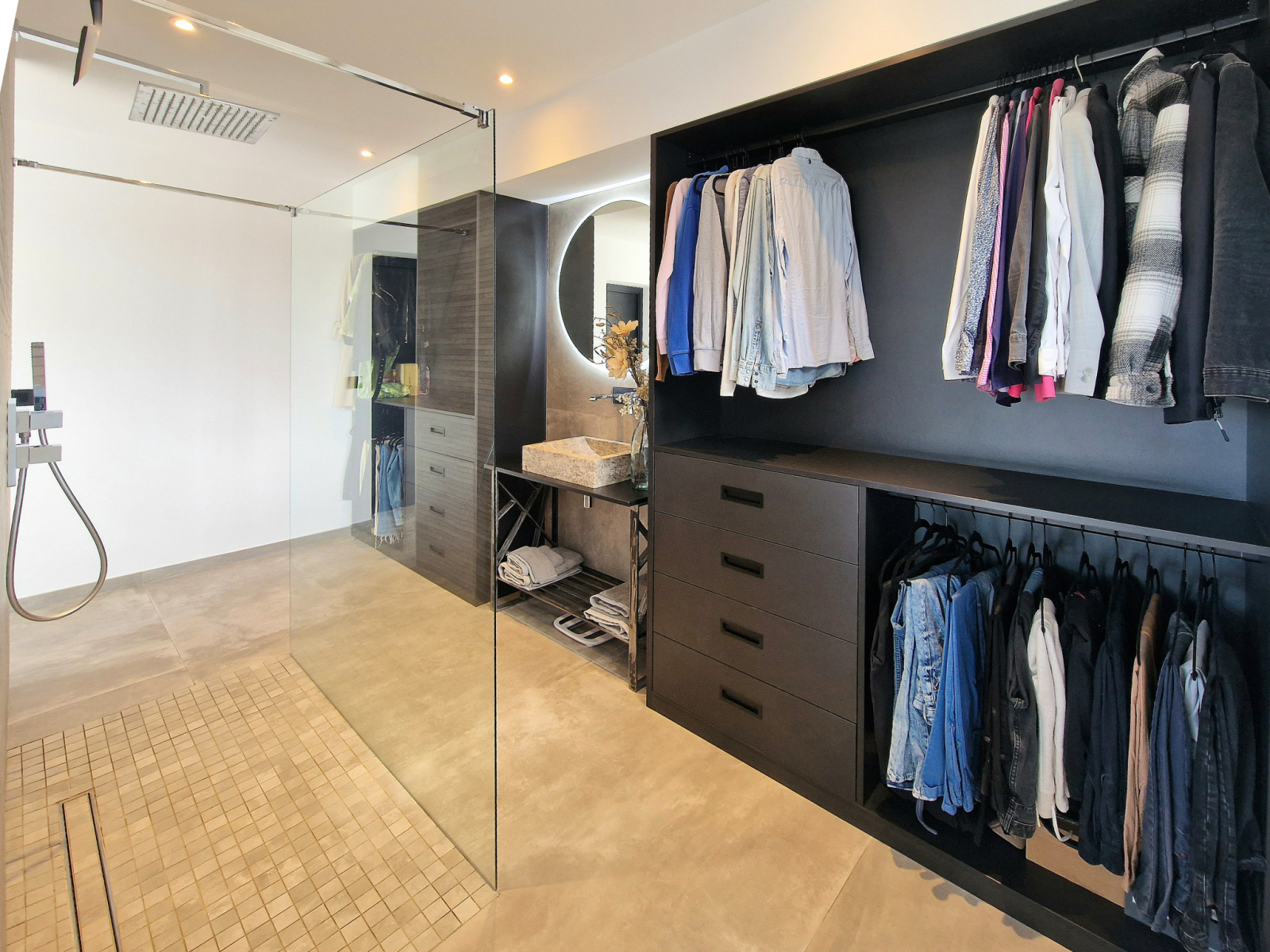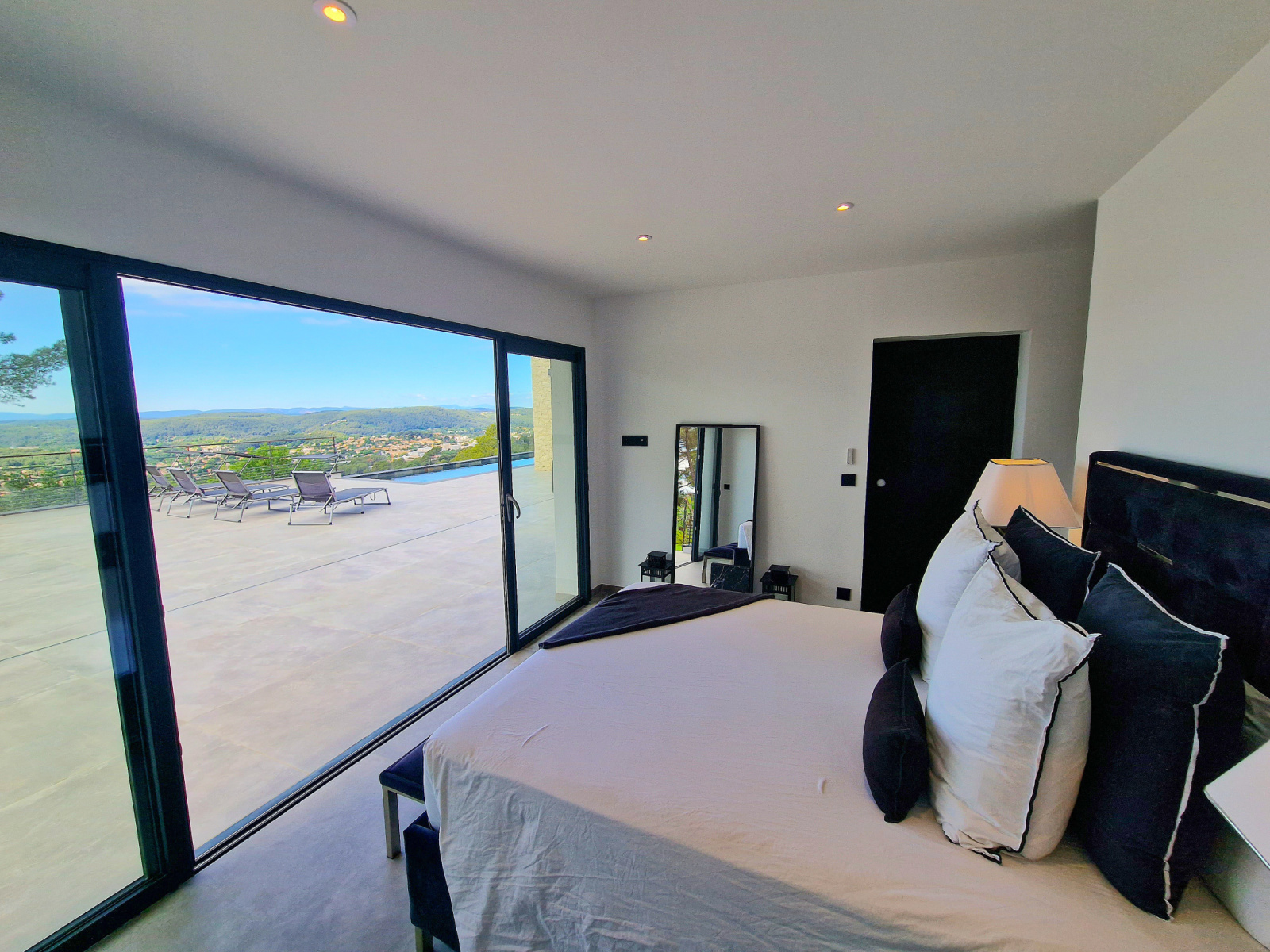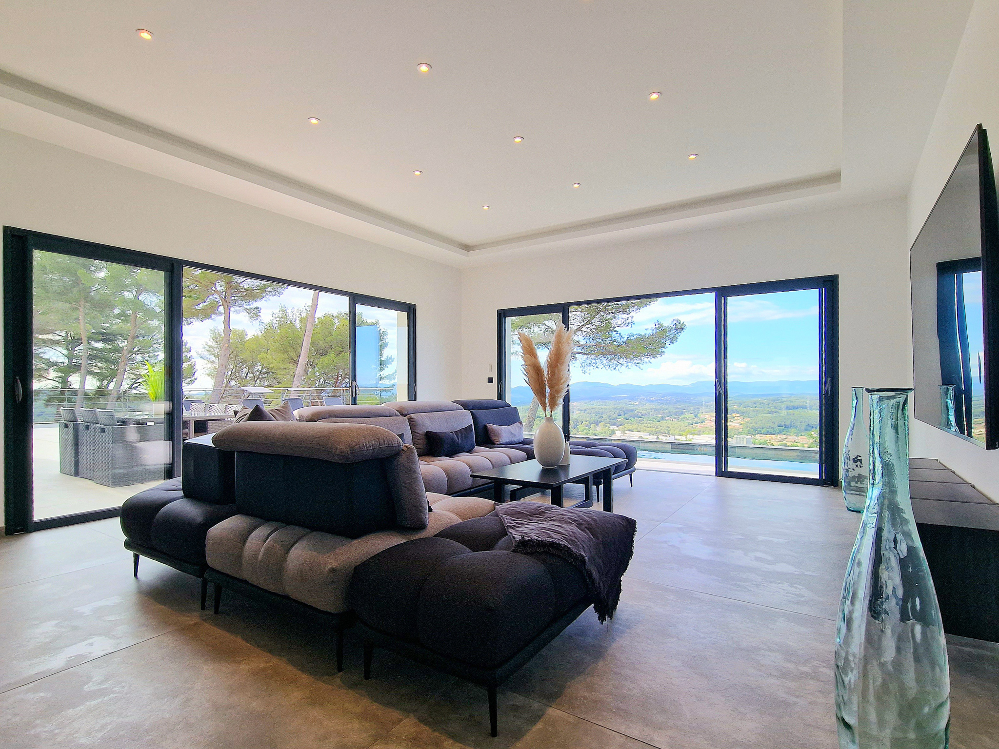 - Un vaste salon-salle à manger avec vue donnant sur une magnifique terrasse, une cuisine américaine avec arrière-cuisine, une suite avec salle de douches et dressing, un wc.