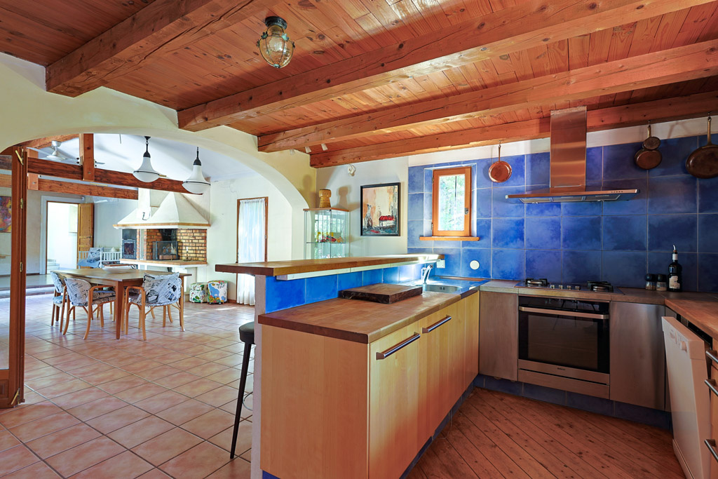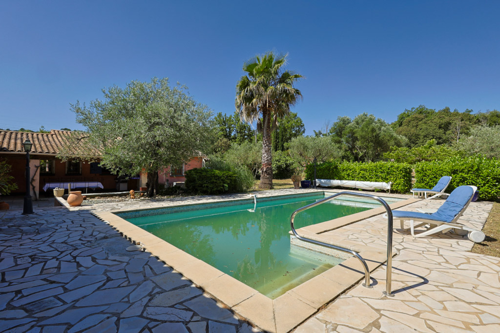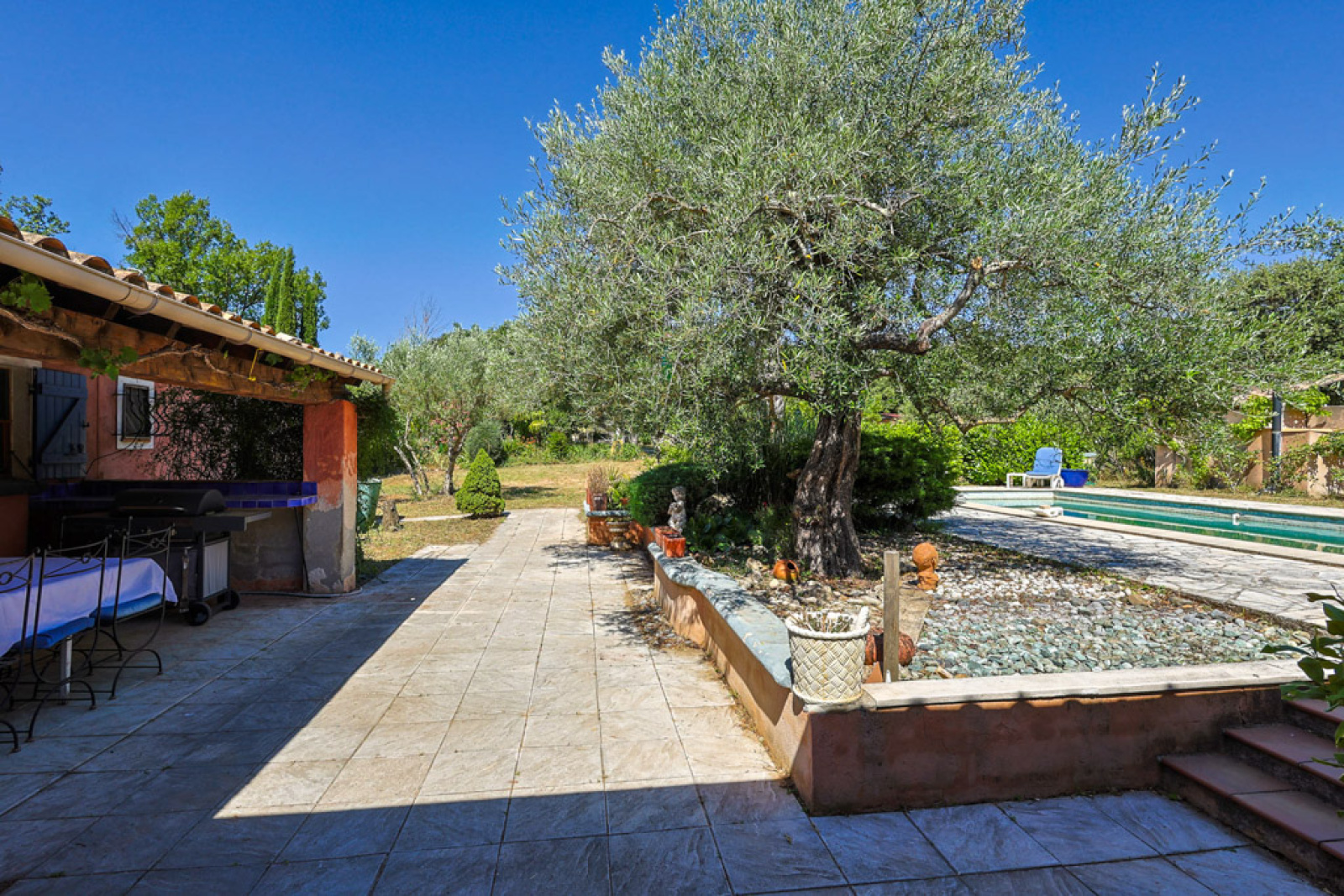 La piscine est entourée d'une terrasse en pierre avec beaucoup d'espace pour les chaises longues. Plus loin, une belle terrasse couverte avec suffisamment d'espace pour une grande table, idéale pour les repas en plein air avec la famille et les amis.